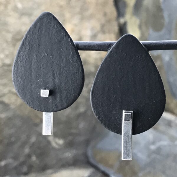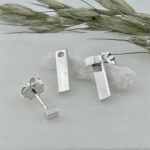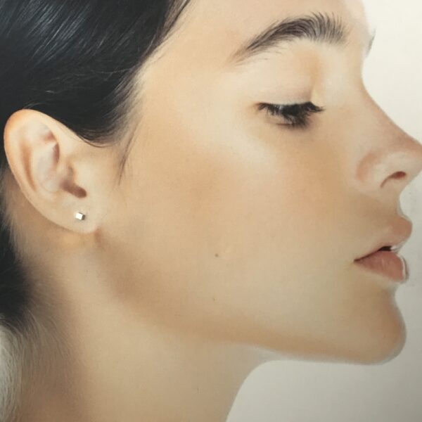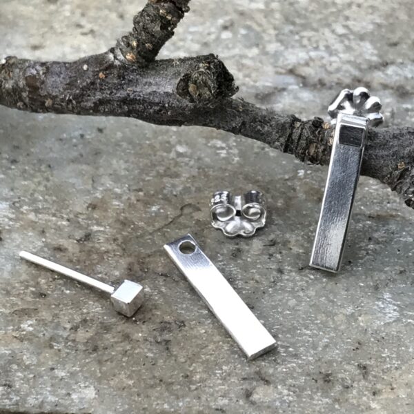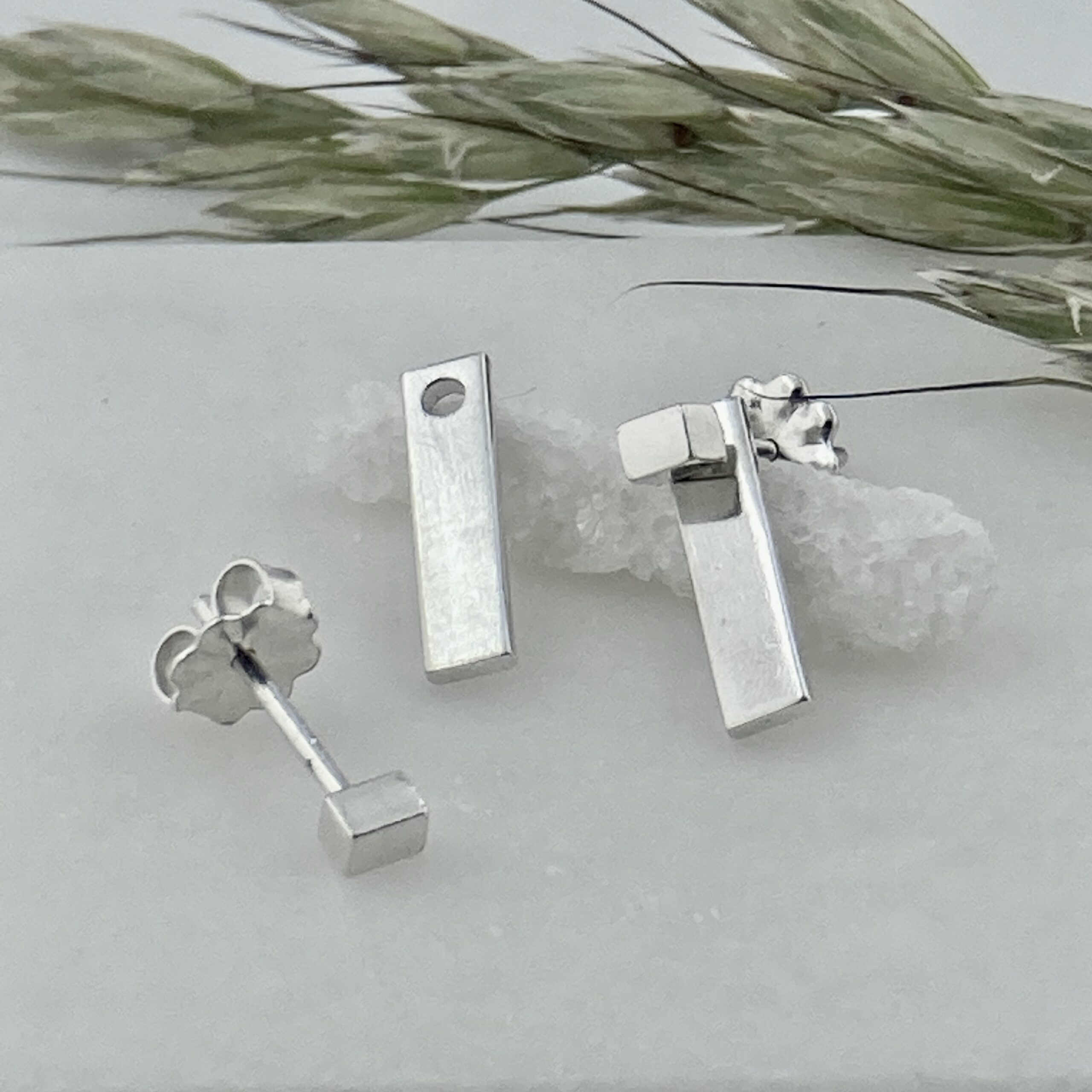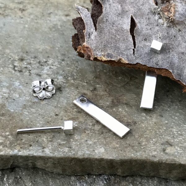 Earring jacket – a cube earring is the post with the thin silver bar as the jacket – a 3 piece earring with the Thin Bar as an option to wear in from or behind the earlobe. Solid Argentium silver.