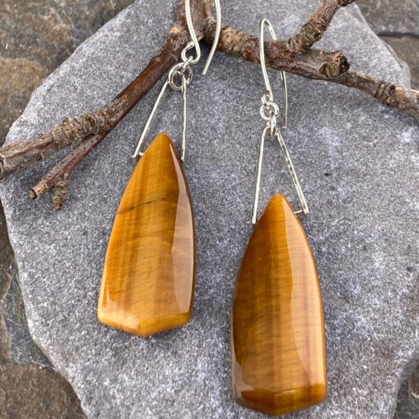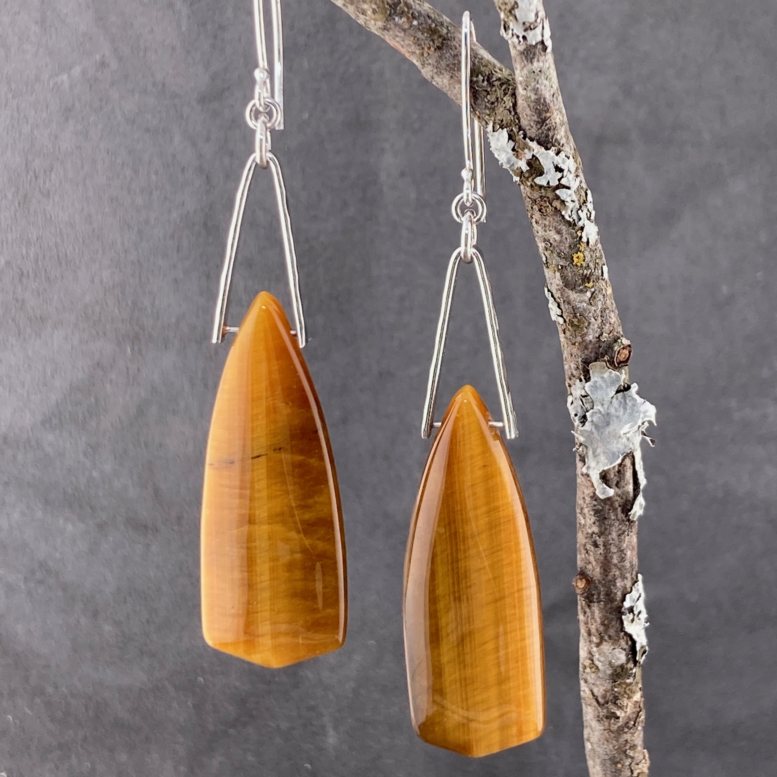 These large Tiger Eye stones are suspended on hand hammered Argentium silver V shaped bails
