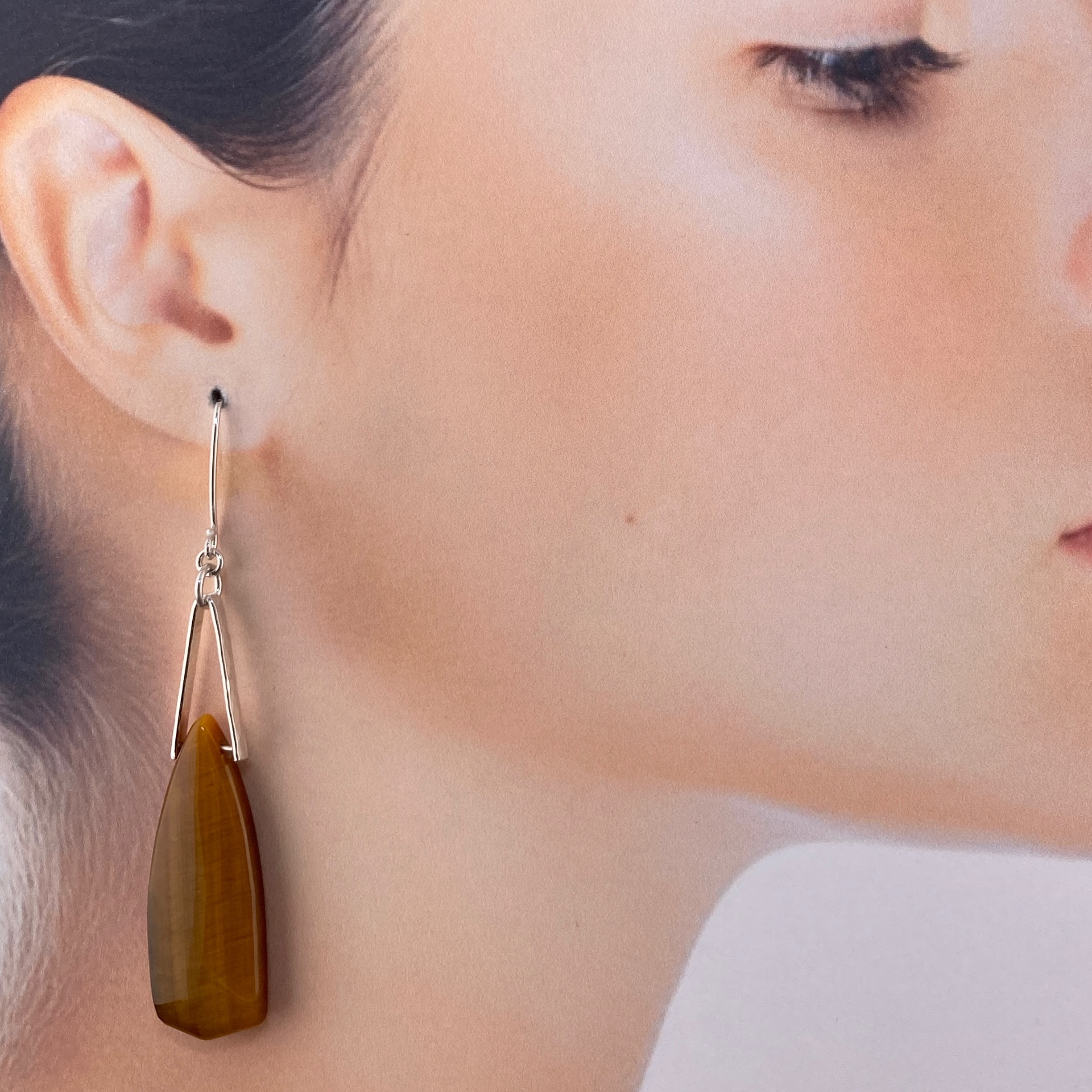 tiger eye earrings - V bail - Argentium silver - long - Image 2