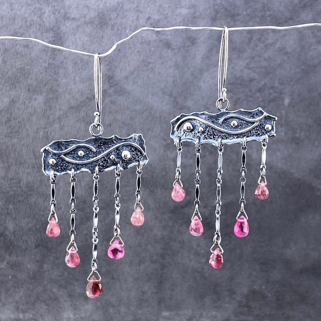 Pink Tourmaline teardrop accents on a water design, chandelier earring.