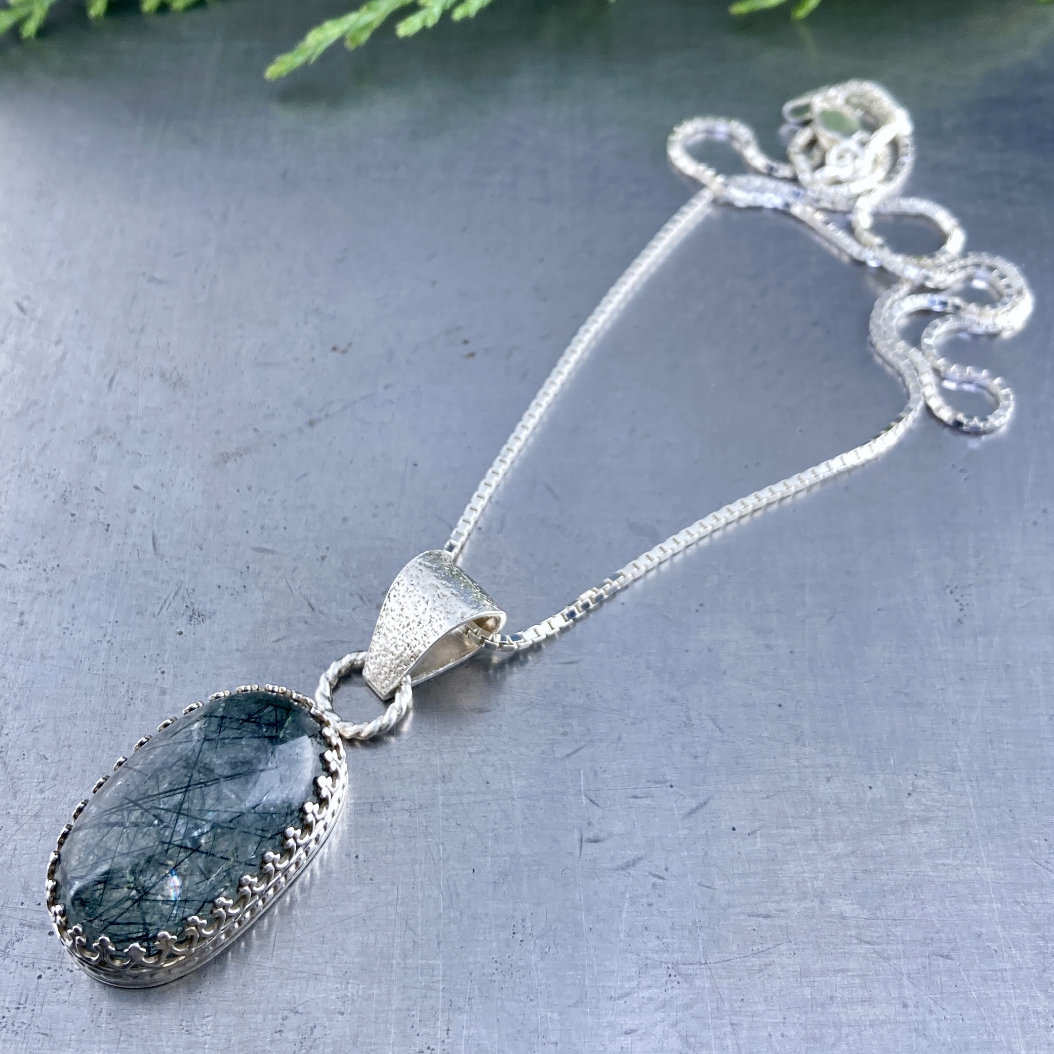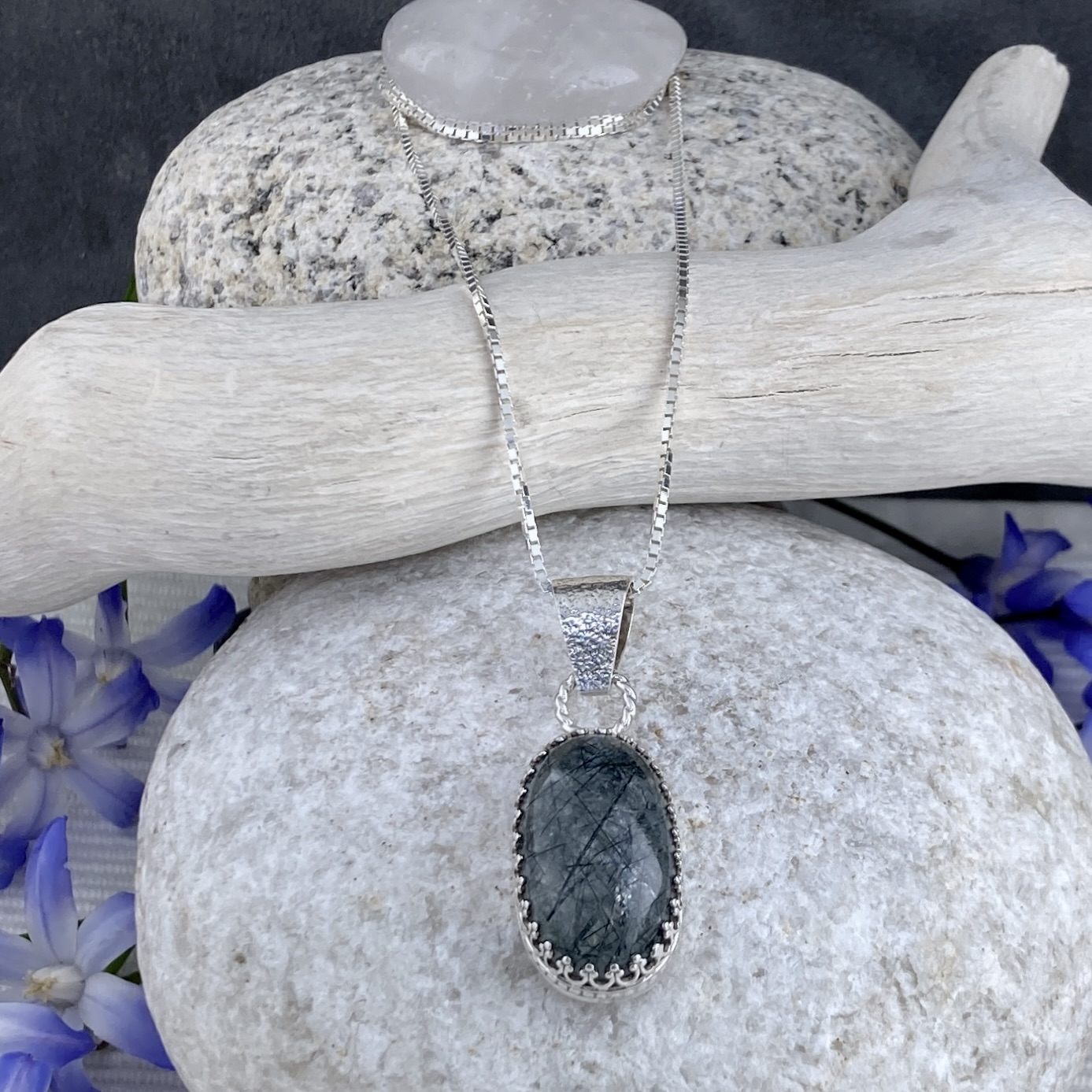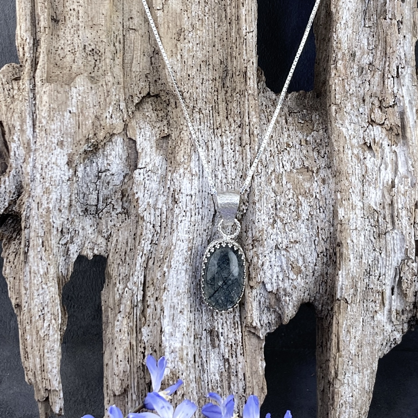 A filigree bezel is used to set this oval, cabochon cut stone. Tourmilated Quartz is one of the most interesting stones. It actually is Tourmaline inclusions that formed inside Quartzite.