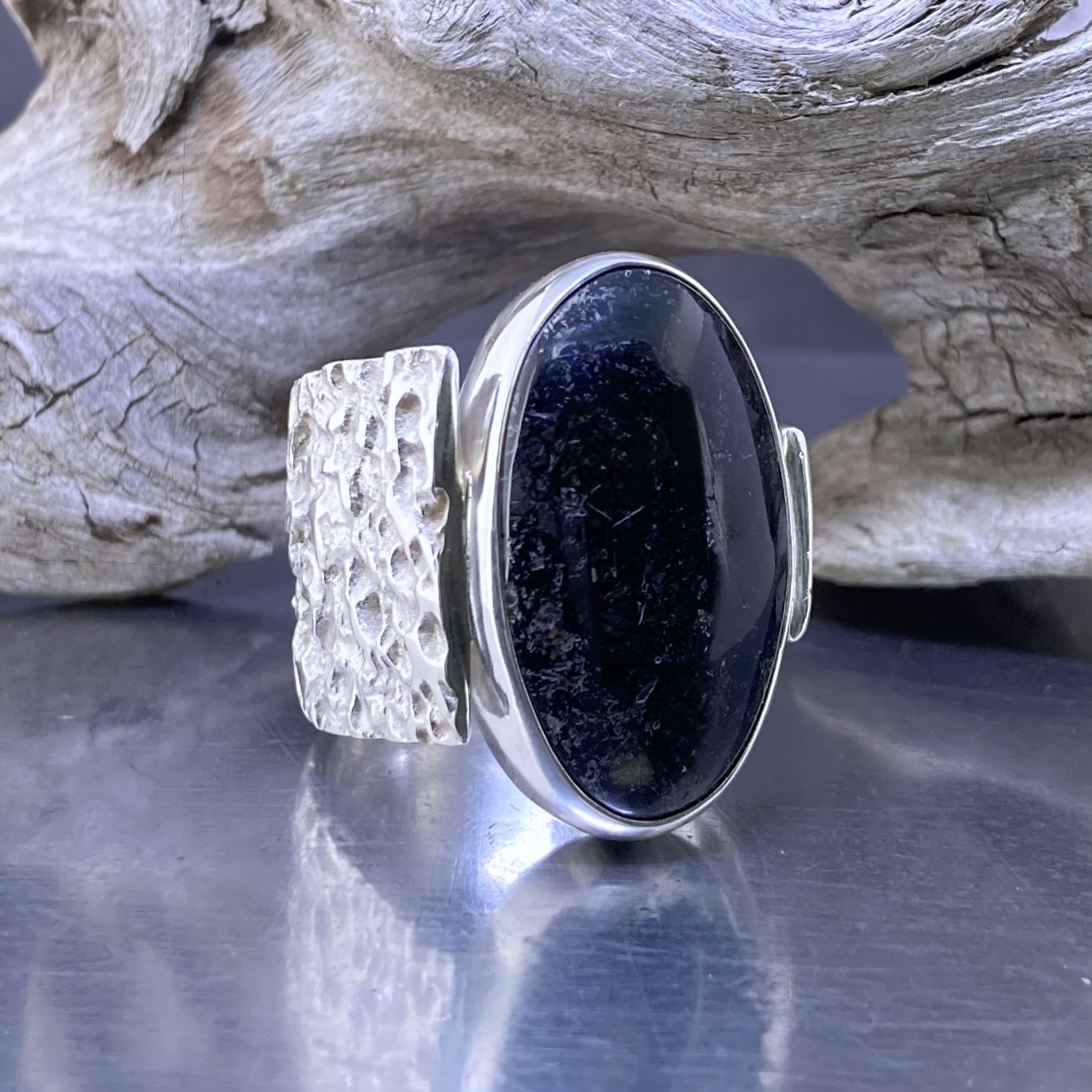 Each Lunar ring is handmade in Argentium 940 silver. I melt and shape the metal while it is molten to create the uneven texture of the moon’s surface. The Lunar panel stays slightly wider on one side, adding movement and depth. I then fuse the wide band into the panel to form a single, solid shape. The result is smooth, strong, and comfortable on the hand.