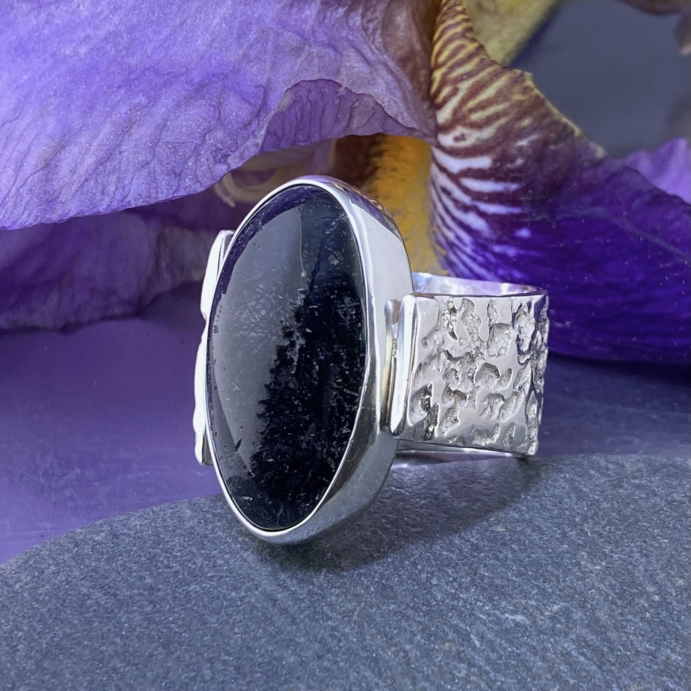 Tourmilated Quartz Argentium Silver Ring Size 9.5 captures the quiet glow of the moon. Clear quartz streaked with black tourmaline gives a mysterious, celestial look. The Lunar band reflects light like craters and shadows on a night sky.
