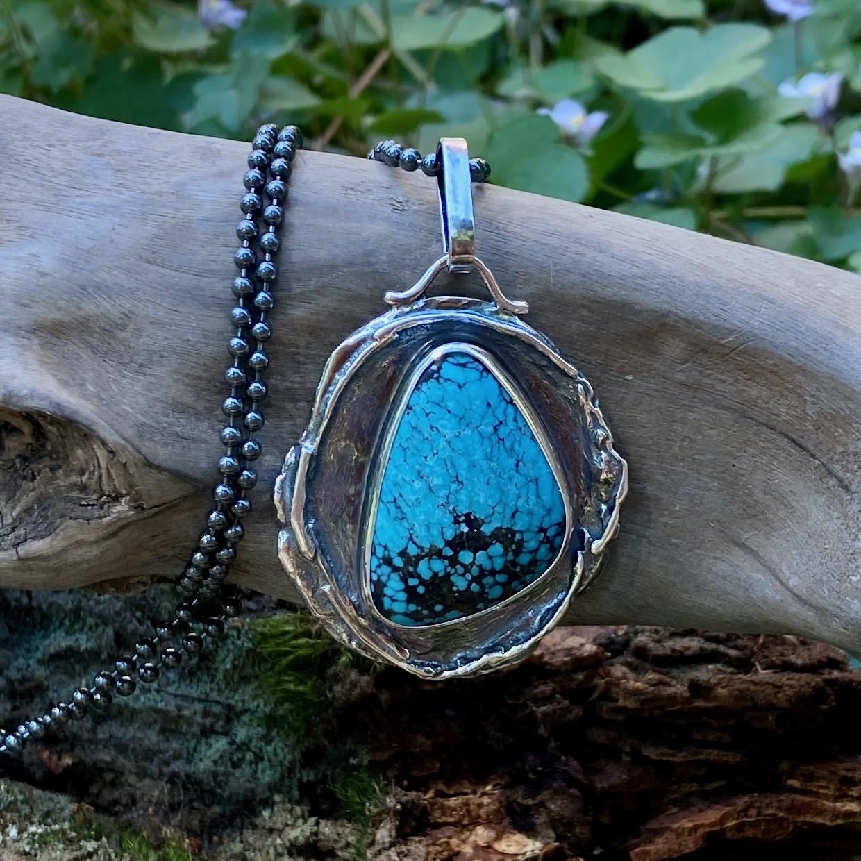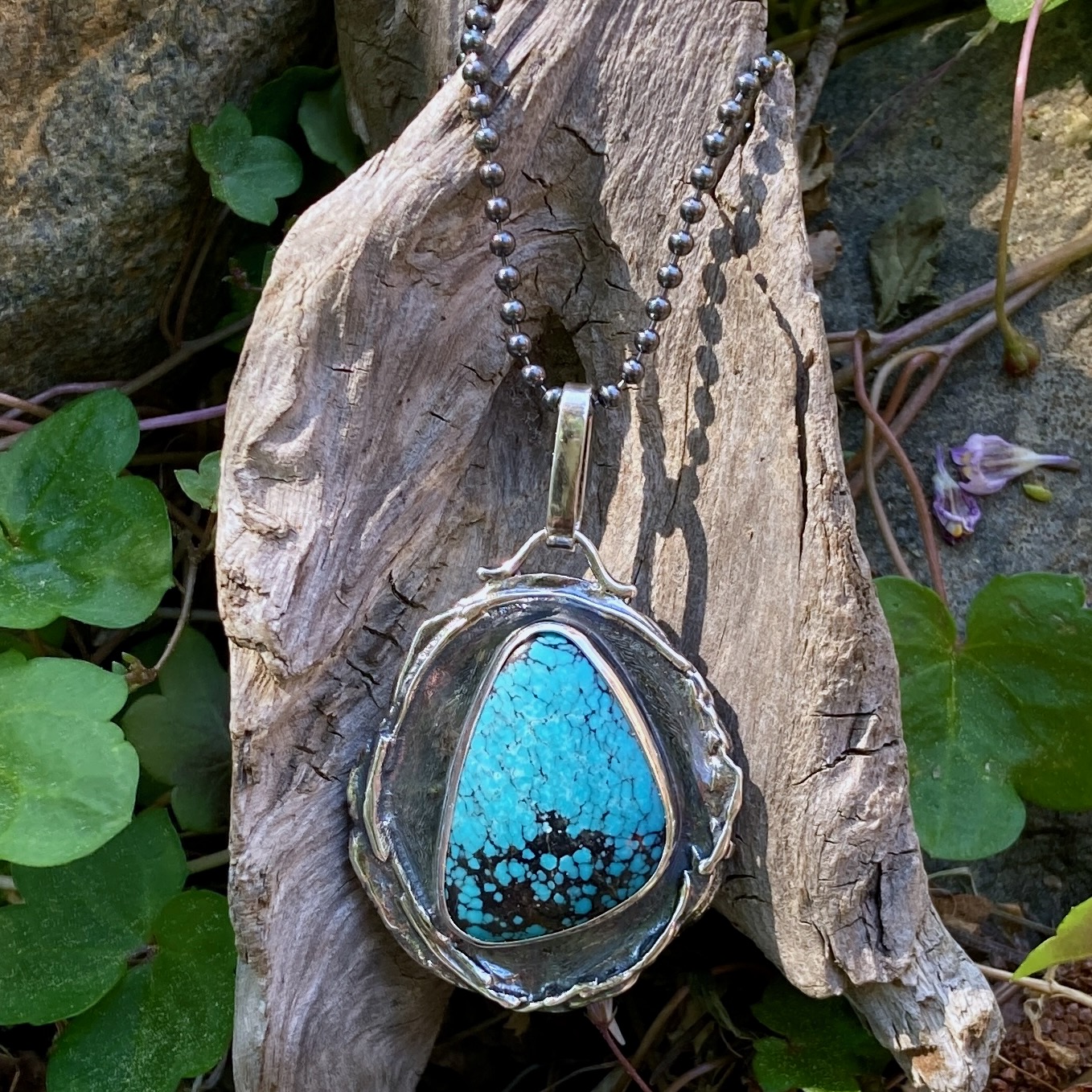I select a gemstone to compliment the ‘wax seal’.  For this pendant I chose a freeform, cabochon-cut Turquoise.  I hand make the bezel for each gemstone, which I then soldered to the pendant base.  And then I solder on a bail.  Lots of polishing and shaping has to happen before the final antique patina can be applied.