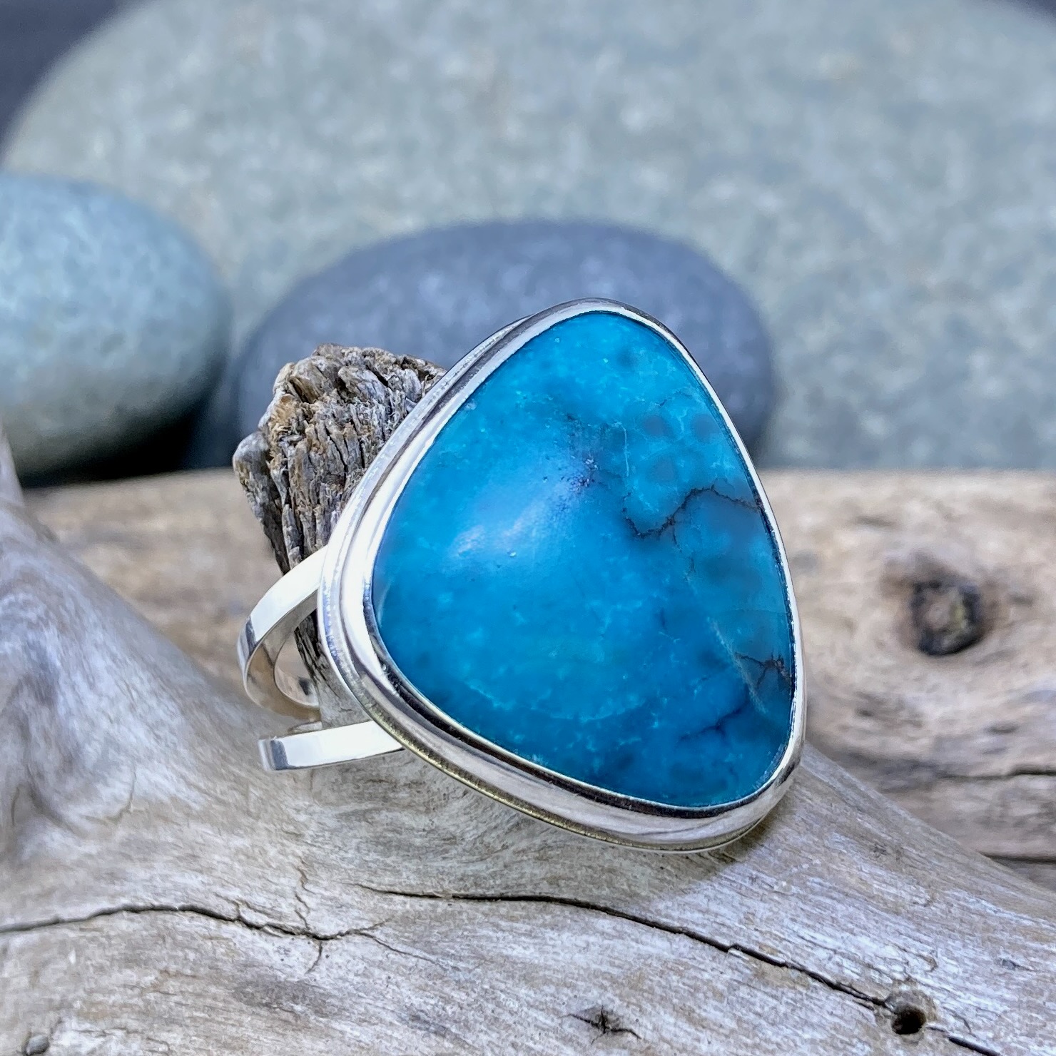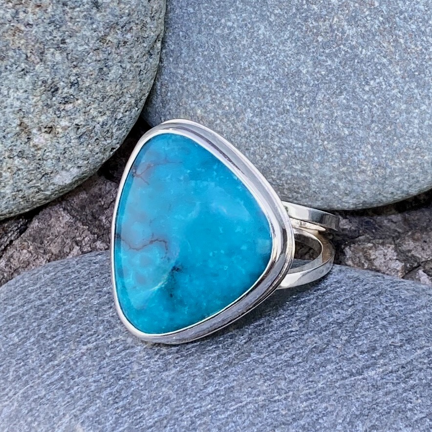 This triangular cabochon Turquoise is natural, mined in China, and untreated — not dyed or stabilized. Its true sky-blue color and organic matrix give the ring both character and authenticity.