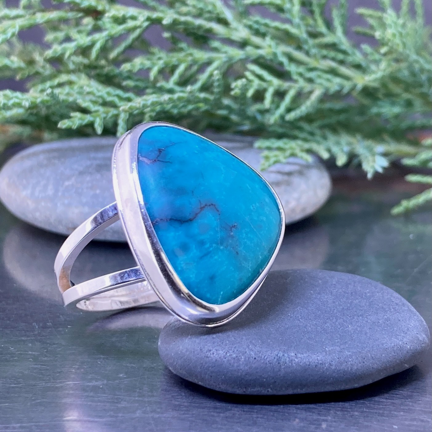 A bold Double-Band ring crafted in solid Argentium silver. Two round bands are fused together at the back for strength, then topped with a bezel-set natural Turquoise. The design supports larger gemstones securely while staying narrow on the inside for comfort.