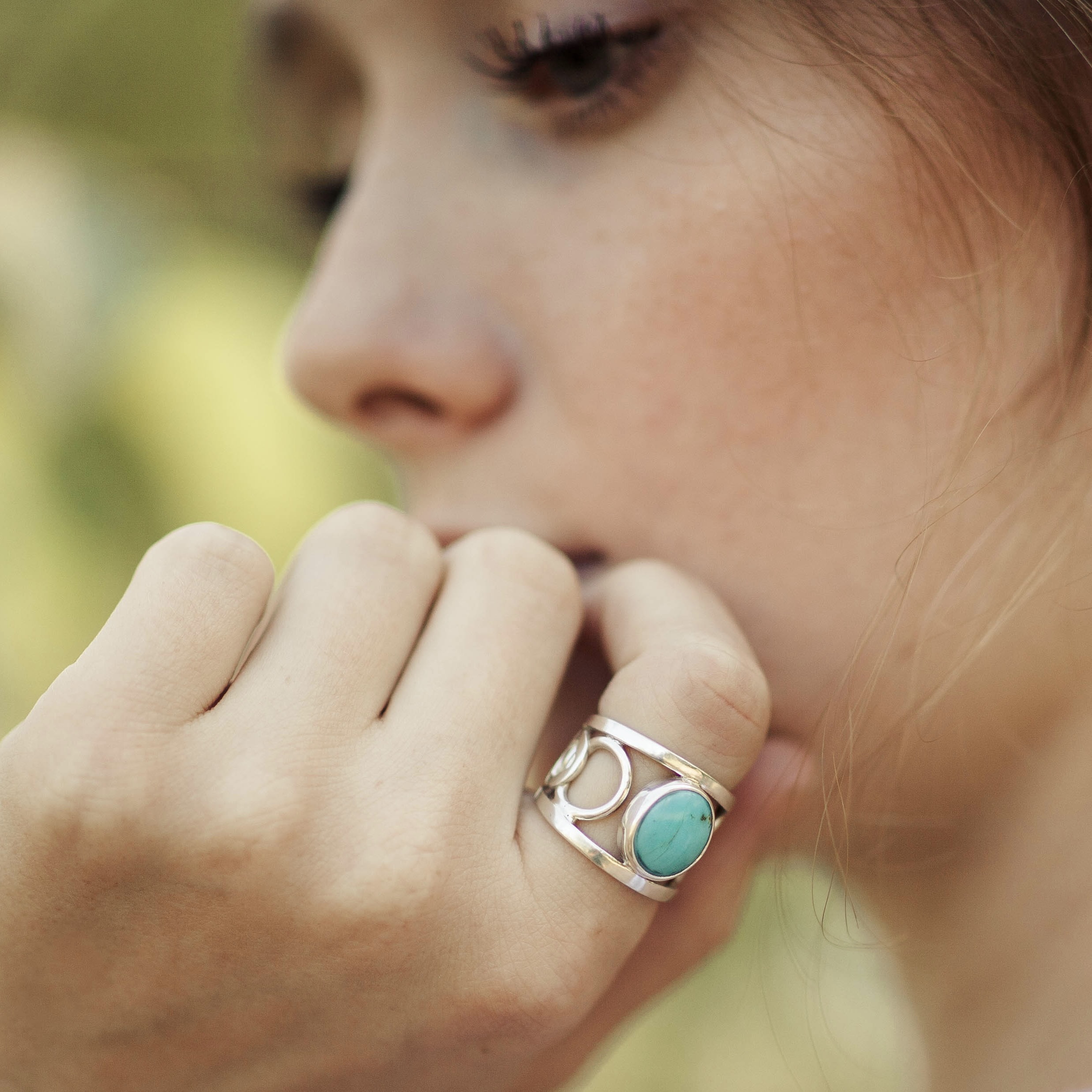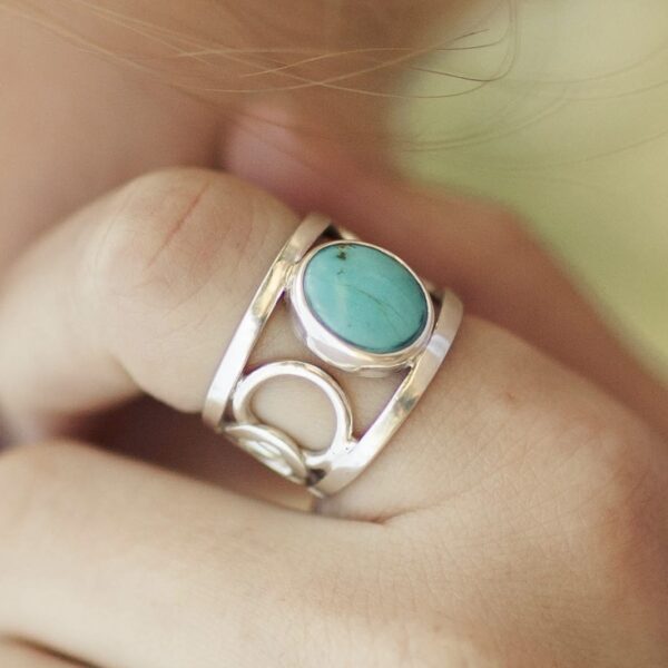 A beautiful oval-cut Turquoise cabochon, bezel set to highlight its natural matrix and colour variation. The rich blue-green tone contrasts against the bright silver, creating a timeless, earthy balance.
