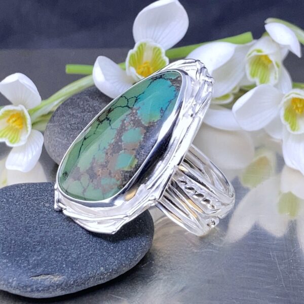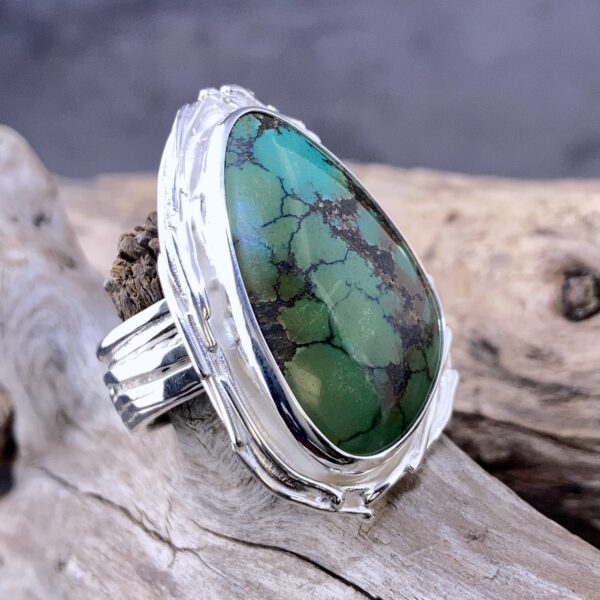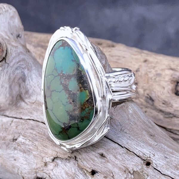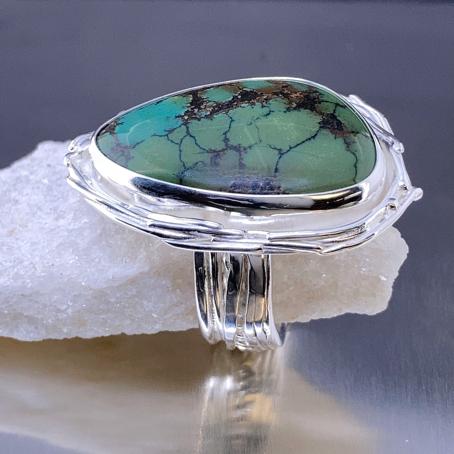 A natural, freeform cut Turquoise in shades of blue, and green and brown.  I added silver twigs around the turquoise for a beautiful detail. The bezel set Turquoise rests on top of a bark design band for a subtle, interesting take on a cabochon ring.