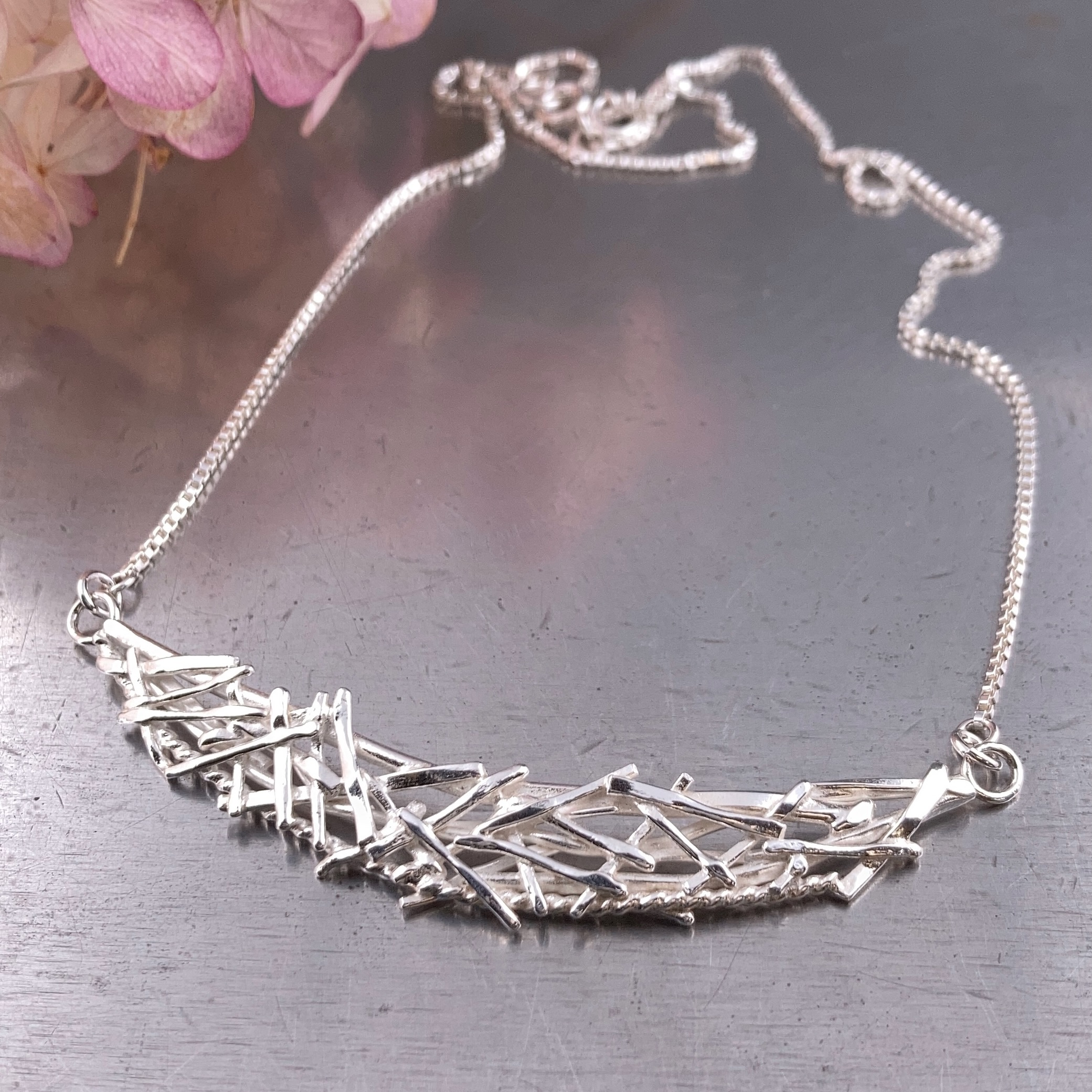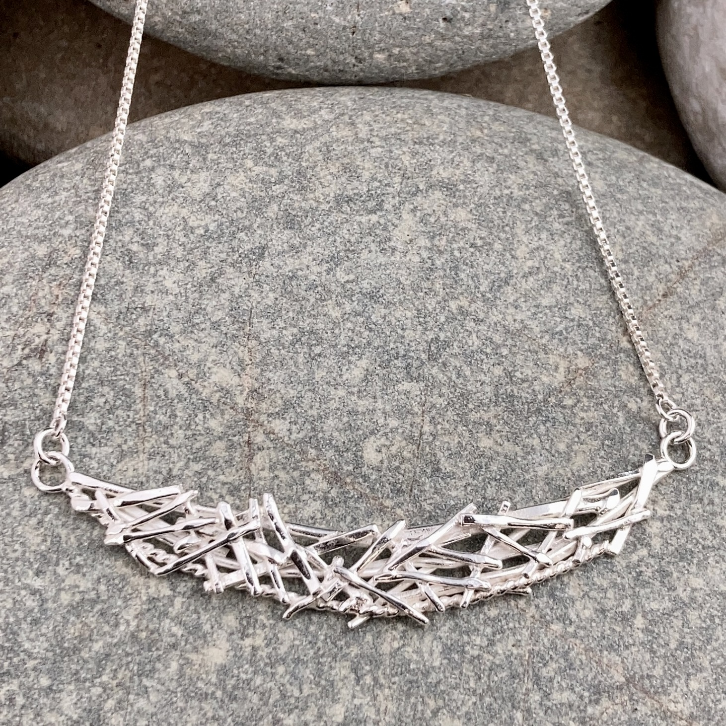 I fused branches of Argentium silver together to form a frame, and then added lots of silver twigs for detail. Reminiscent of a pile of twigs on the forest floor. This collar I kept small and dainty – it’s one of those surprises how nice it looks on!