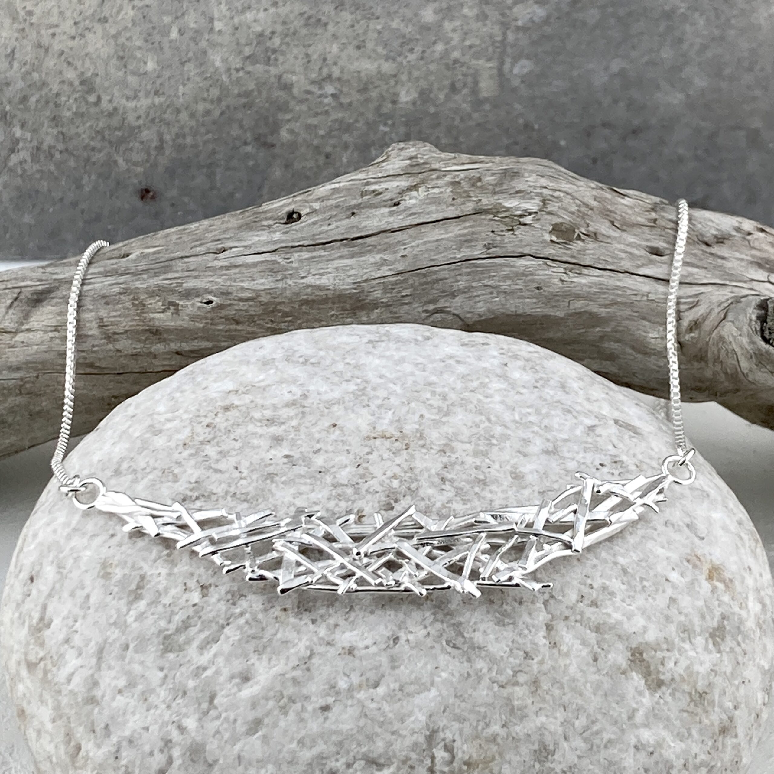 Argentium silver twigs in a collar shape.  Natural shaped twigs in Argentium silver – piled and then fused to form a permanent collar.