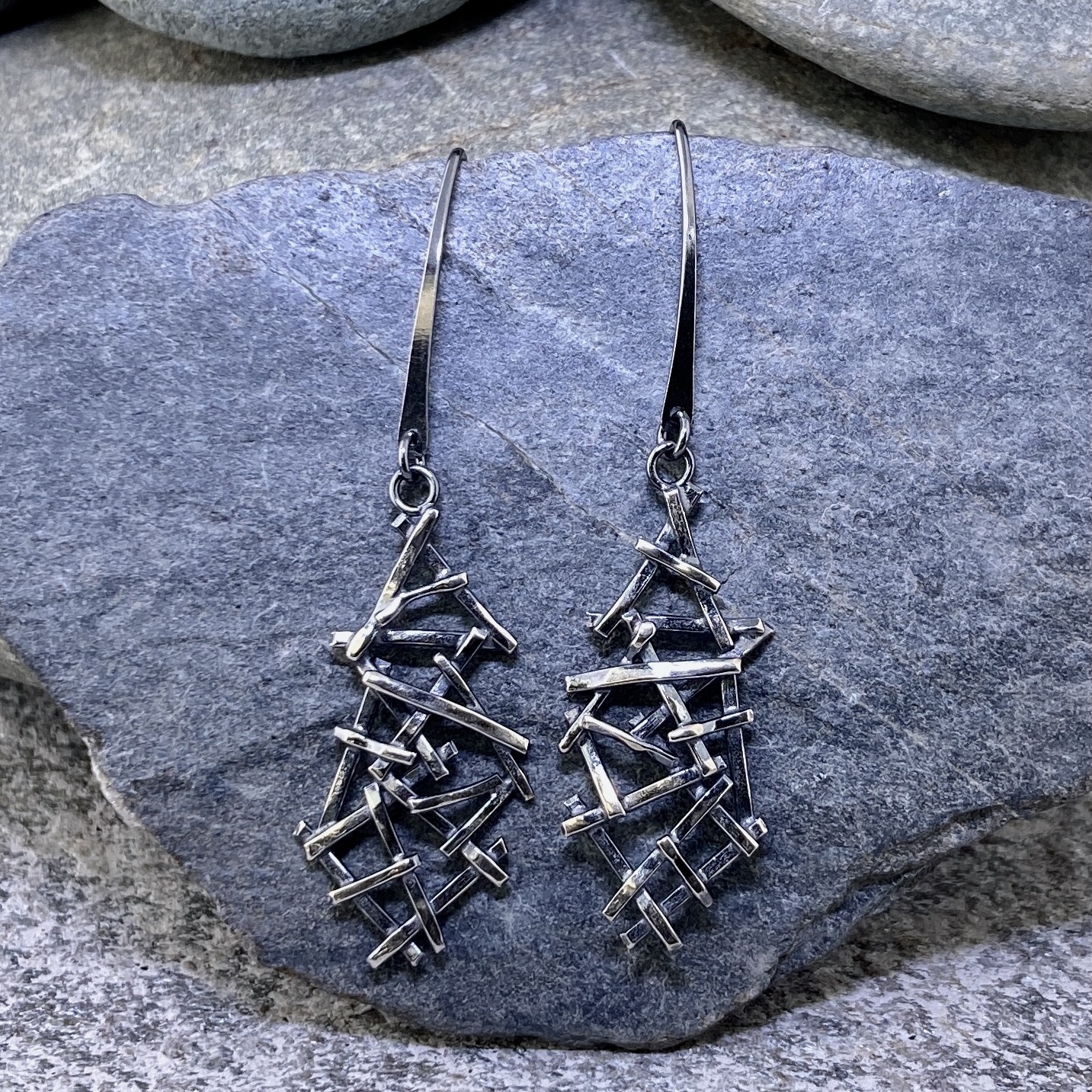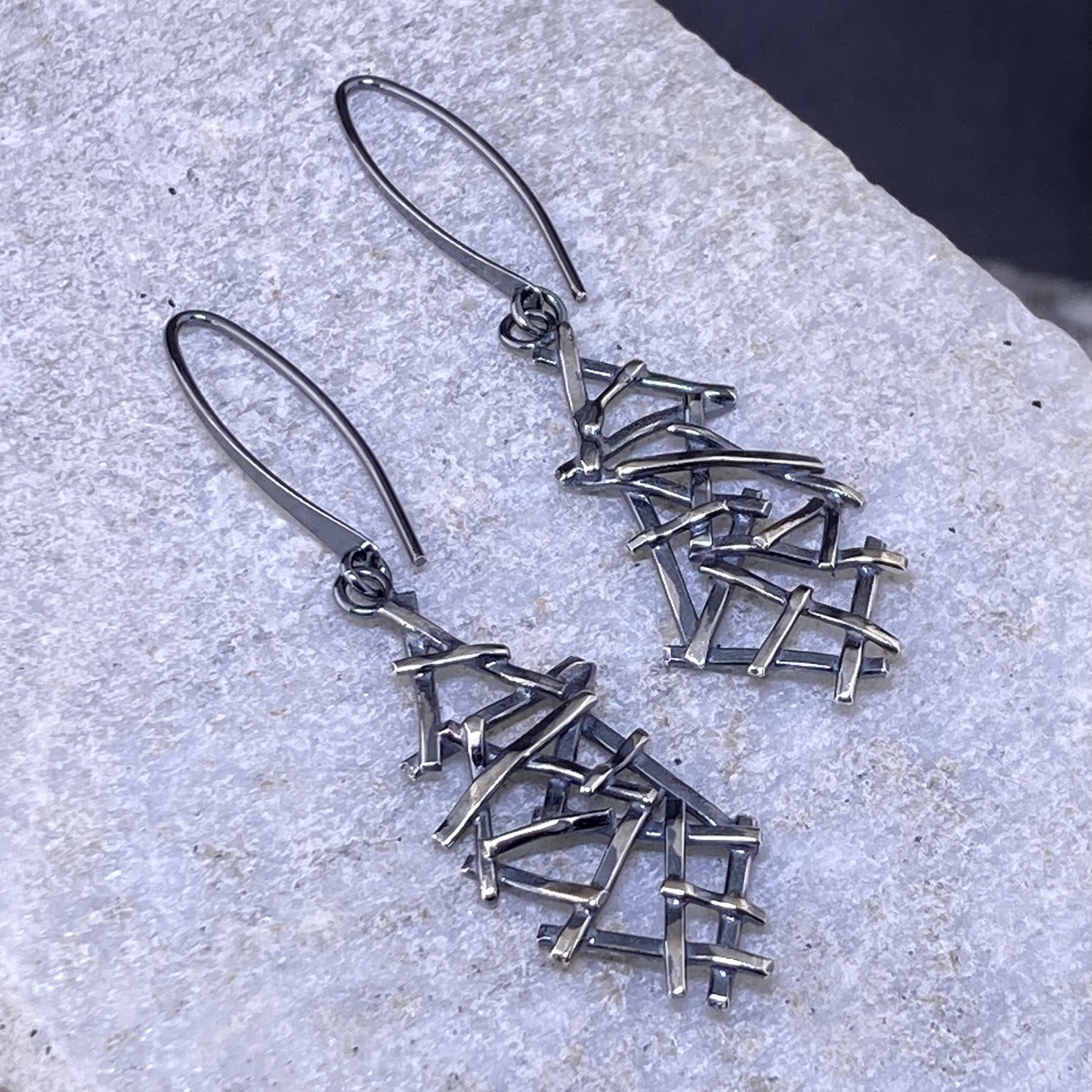 Each earring is unique, with the twig lines forming an organic, irregular pattern. The long handmade earwires give a graceful drop and balance the lightness of the form. The antique finish adds quiet depth, while the raised silver edges catch subtle light as they move.