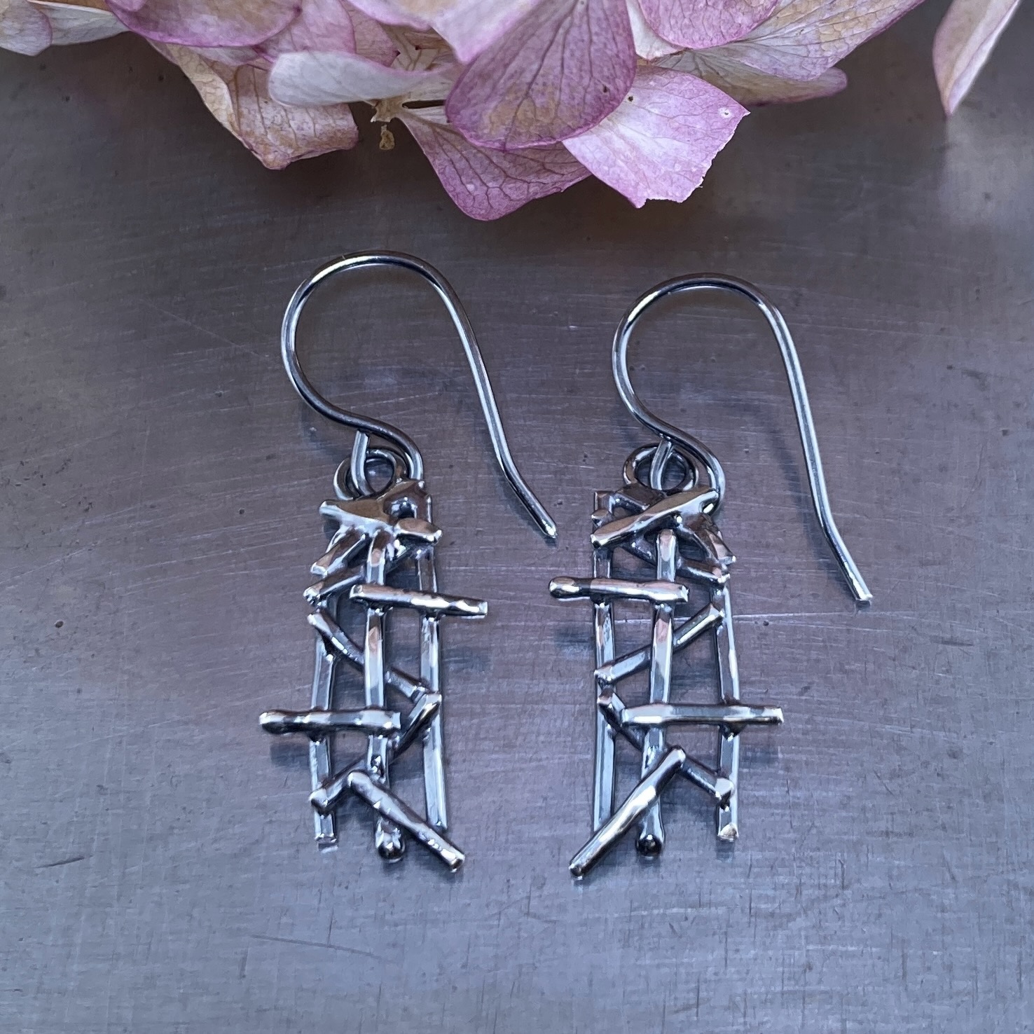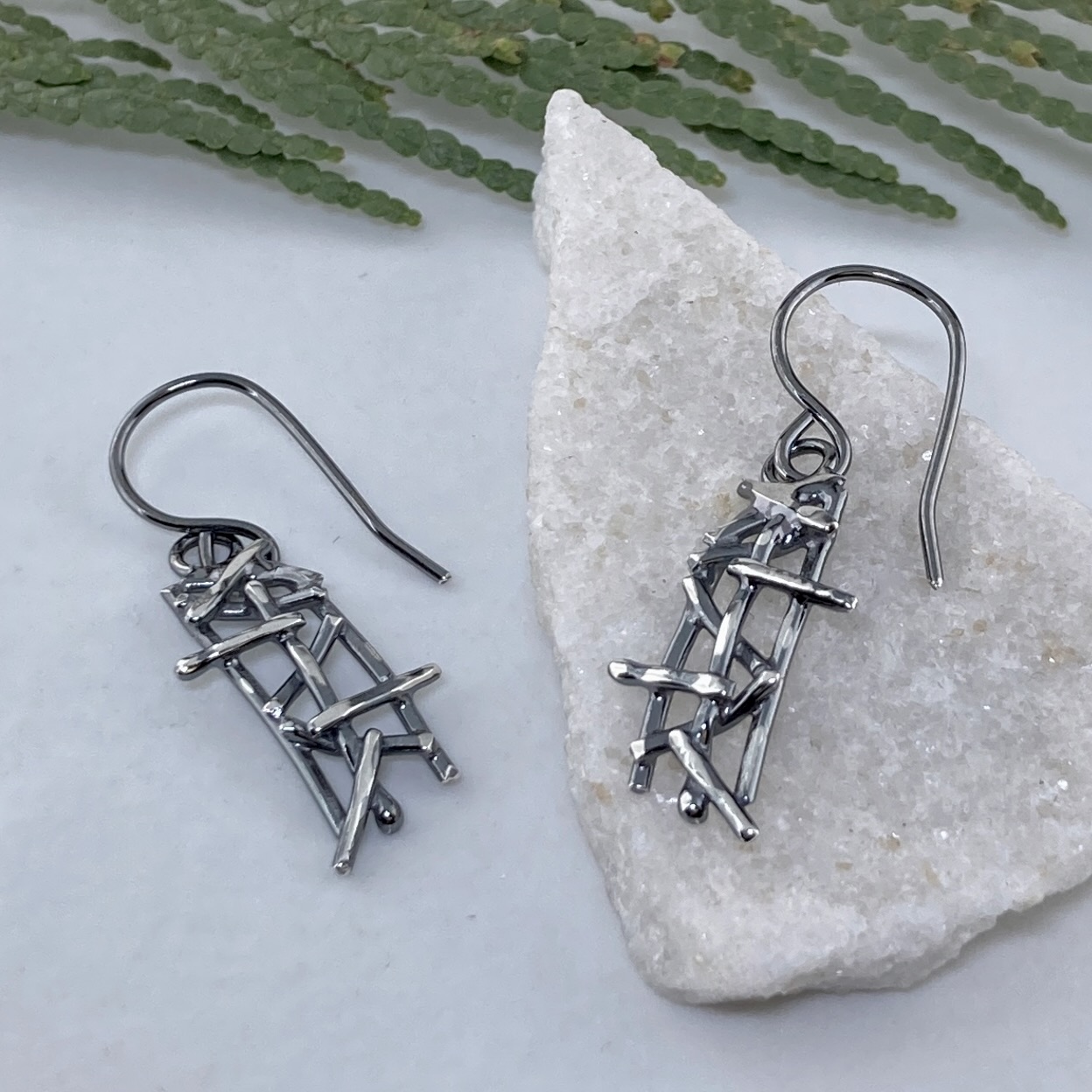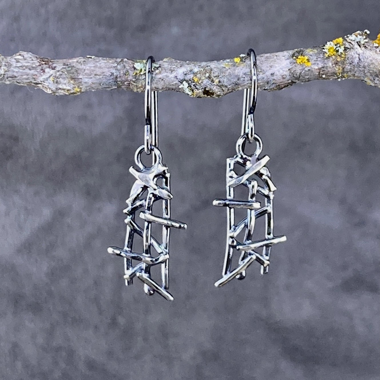 Argentium silver pieces piled together to look like twigs in the forest. Fused and then an antique finish is applied.