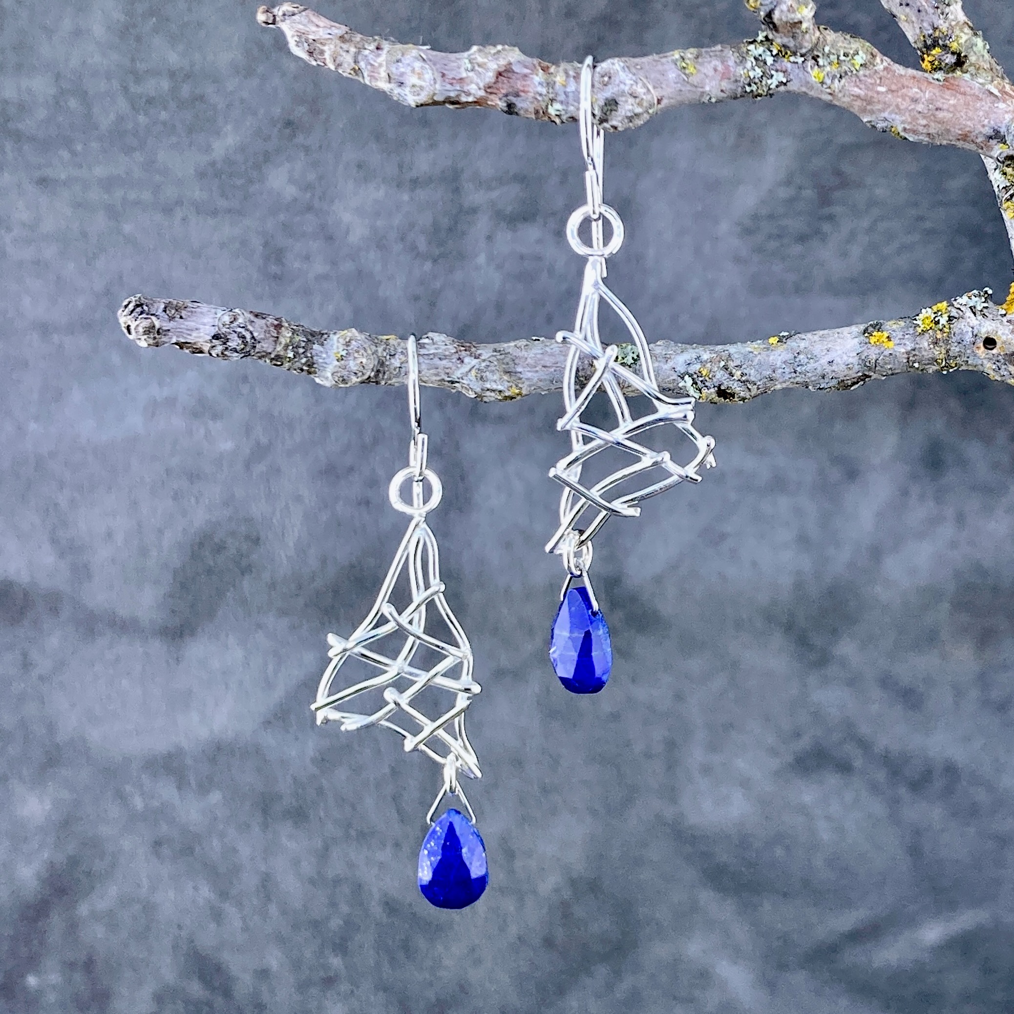 Argentium silver is used to make little silver twigs – which I pile into a sail shape and then fuse.  These earrings have a really nice pair of Sodalite teardrops as an accent.