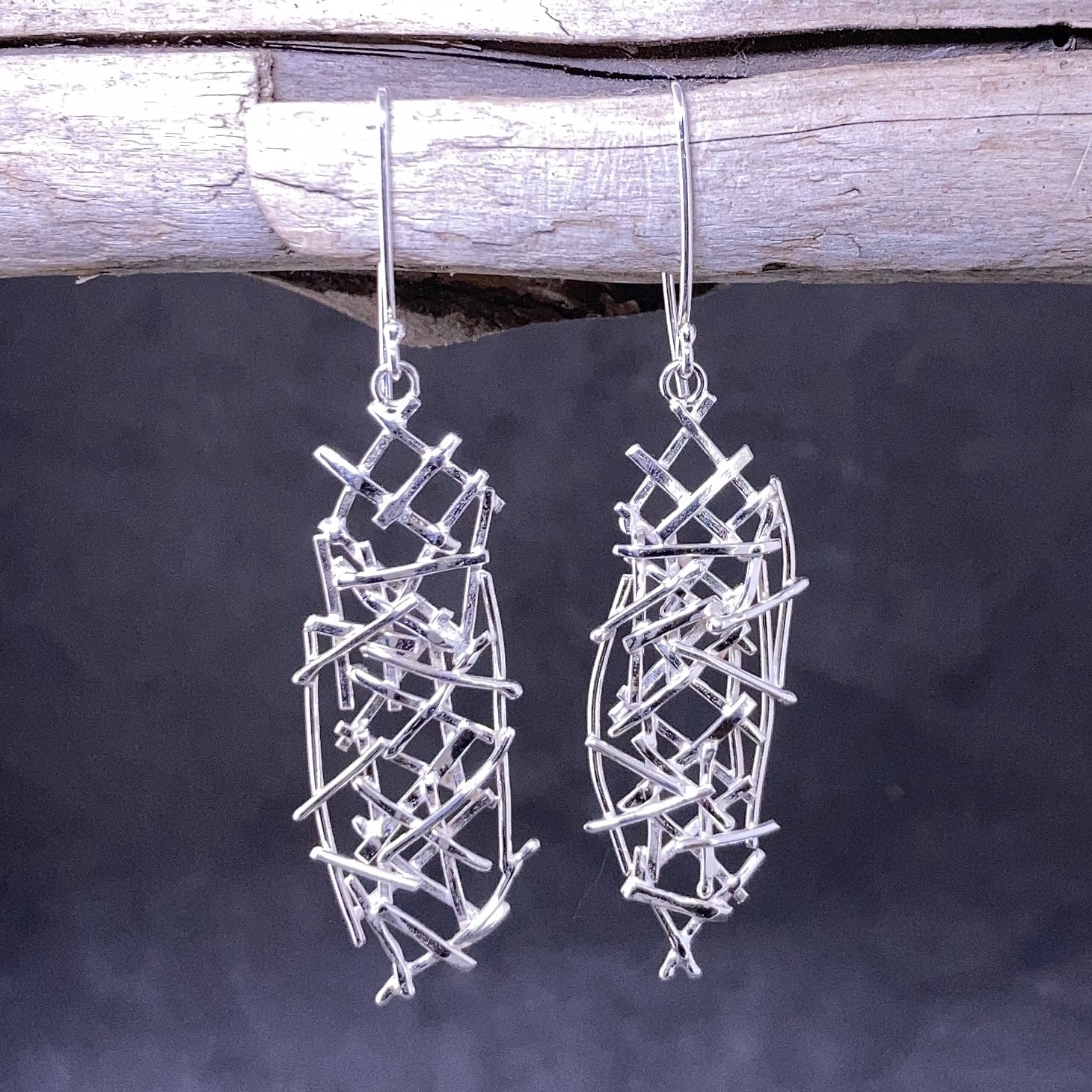 Argentium silver pieces piled into little abstract shapes, like piles of twigs on the forest floor.