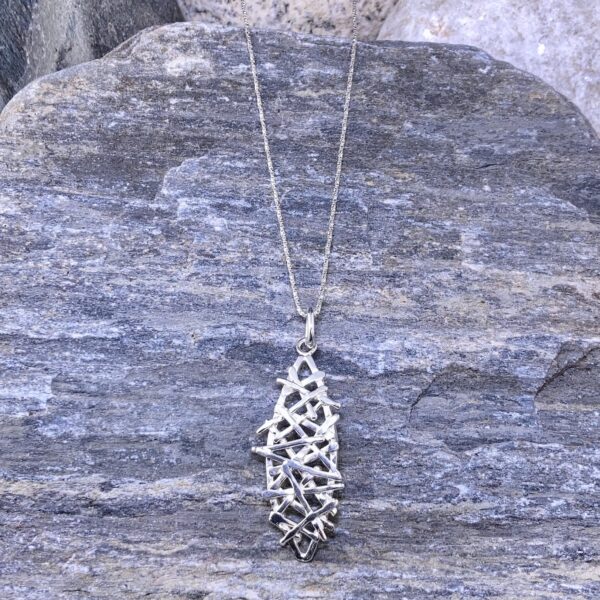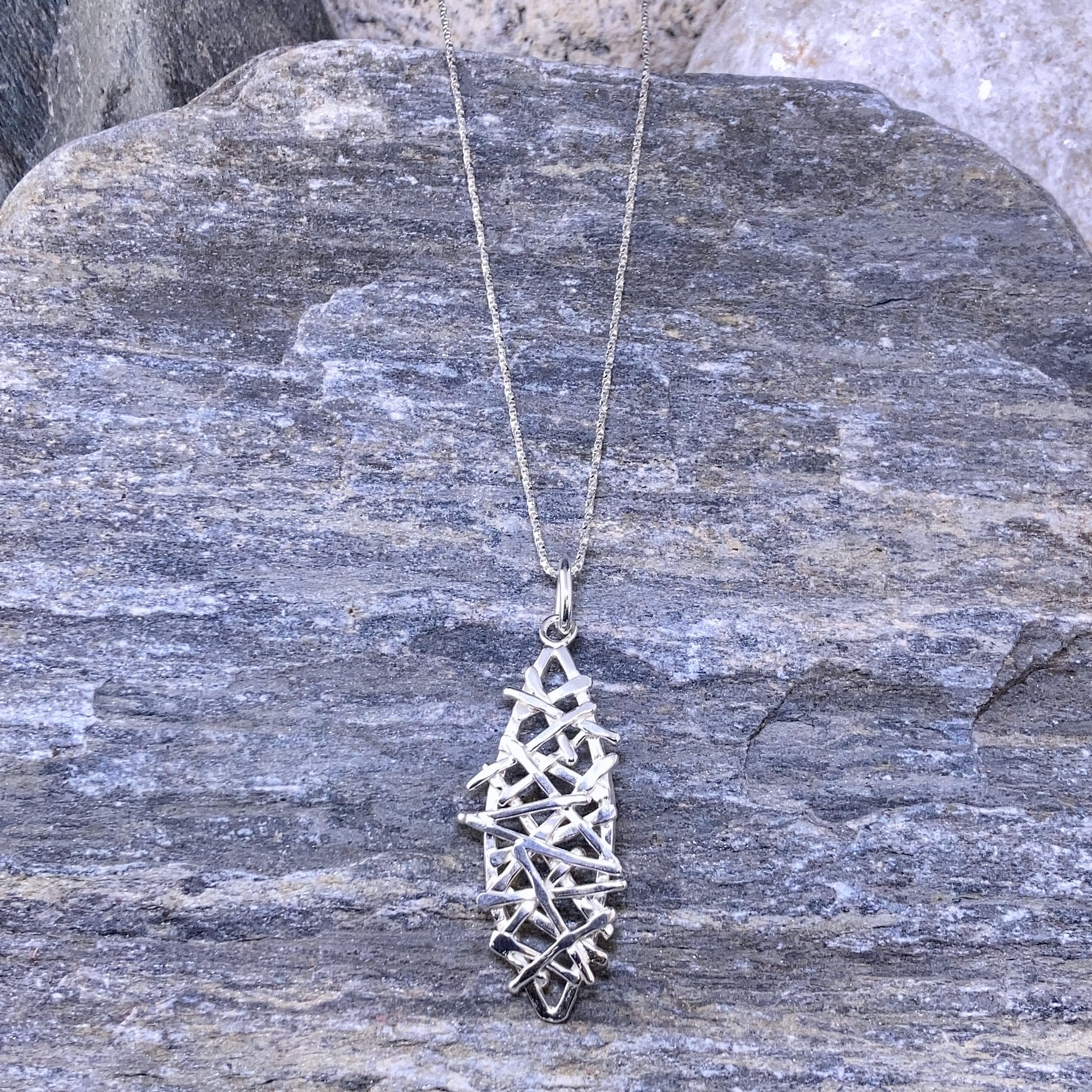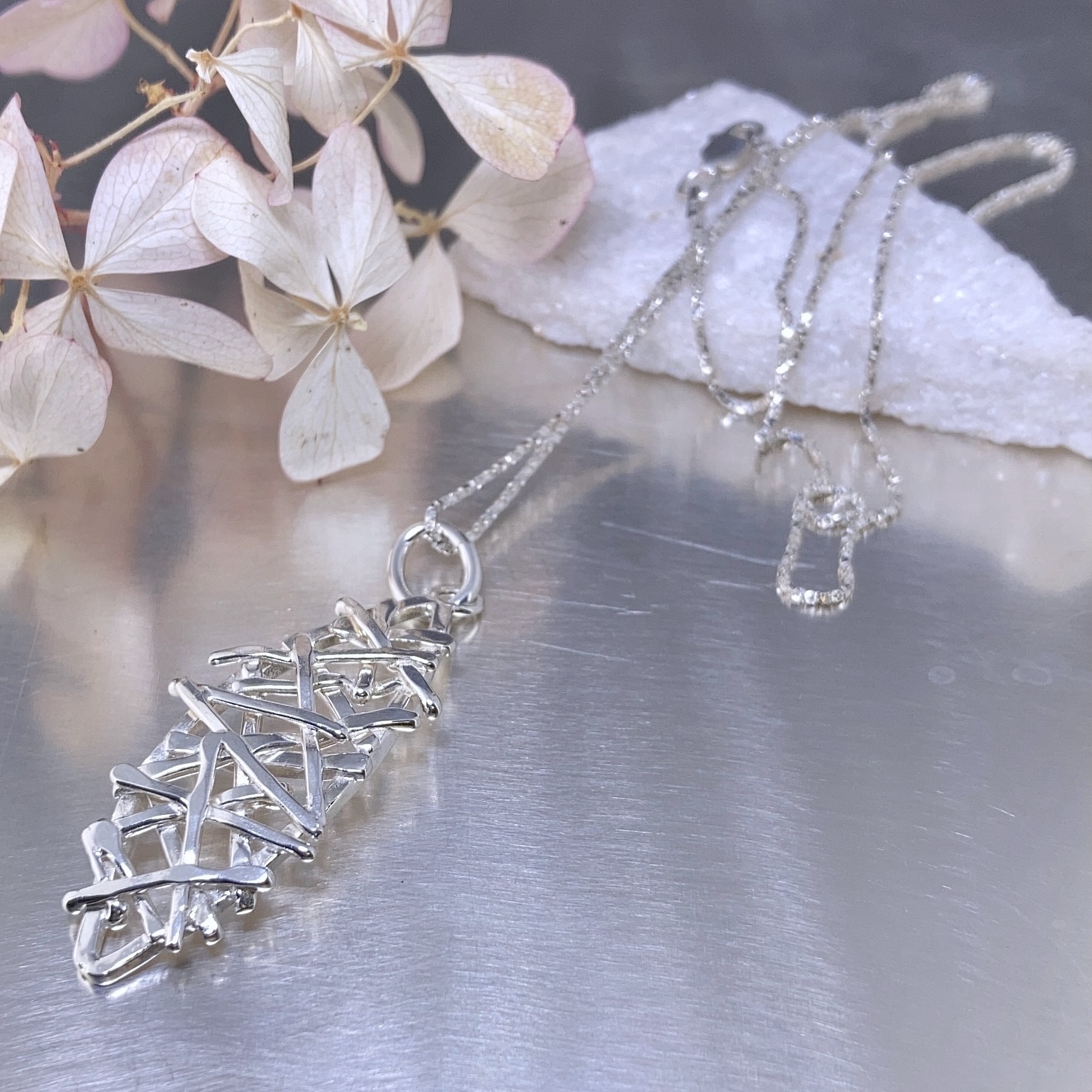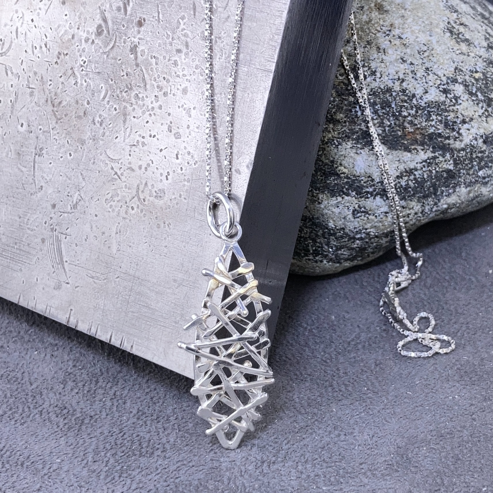Bits of Argentium silver ‘twigs’ laid together in a natural forest pattern and fused. Then more bits of silver until a nice pattern shape is achieved.