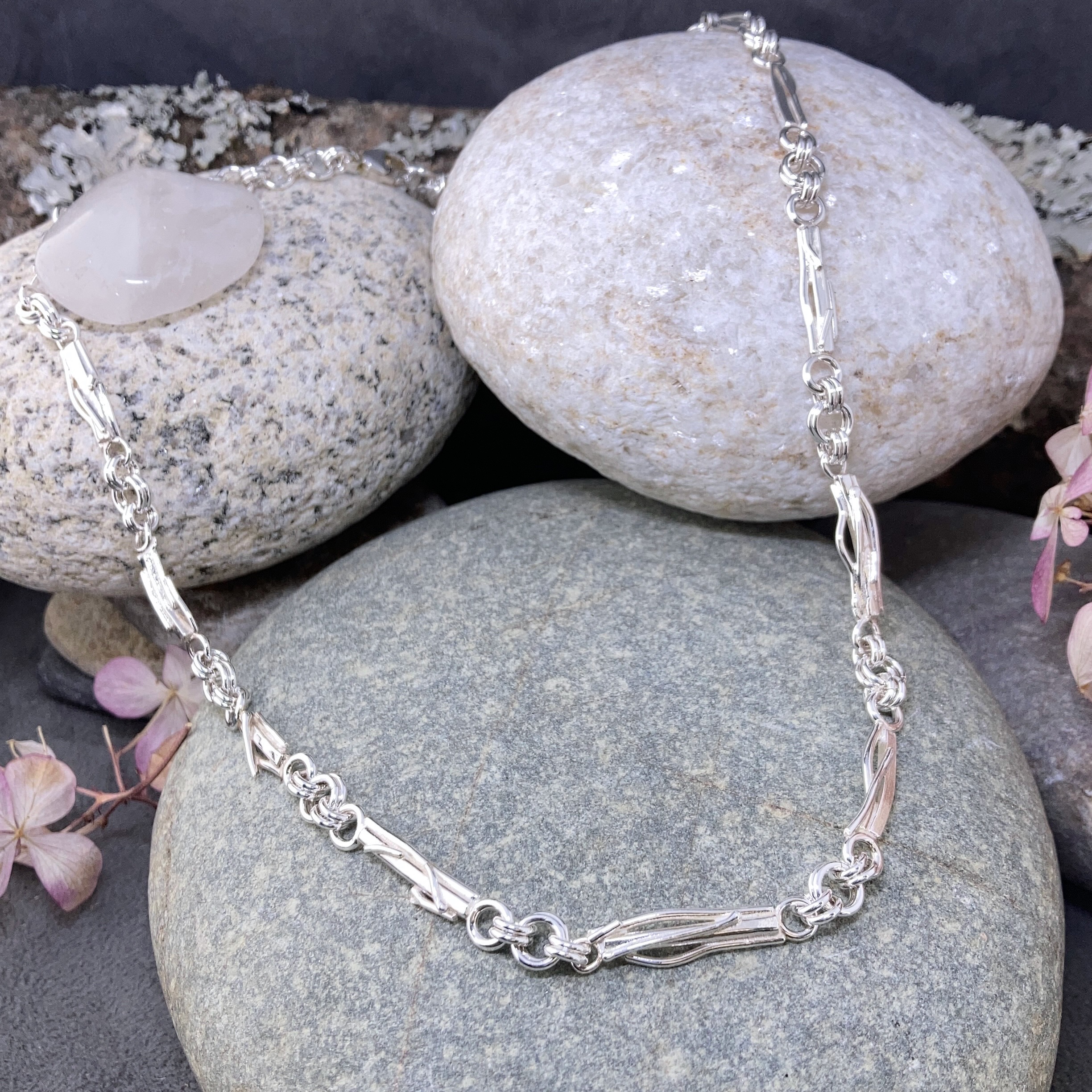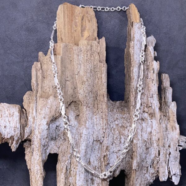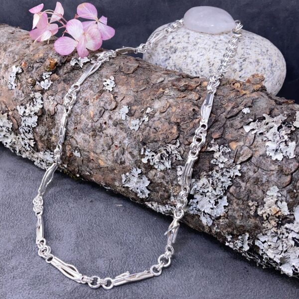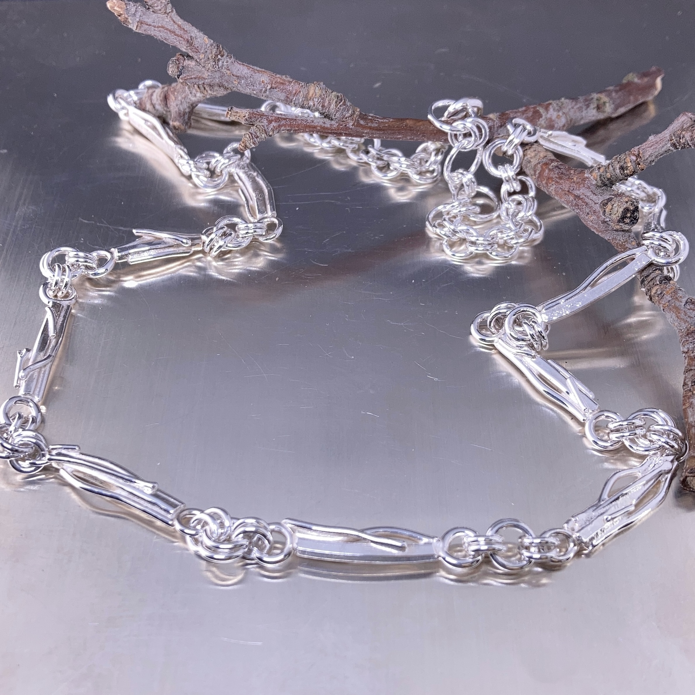Twig panels with links necklace – 19-20″.  I have laid out bits of Argentium ‘twigs’ and fused them together into panels.  Then using Argentium silver I have strung the twig panels into an 19-20 inch necklace.  Solid Argentium silver is used for the entire necklace.  This makes a great everyday necklace because of the easy wear.  But will easily dress up.