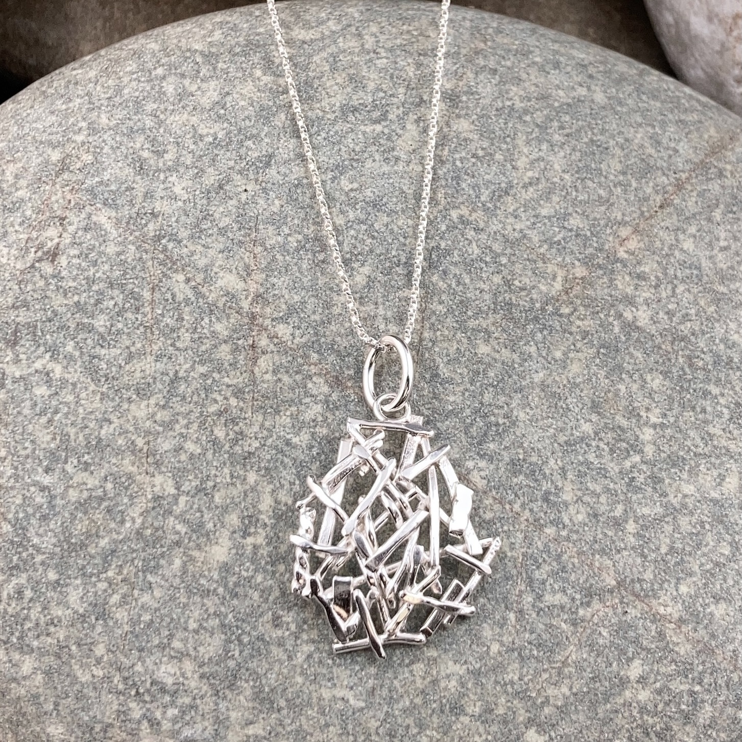 A small pile of silver twigs, purposely random. I fuse the first layer of twigs and then continue to add until I have a nice shape and really good balance. I always use a larger bail so it can easily go on a thicker chain or leather cord.