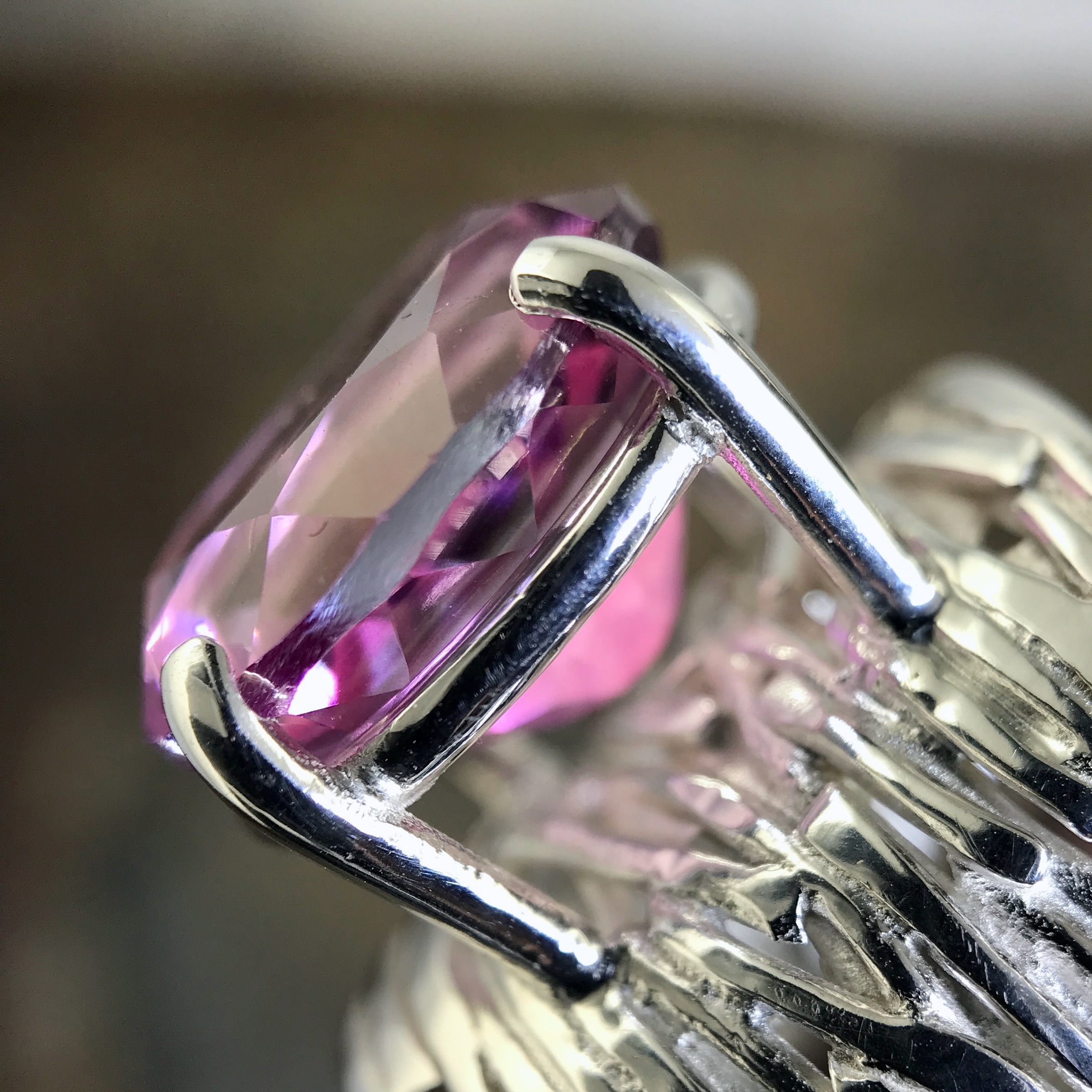 Each ring begins as a bundle of fine silver wires that I fuse together to form the twig texture. I then shape and refine the band before adding the prong setting. After heat-treating the Argentium to harden and brighten it, I set the Pink Topaz and polish the surface to a natural shine. Therefore, every piece feels alive — a meeting of metal and light.