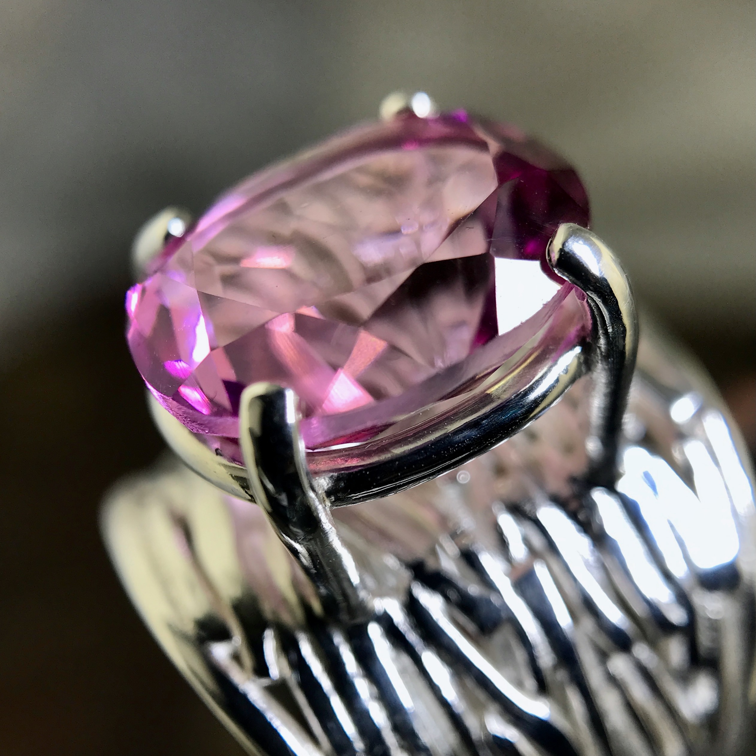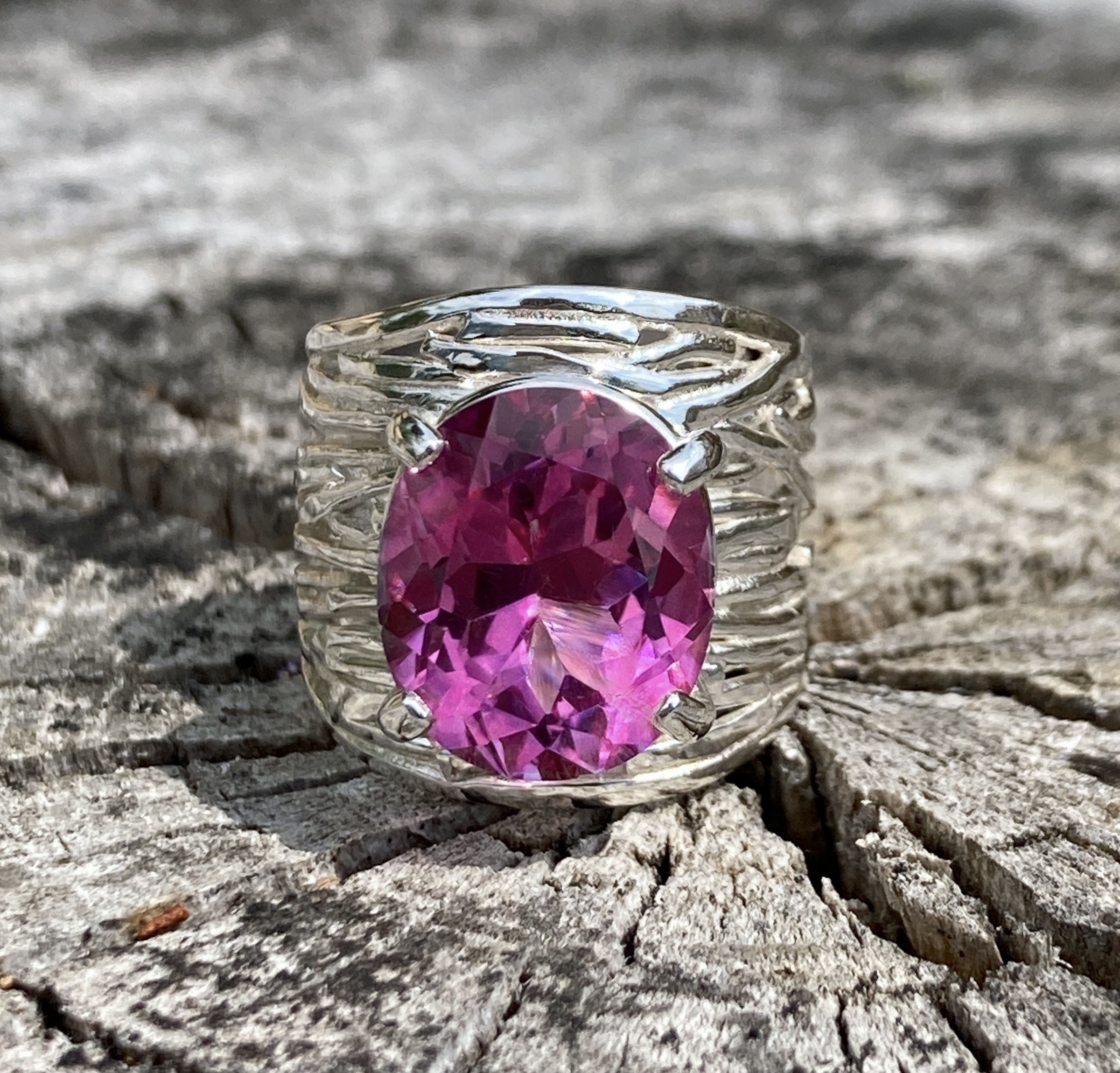 This oval Pink Topaz (~10.5 carat) glows with a deep, rose-pink tone. I mount it in a prong setting, which lifts the stone slightly so light passes through it from every side. The combination of bright gemstone and organic silver gives the ring a lively, natural feel.