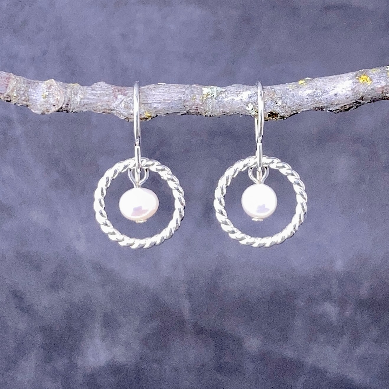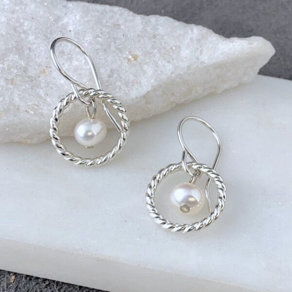 Argentium silver twist rings with a natural white pearl suspended in the middle.