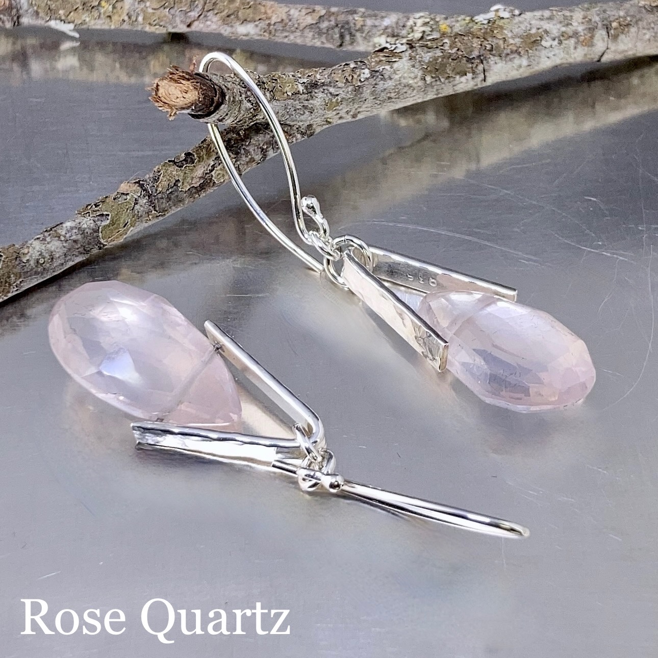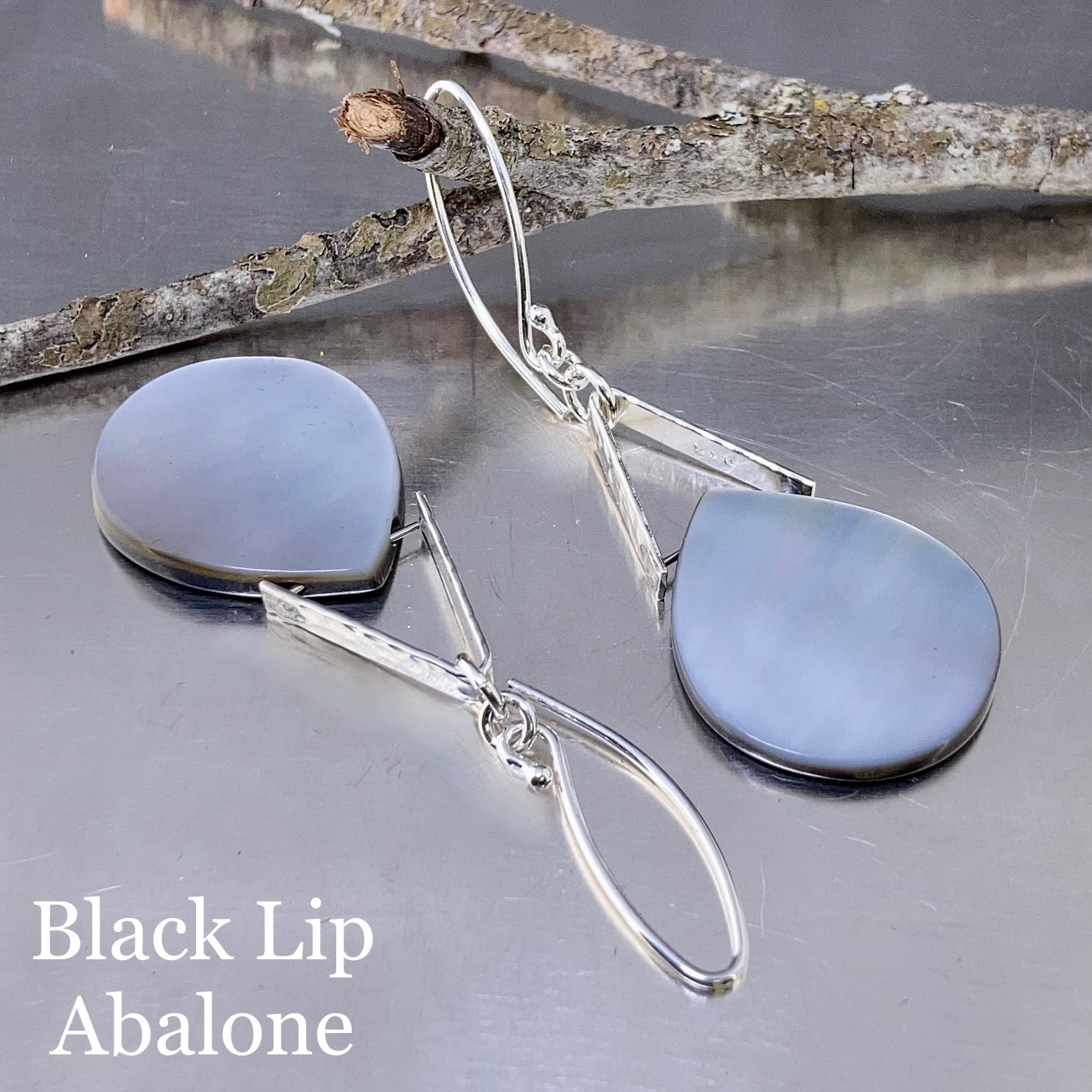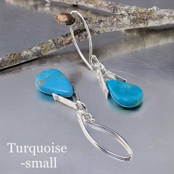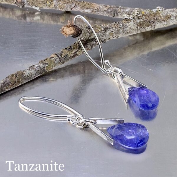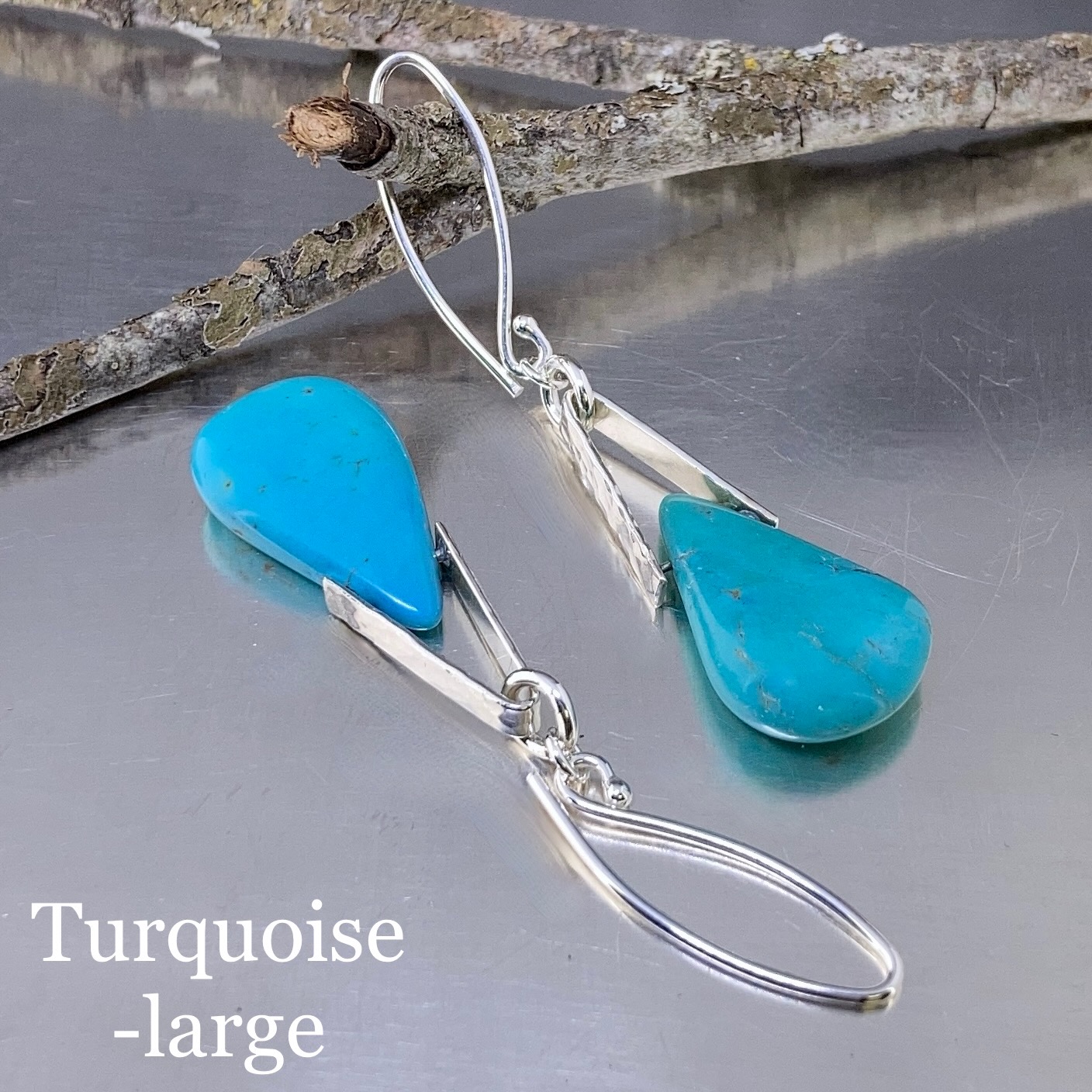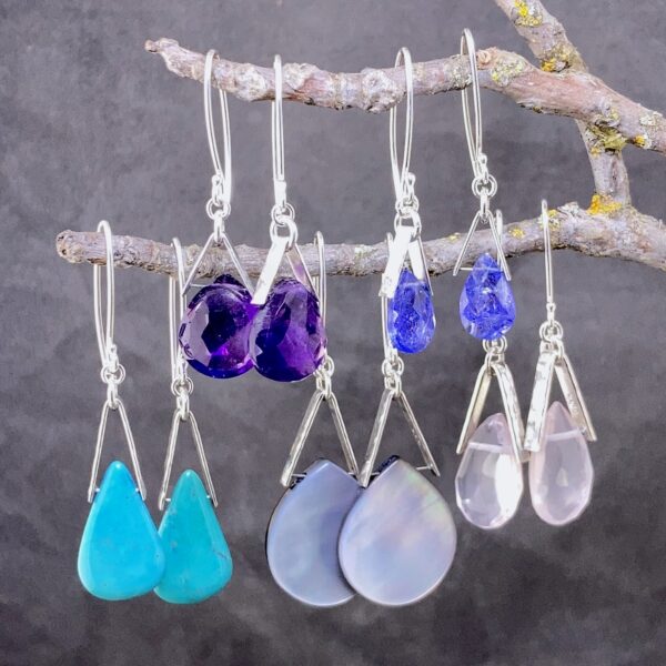 Natural gemstone teardrops on a hand hammered V bail. These earrings have the long Argentium silver earwires. A really nice variety of all natural stones.