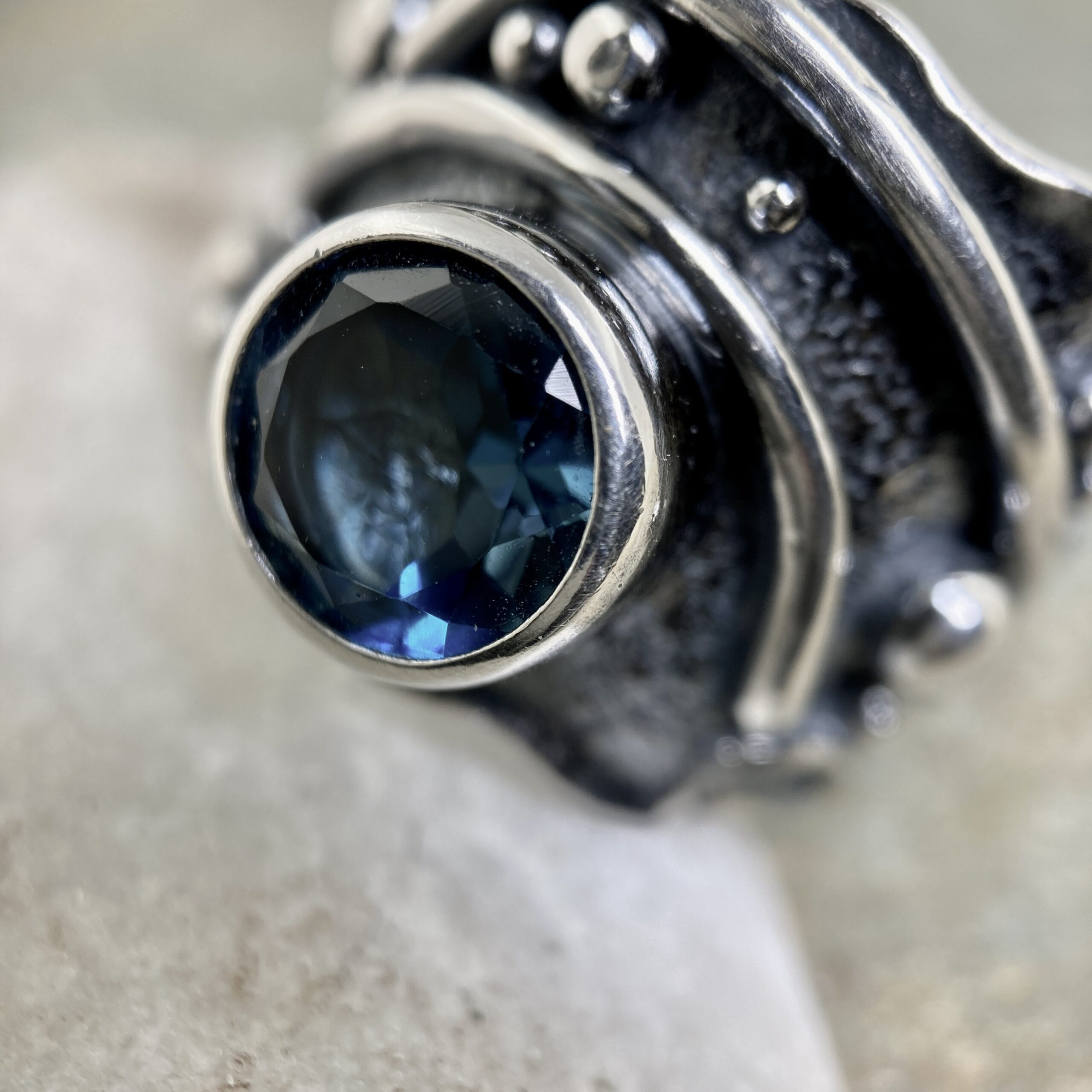 The London Blue Topaz Ring Size 7 Argentium Silver Water Design combines deep colour and fluid form. A 2 carat round London Blue Topaz rests in a handcrafted bezel, set within softly curved silver and finished with an antique patina for depth and contrast.