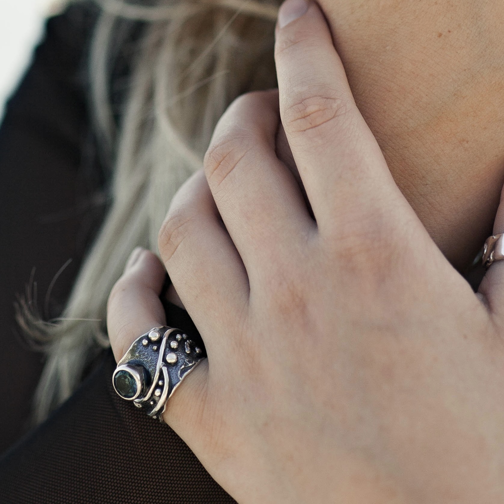 Each Water ring is formed in Argentium 940 silver to capture the movement and rhythm of flowing water. The antique finish enhances texture while maintaining a luminous surface. The front widens gracefully to frame the gem, tapering at the back for comfort and balance.