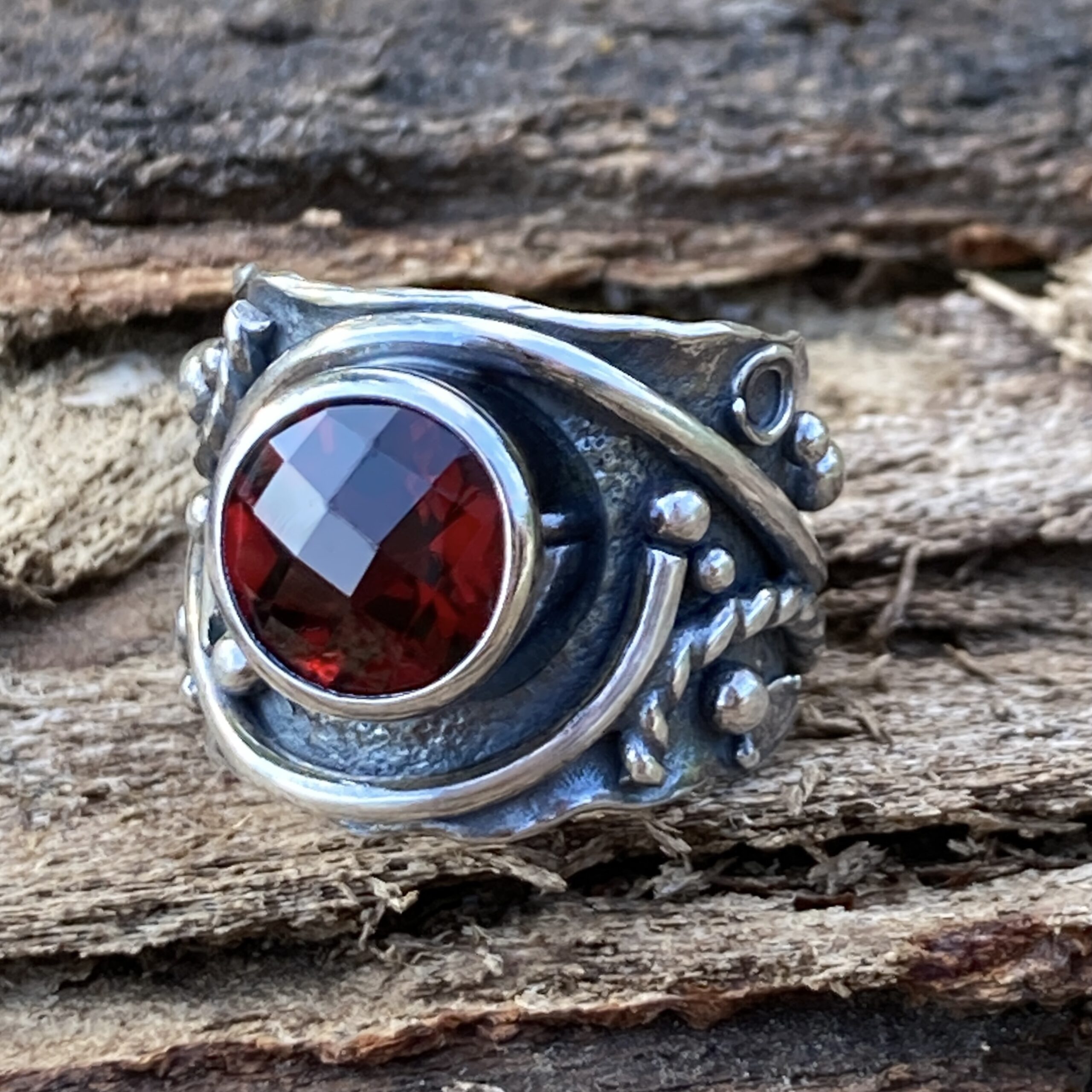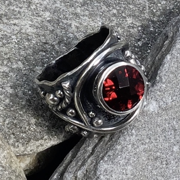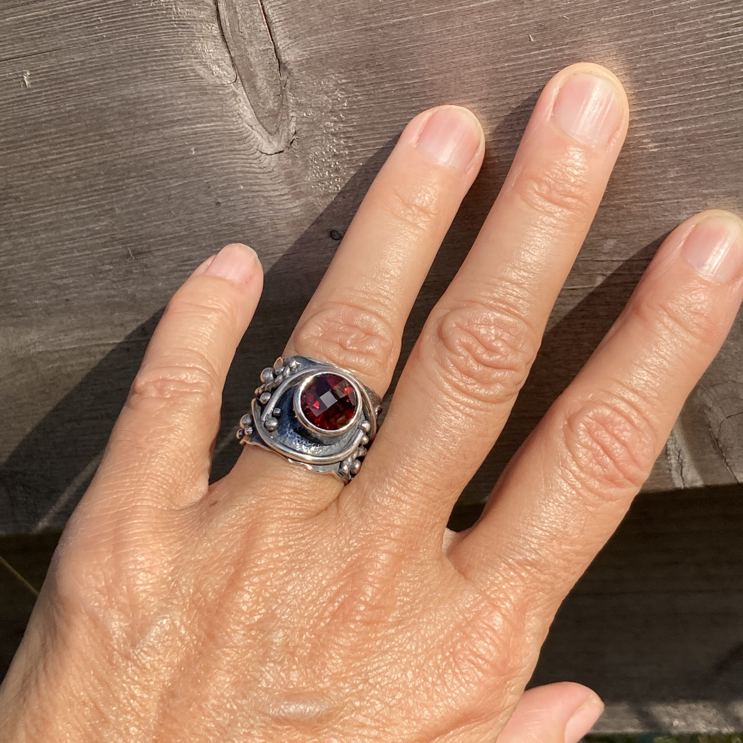 I hand-form, fuse, and texture each ring before heat-treating the Argentium to activate its germanium layer for brightness and tarnish resistance. Then I bezel-set the Garnet by hand. Finally, I darken and polish the surface to bring out soft highlights and the natural flow of the silver.