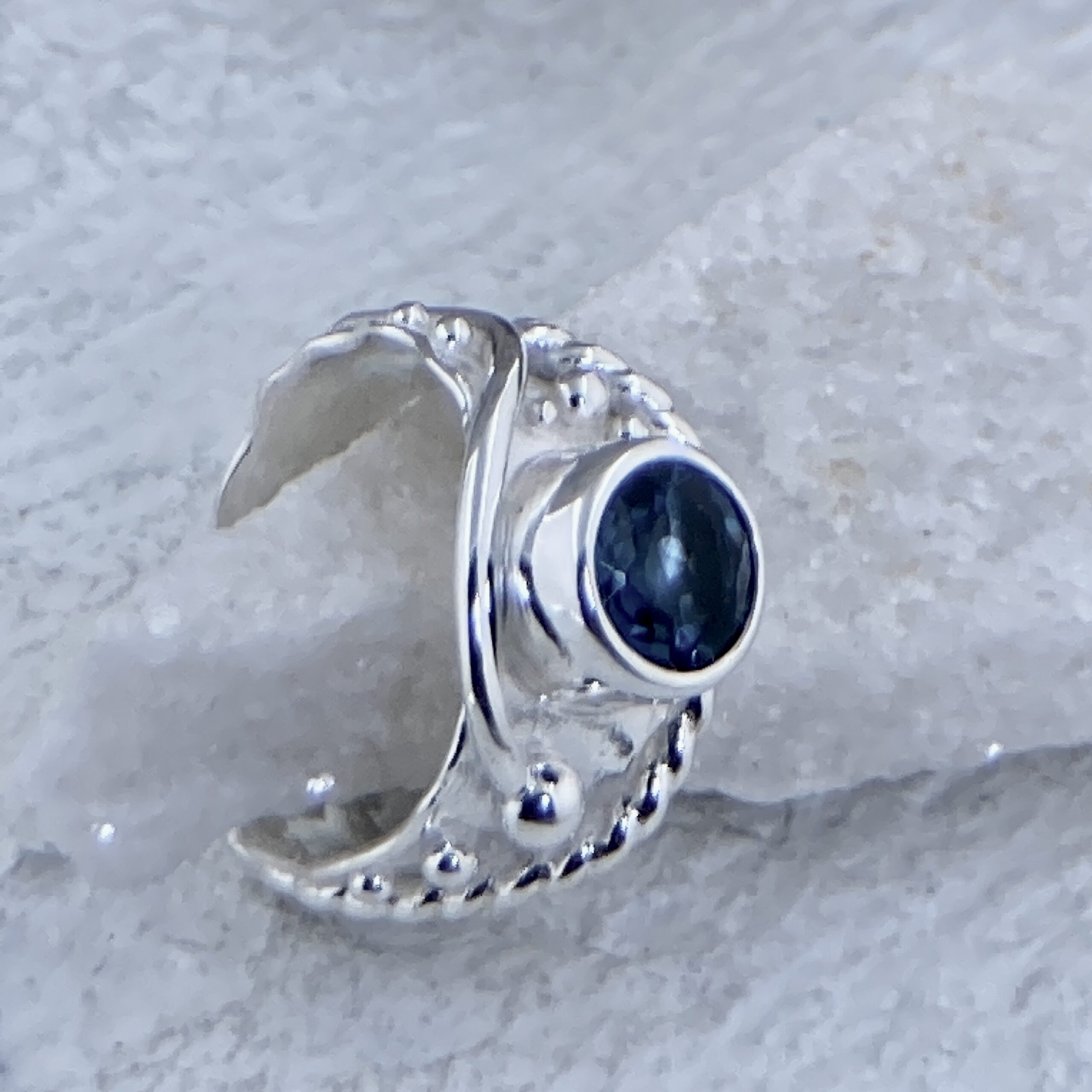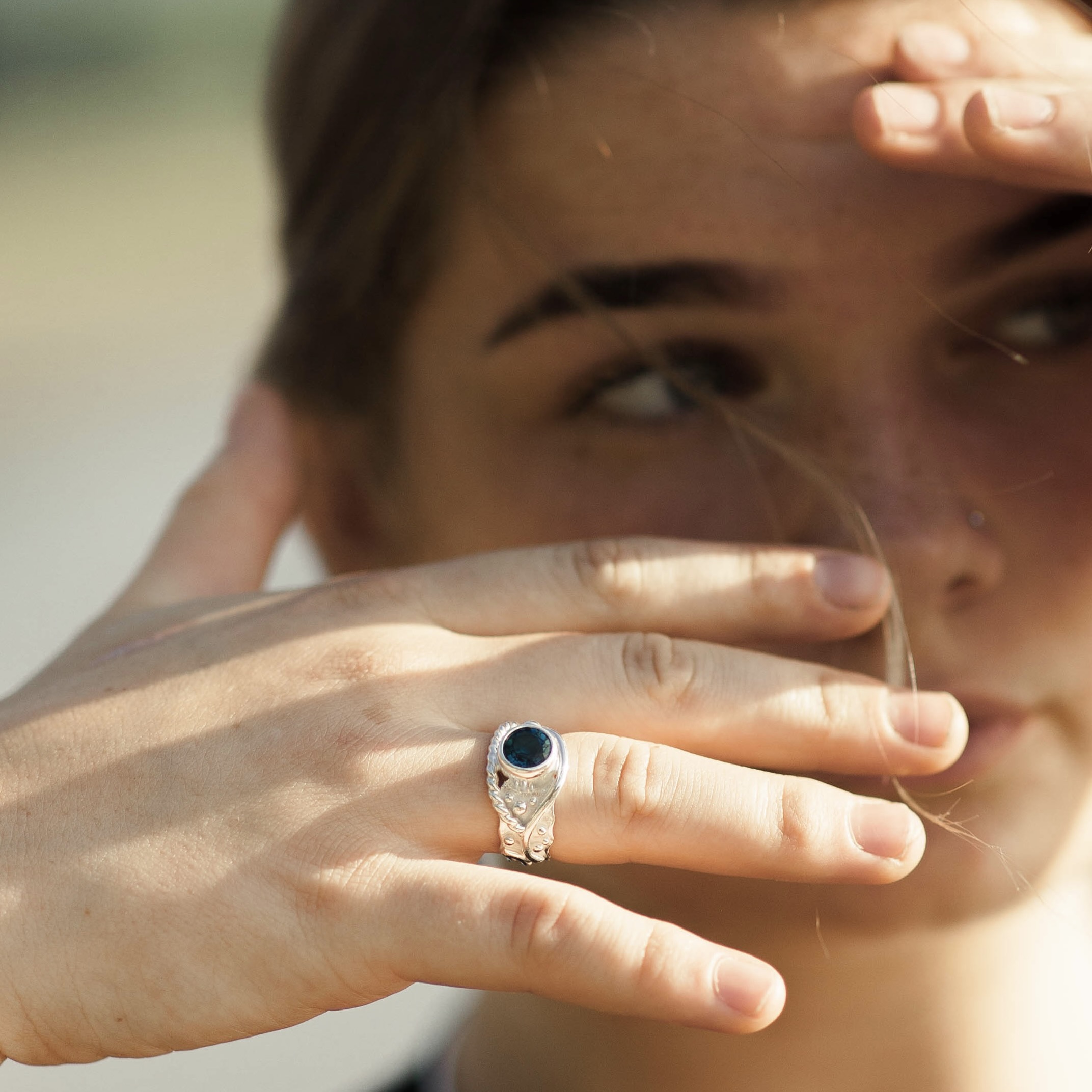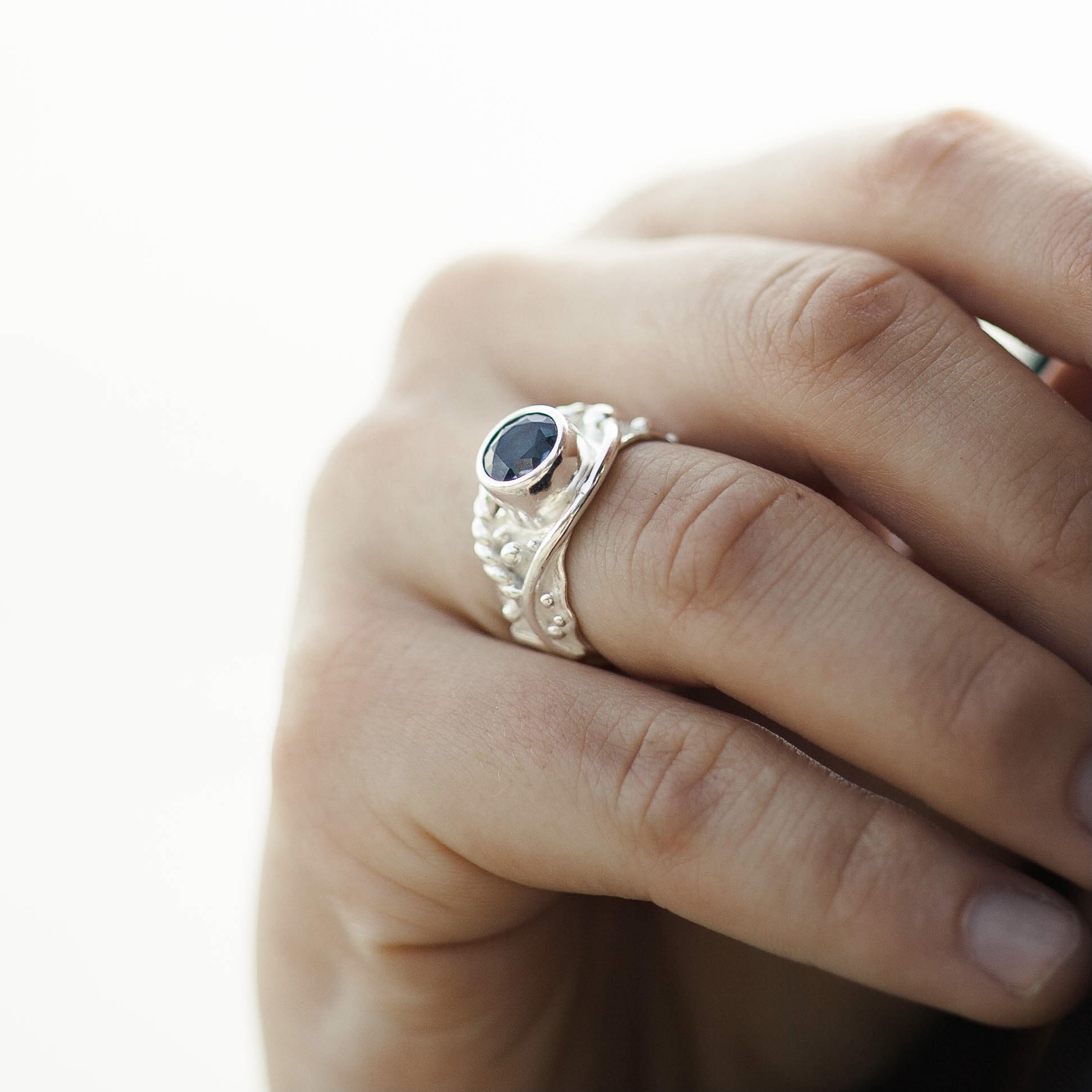 I heat and shape the silver until it softens and begins to move naturally. The metal folds, eddies, and settles into organic lines that define the Waves design. After refining and setting the gemstone, the ring takes on its final form — fluid, balanced, and alive.