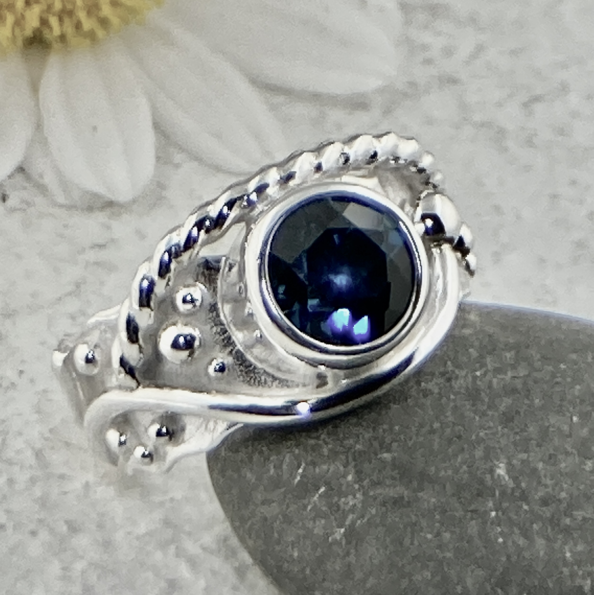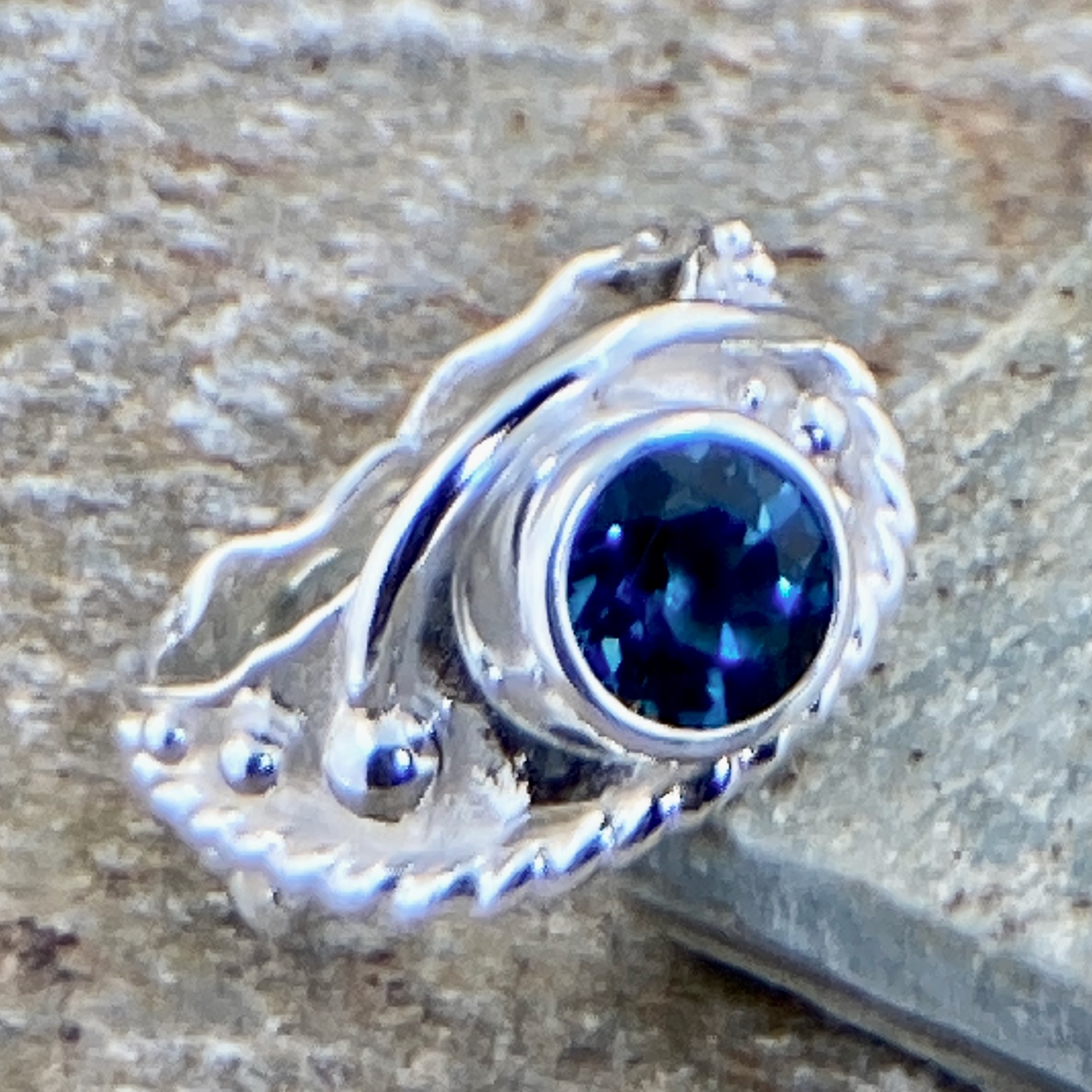 The London Blue Topaz Argentium Silver Ring Size 8.25 reflects the rhythm of moving water. The gemstone glows with ocean depth, resting in silver that seems to flow and turn like a living current.