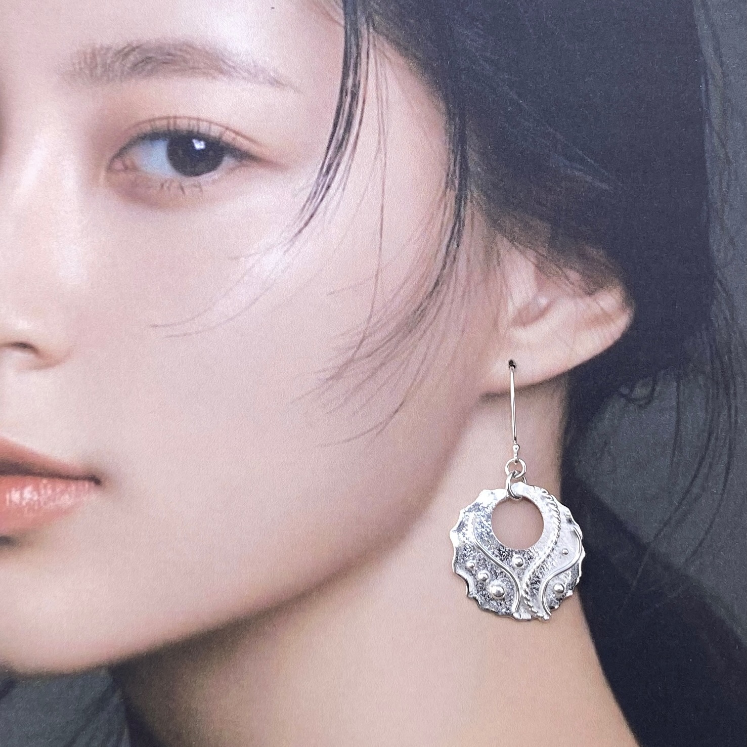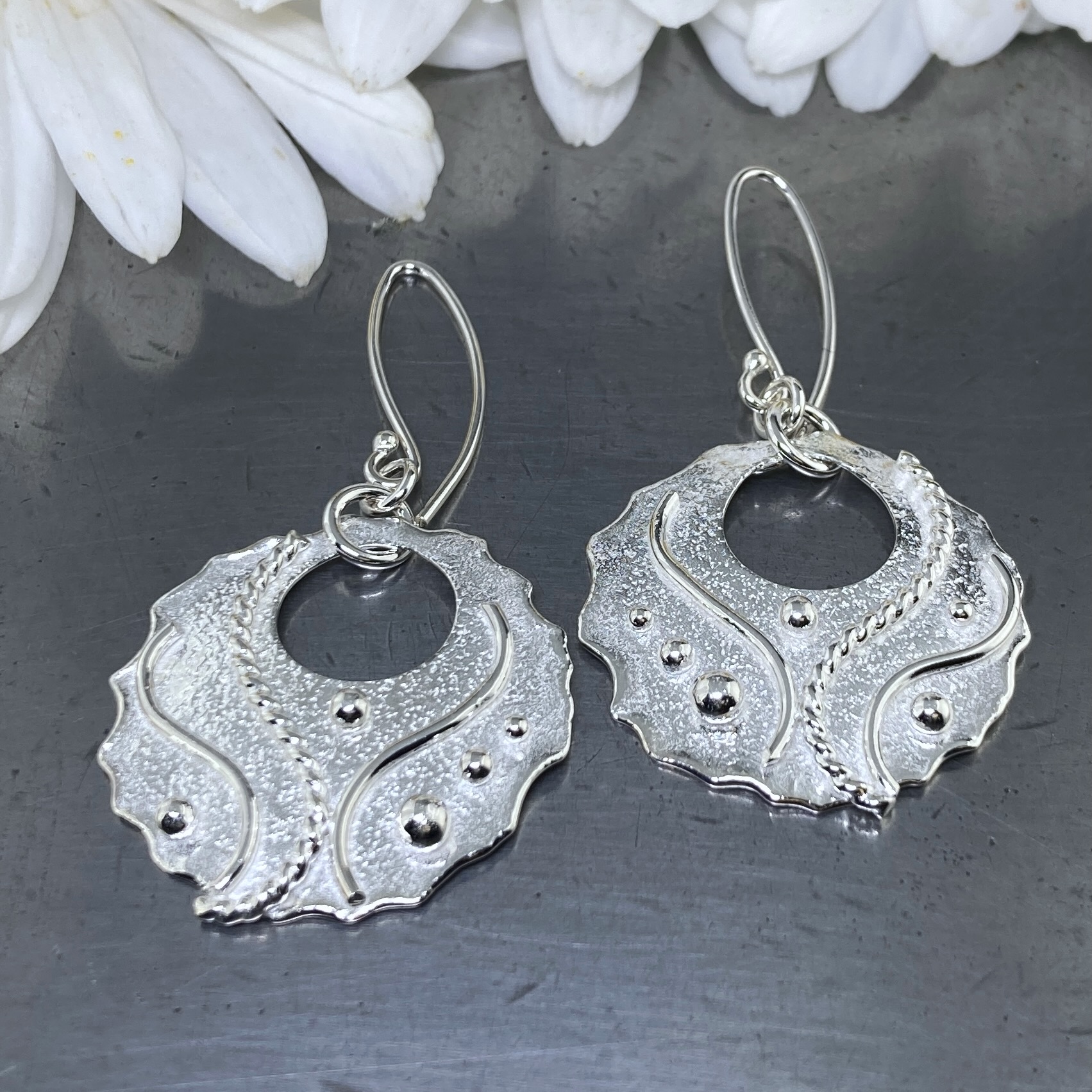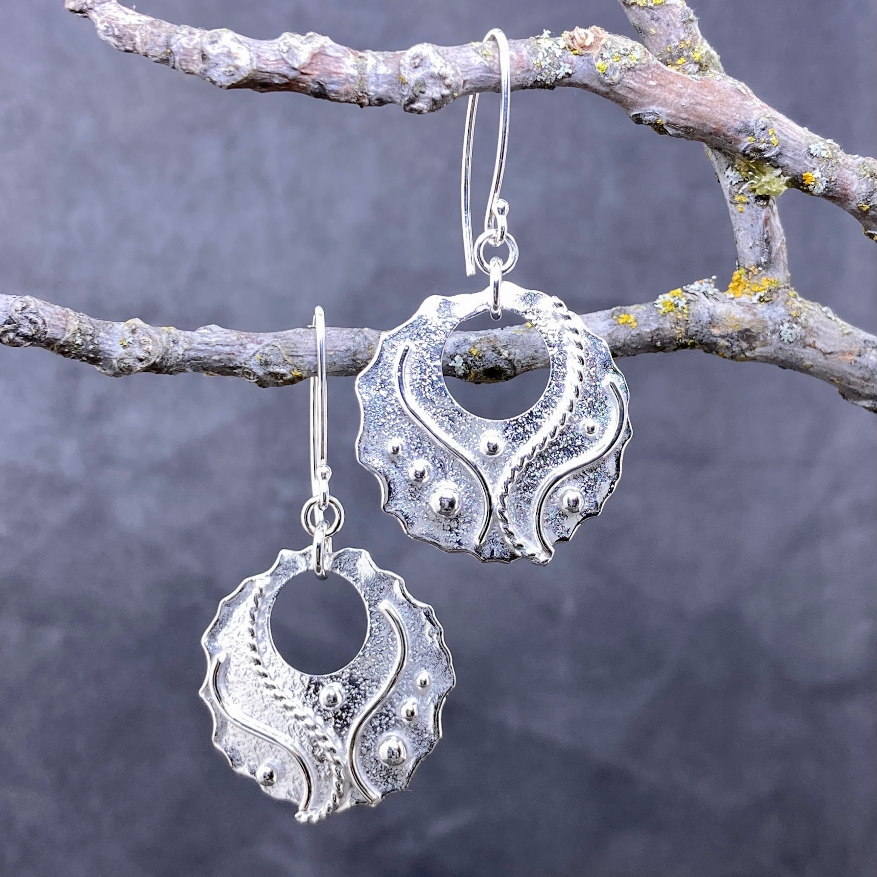 I make three sizes of this really beautiful design – one of my best sellers by far! Water design earrings, with the interesting cut-out and the gently waved edges. Solid Argentium silver – including the longer earwires – which are also handmade.