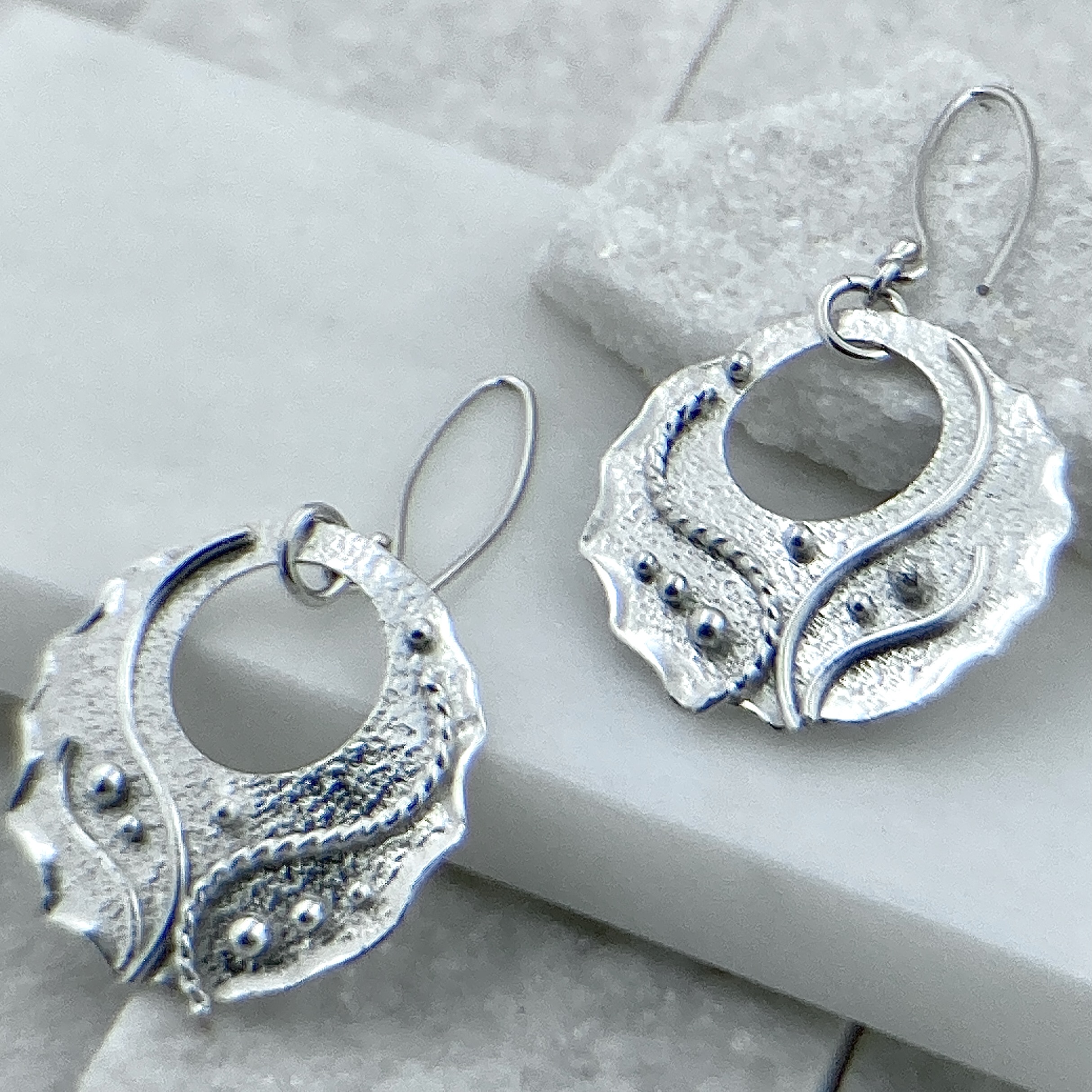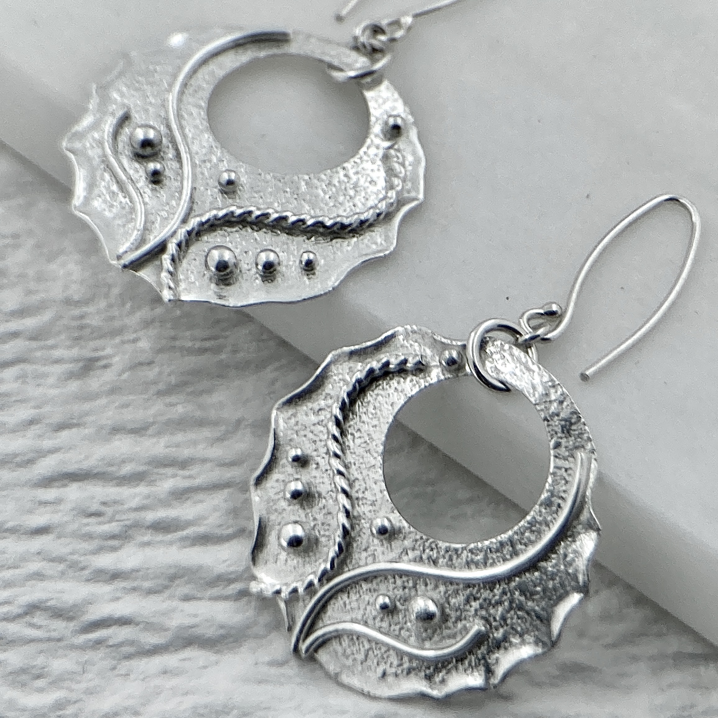 I make three sizes of this really beautiful design – one of my best sellers by far!  Water design earrings, with the interesting cut-out and the gently waved edges. Solid Argentium silver – including the longer earwires – which are also handmade.