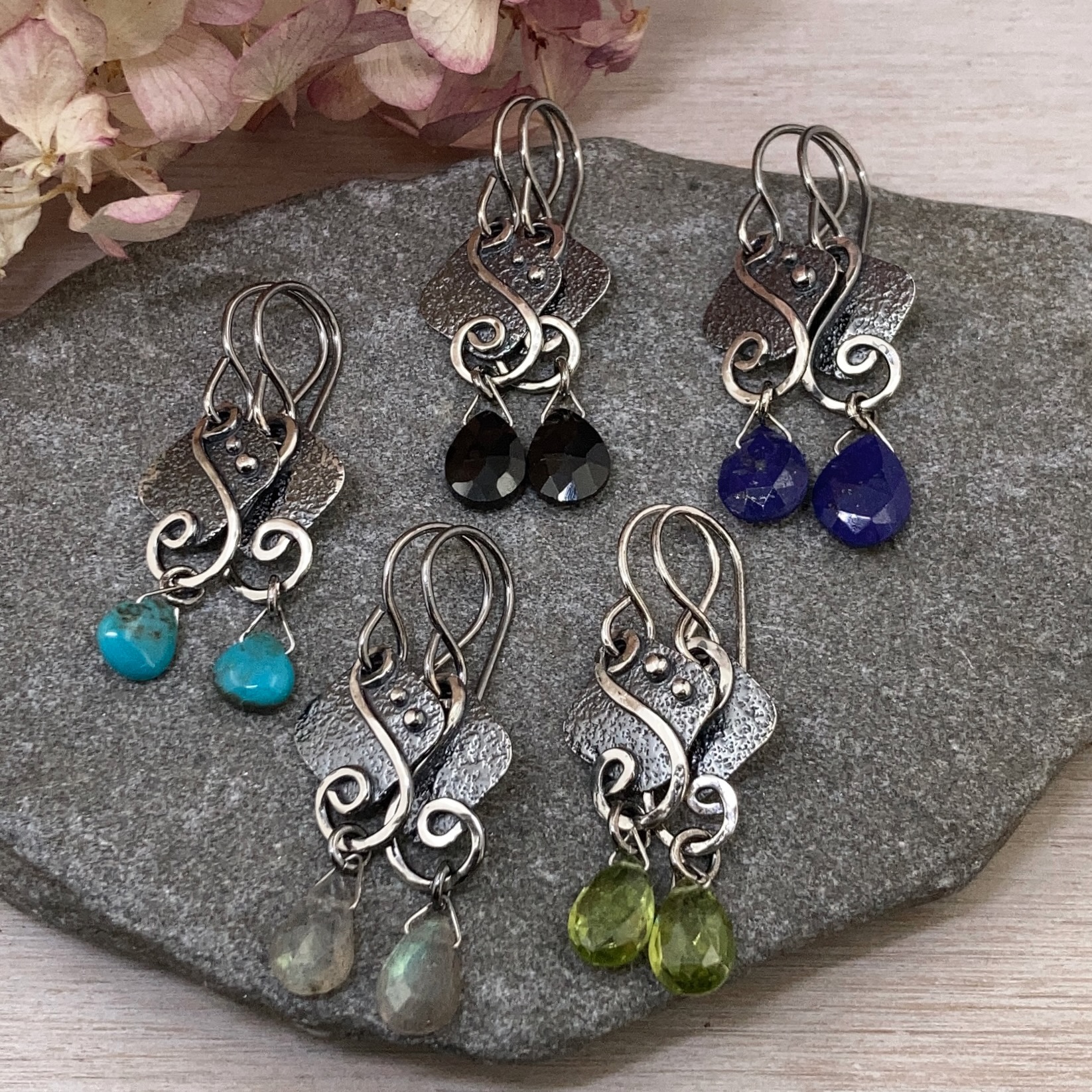 gemstone earrings – diamond waves – antique Argentium silver – small