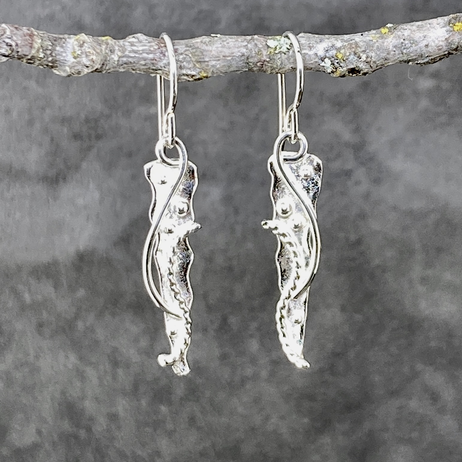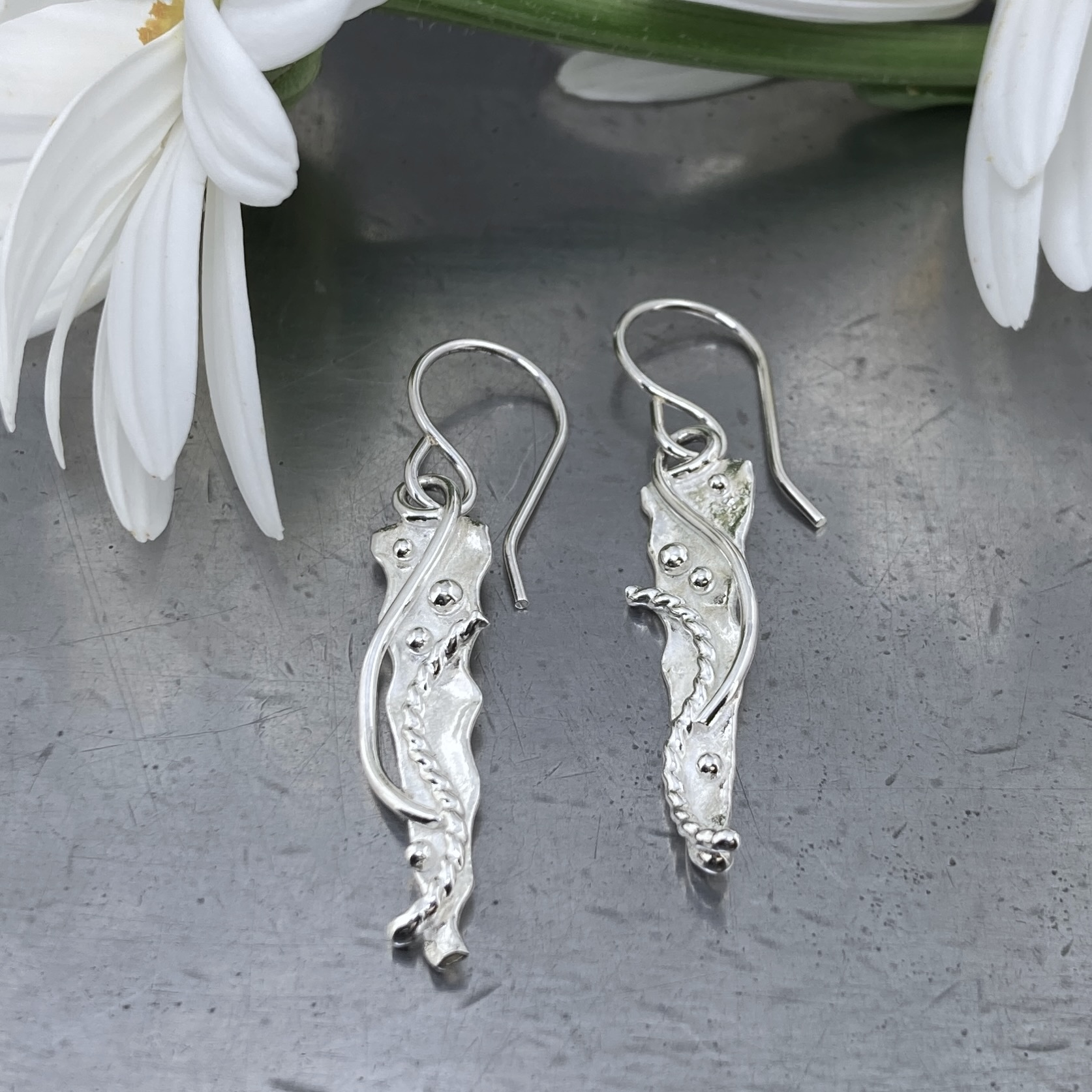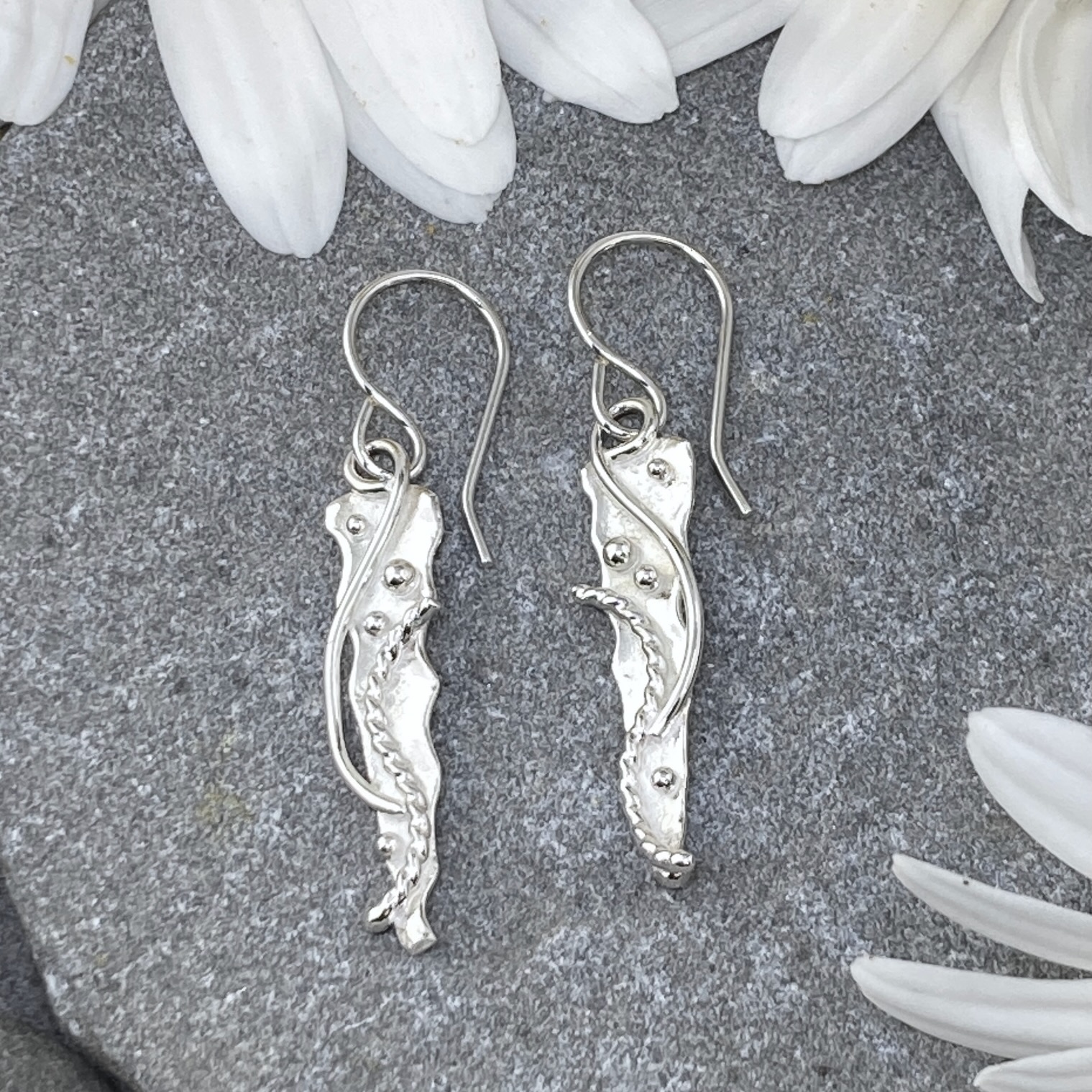 Water design is the plate of Argentium silver with the edge gently melted and then silver pebbles and waves fused on. This earring is a small icicle shape.