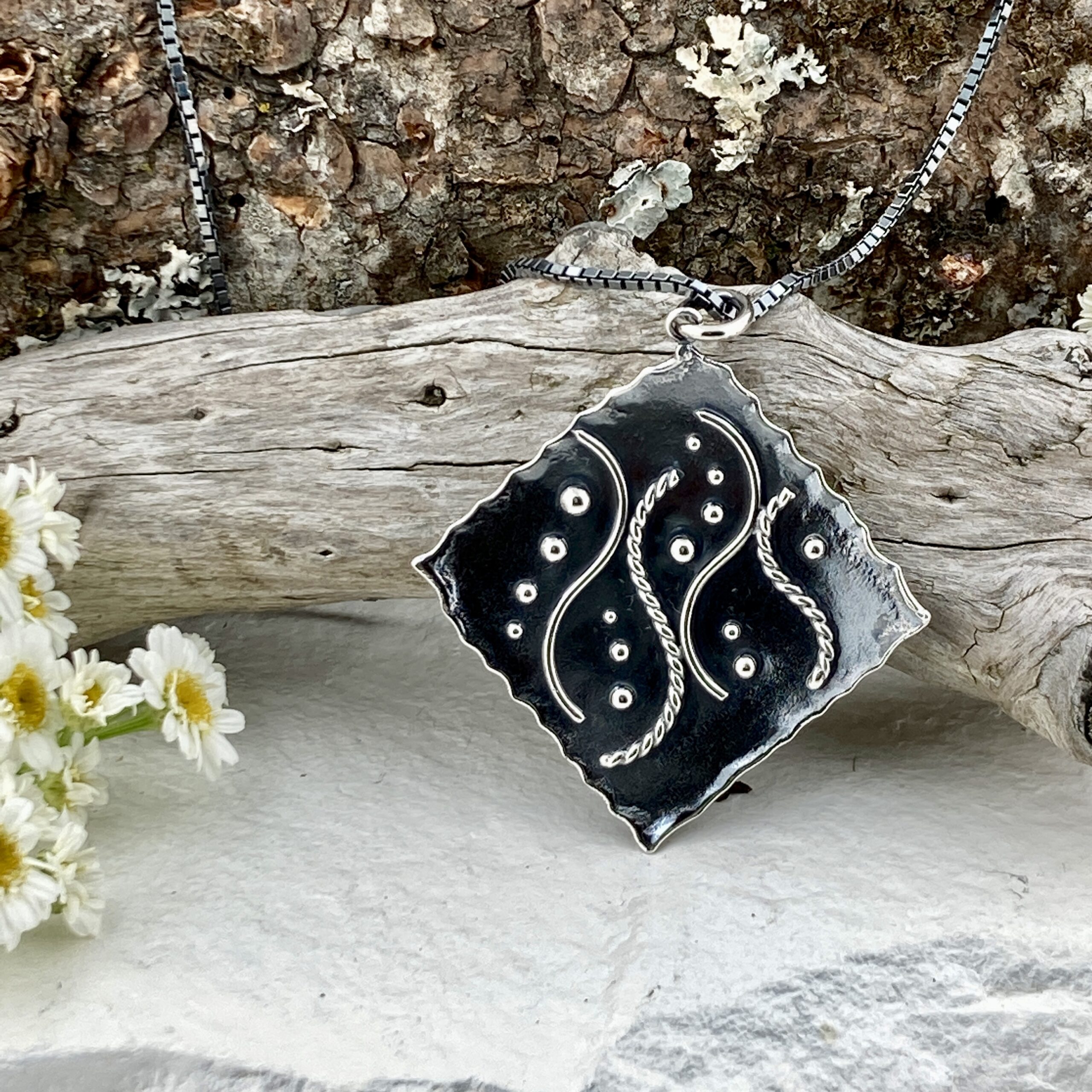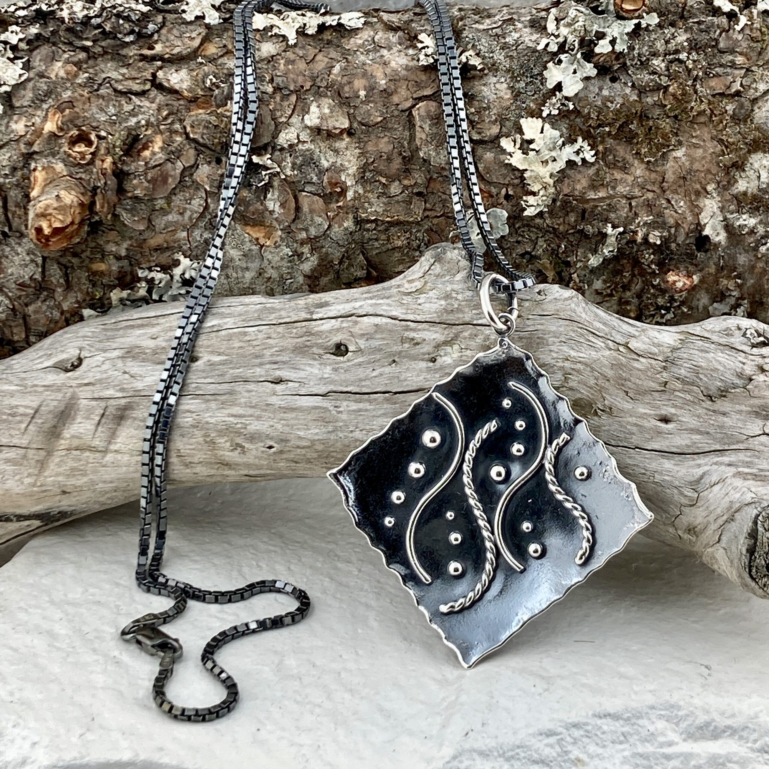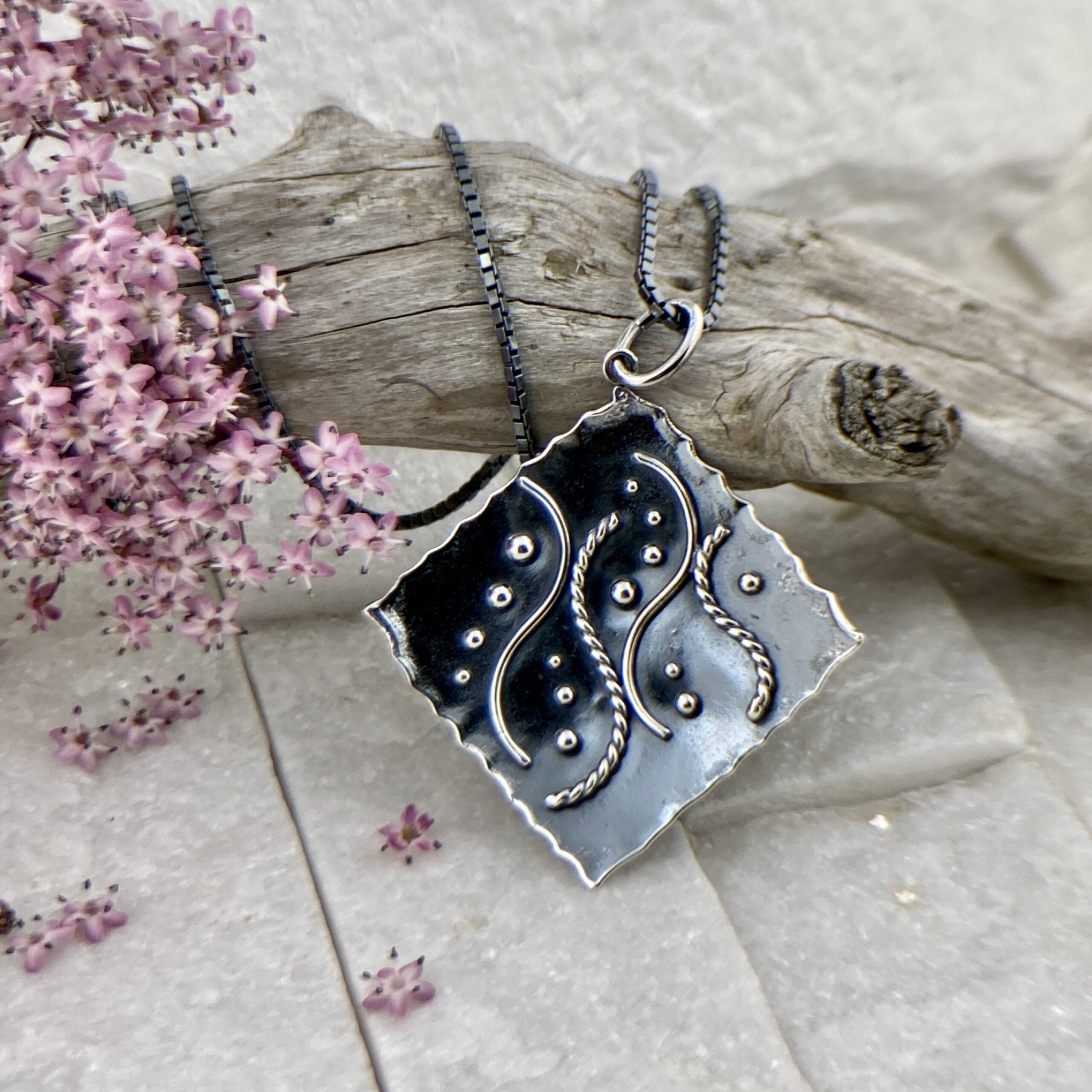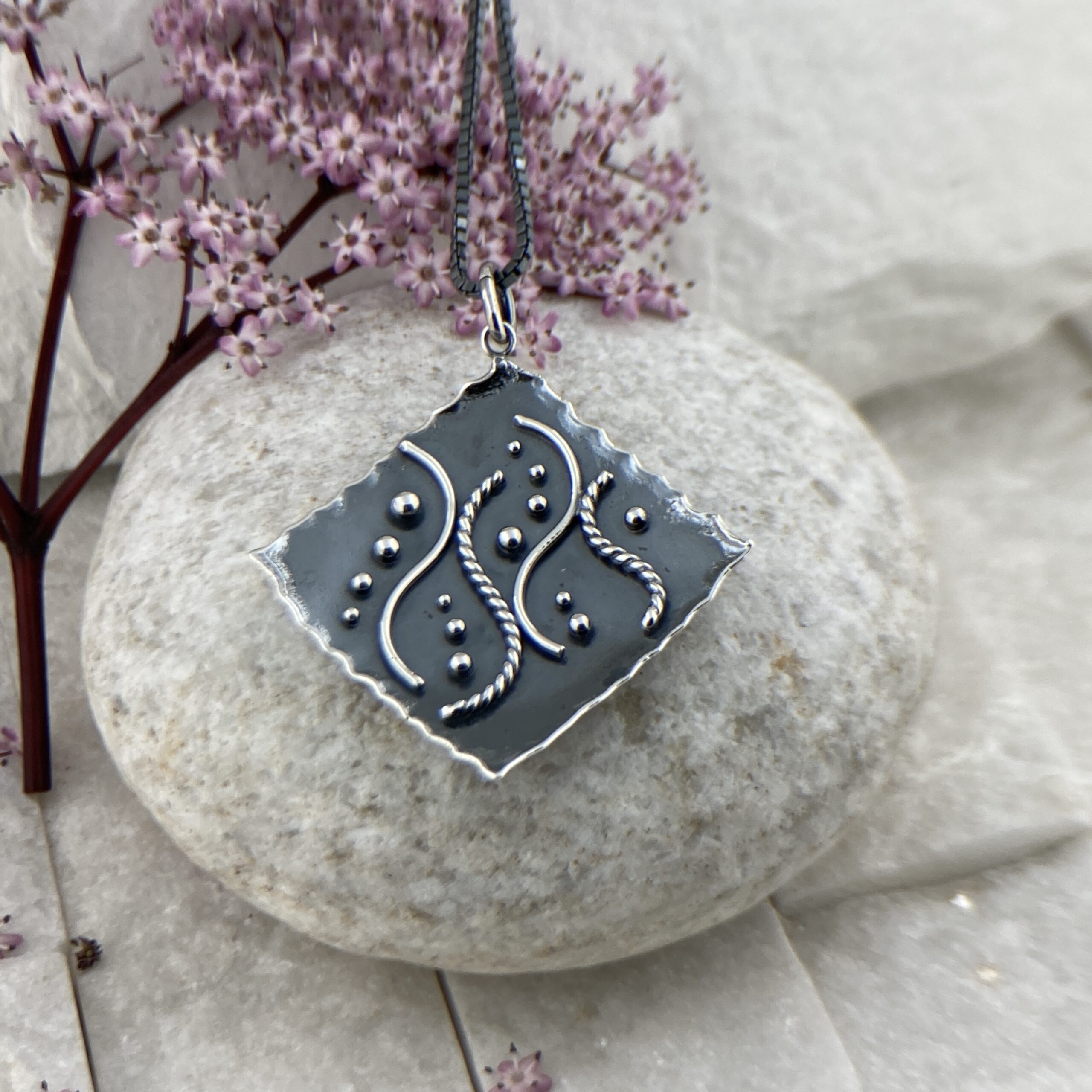 The Argentium silver has been textured, cut to shape, edges rolled, waves and granules fused on, bail soldered on, polished, work hardened and baked.
