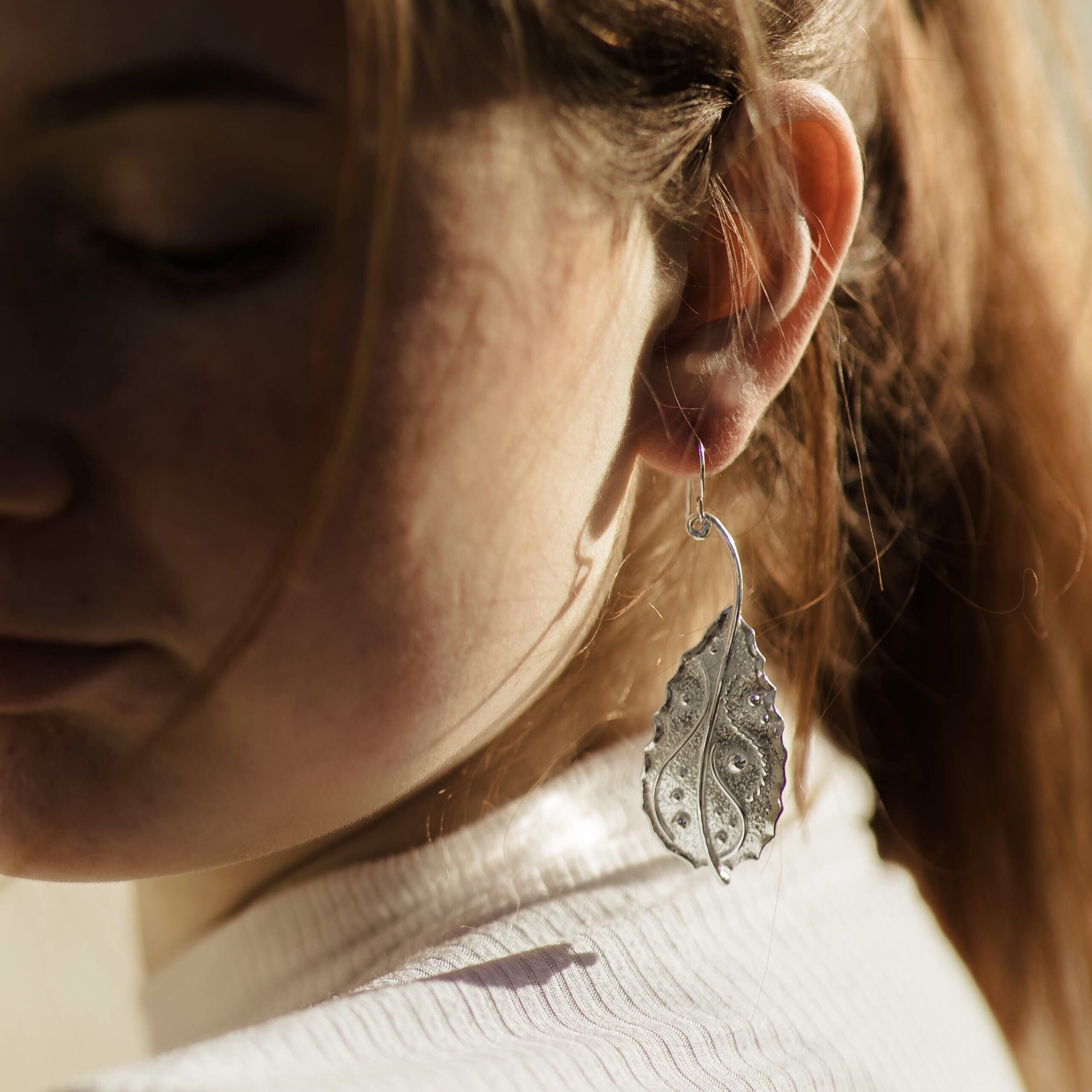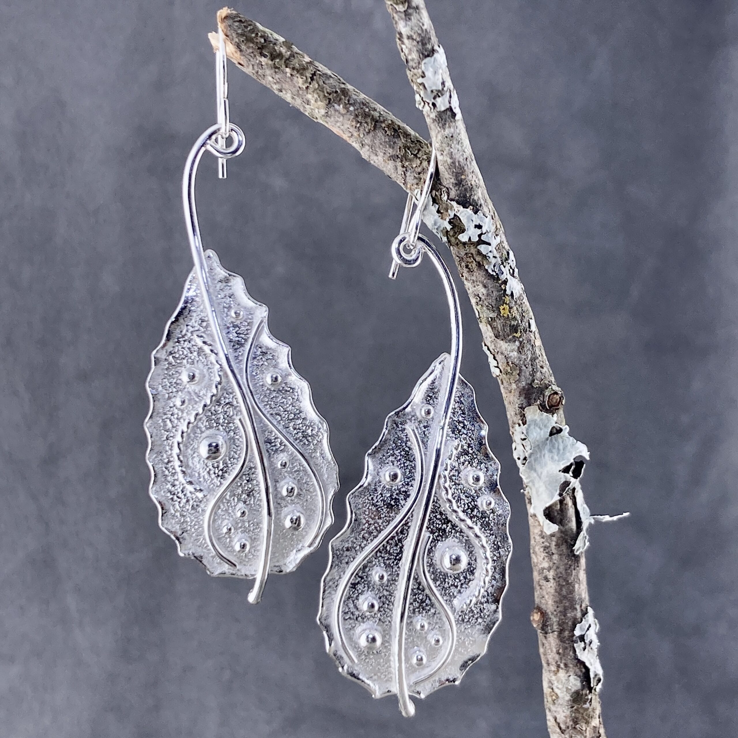 A large paddle shaped water design earring. Â I melt the edges for a fluid look. Â And then add the waves and granules.