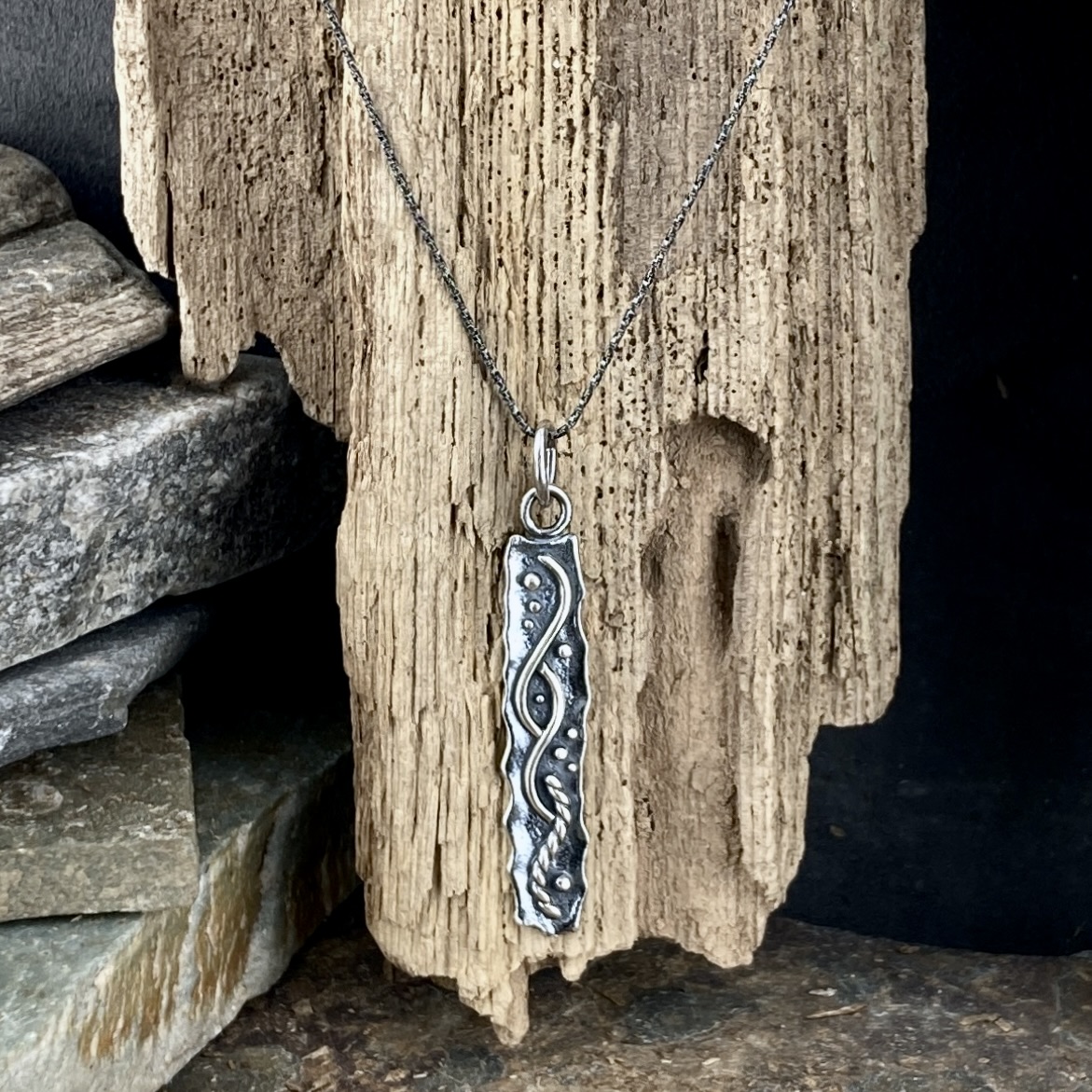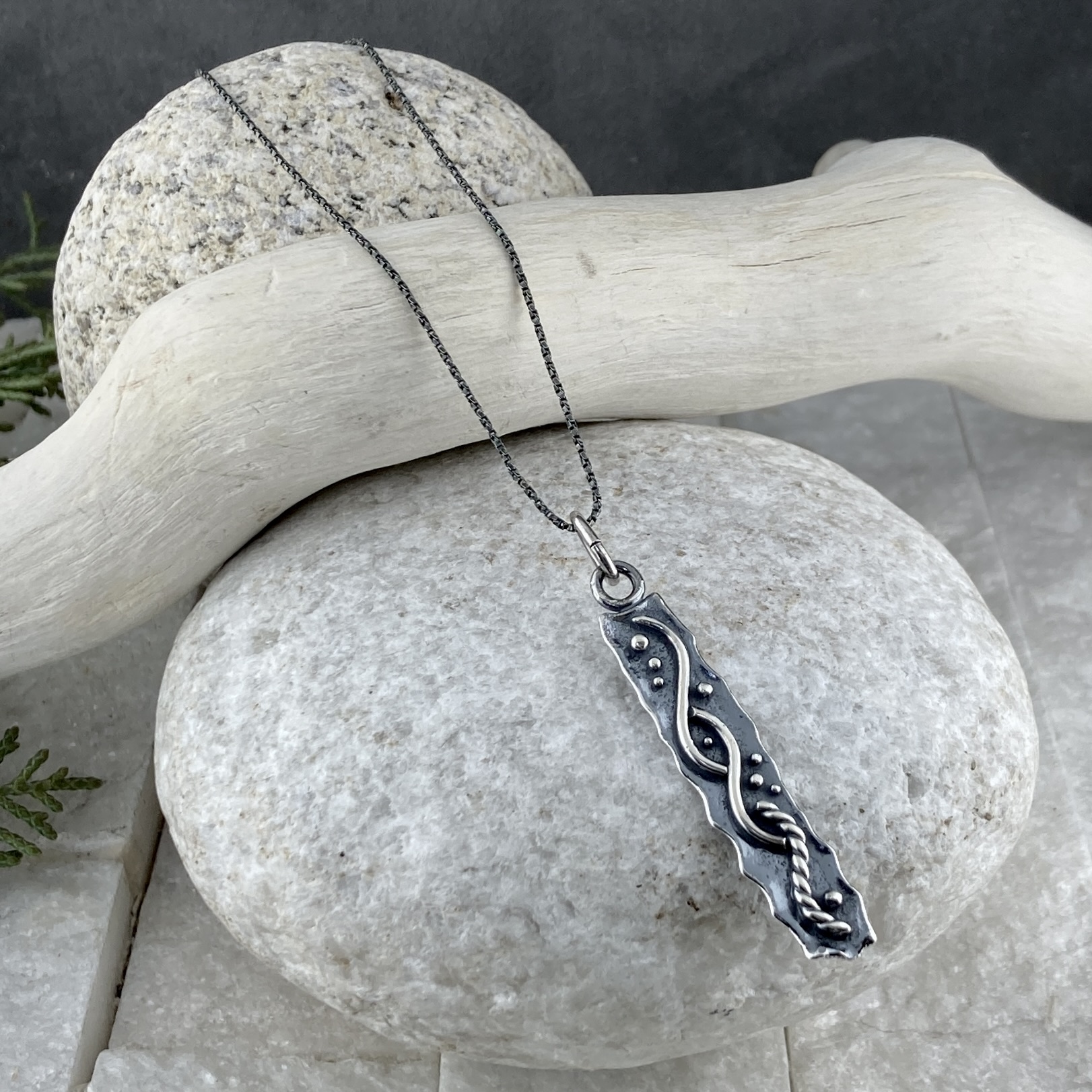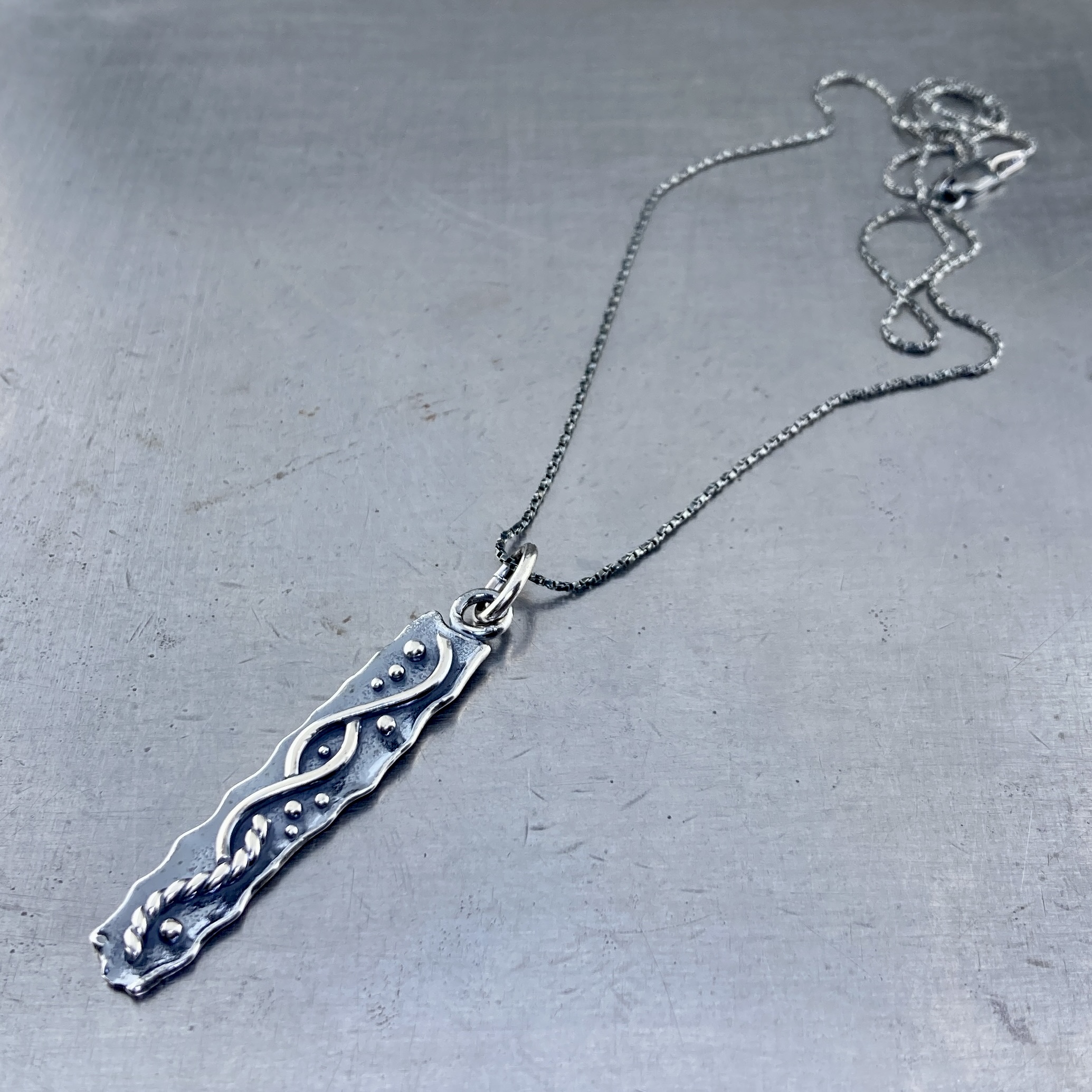 The Argentium silver has been textured, cut to shape, edges rolled, waves and granules fused on,  bail soldered on, polished, work hardened and baked.