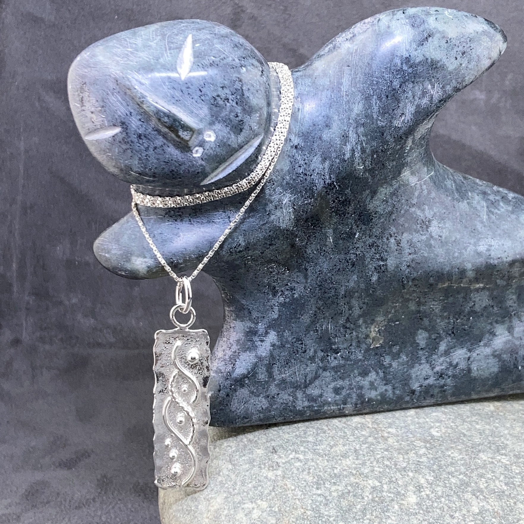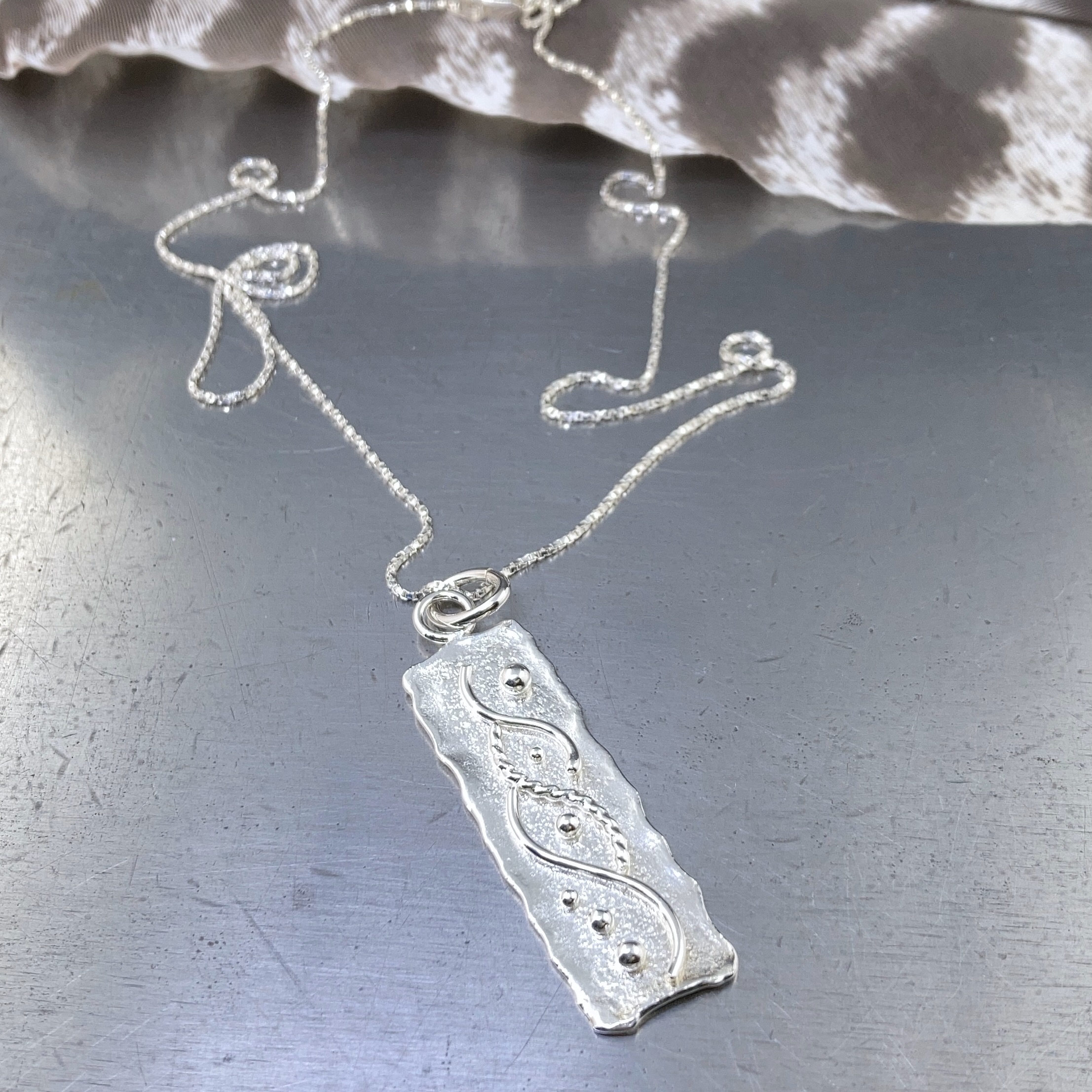 The Argentium silver has been textured, cut to shape, edges rolled, waves and granules fused on,  bail soldered on, polished, work hardened and baked.