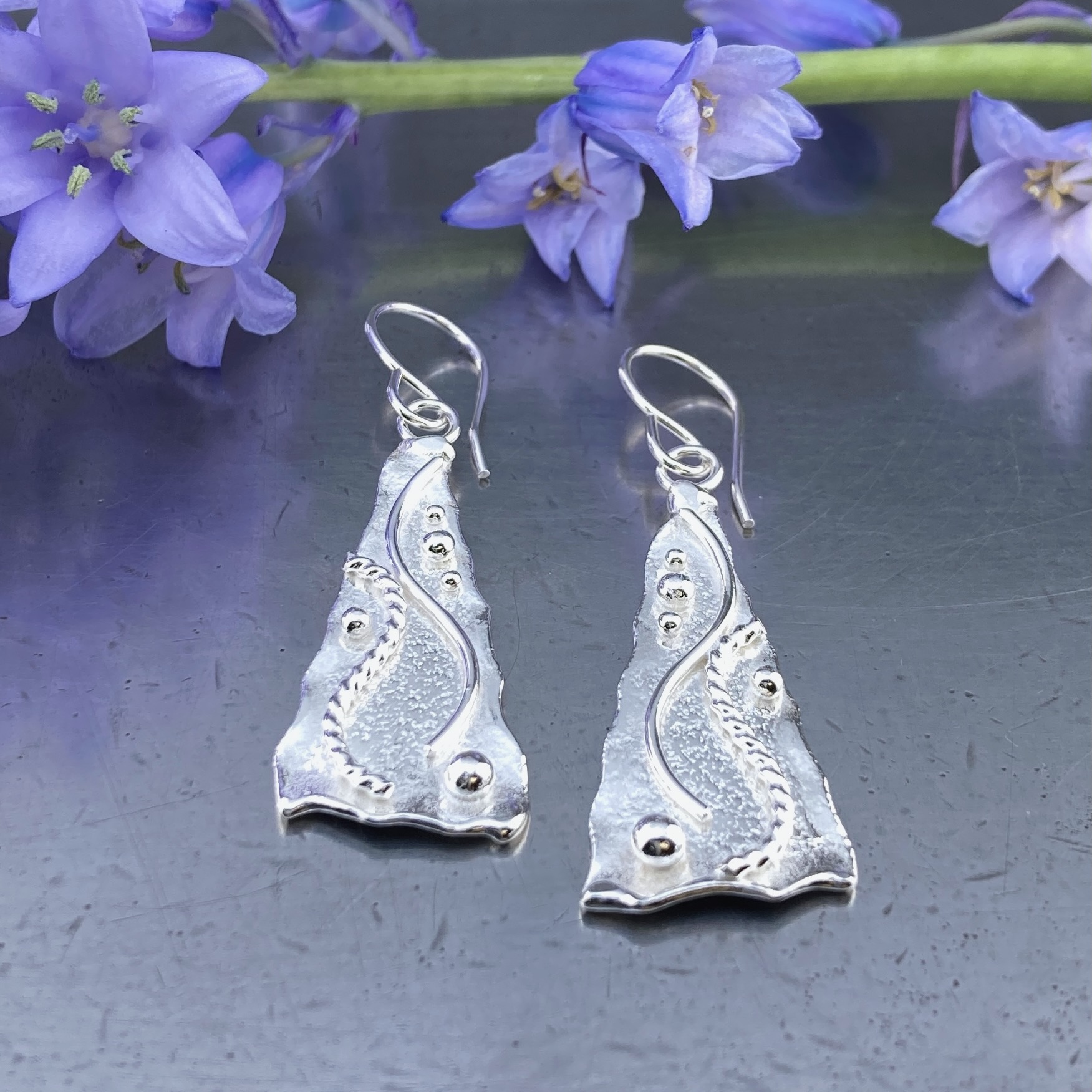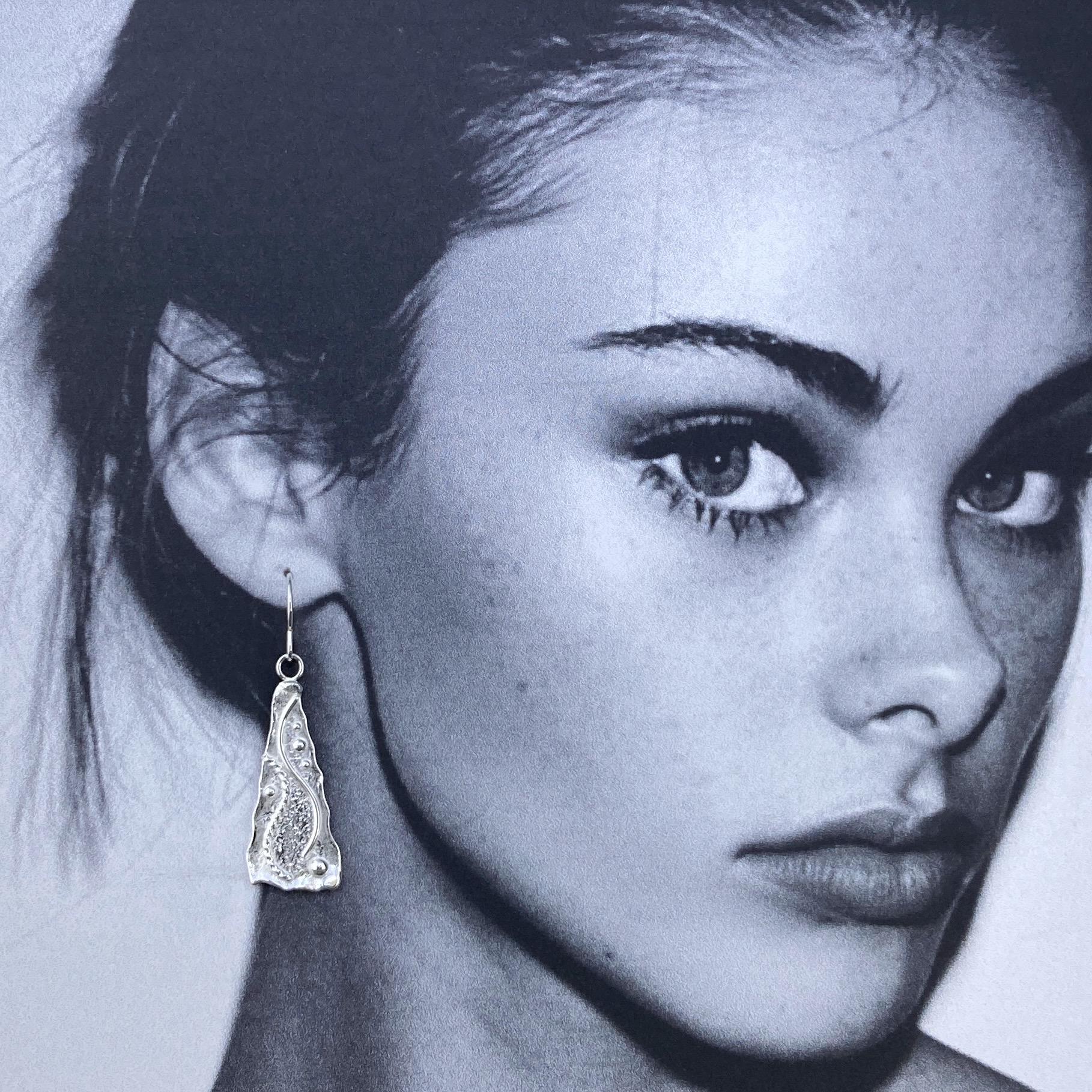 Earrings are 4.7 cm long by 1.6 cm wide.  They weigh 4.9 grams. These are the medium size.