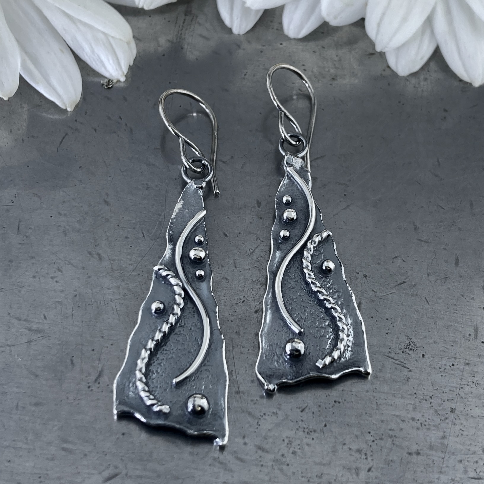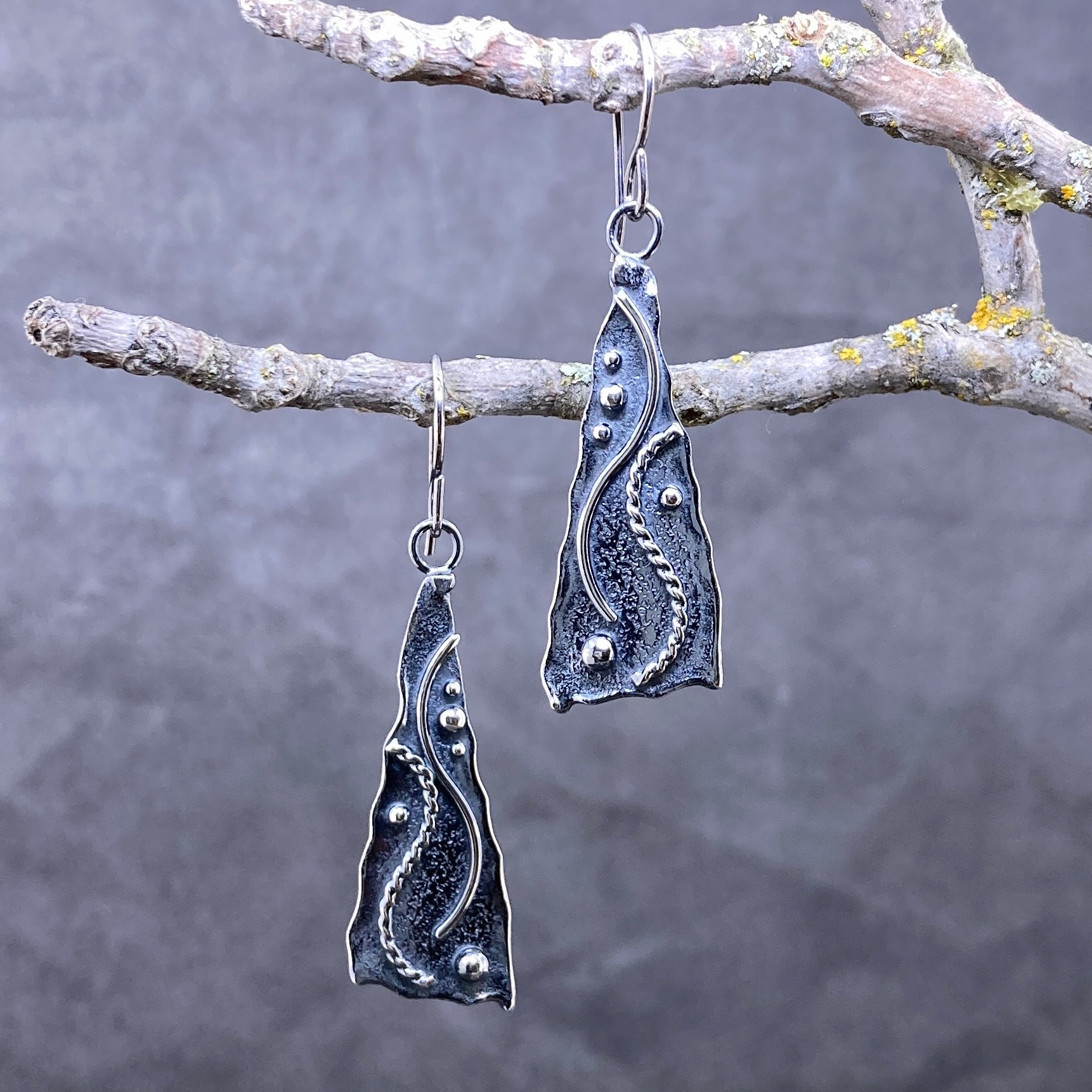 A moderate size, sail shape earring.  So easy to wear! I roll the edges with my acetylene torch, then fuse silver waves and pebbles to make a beautiful water feature.