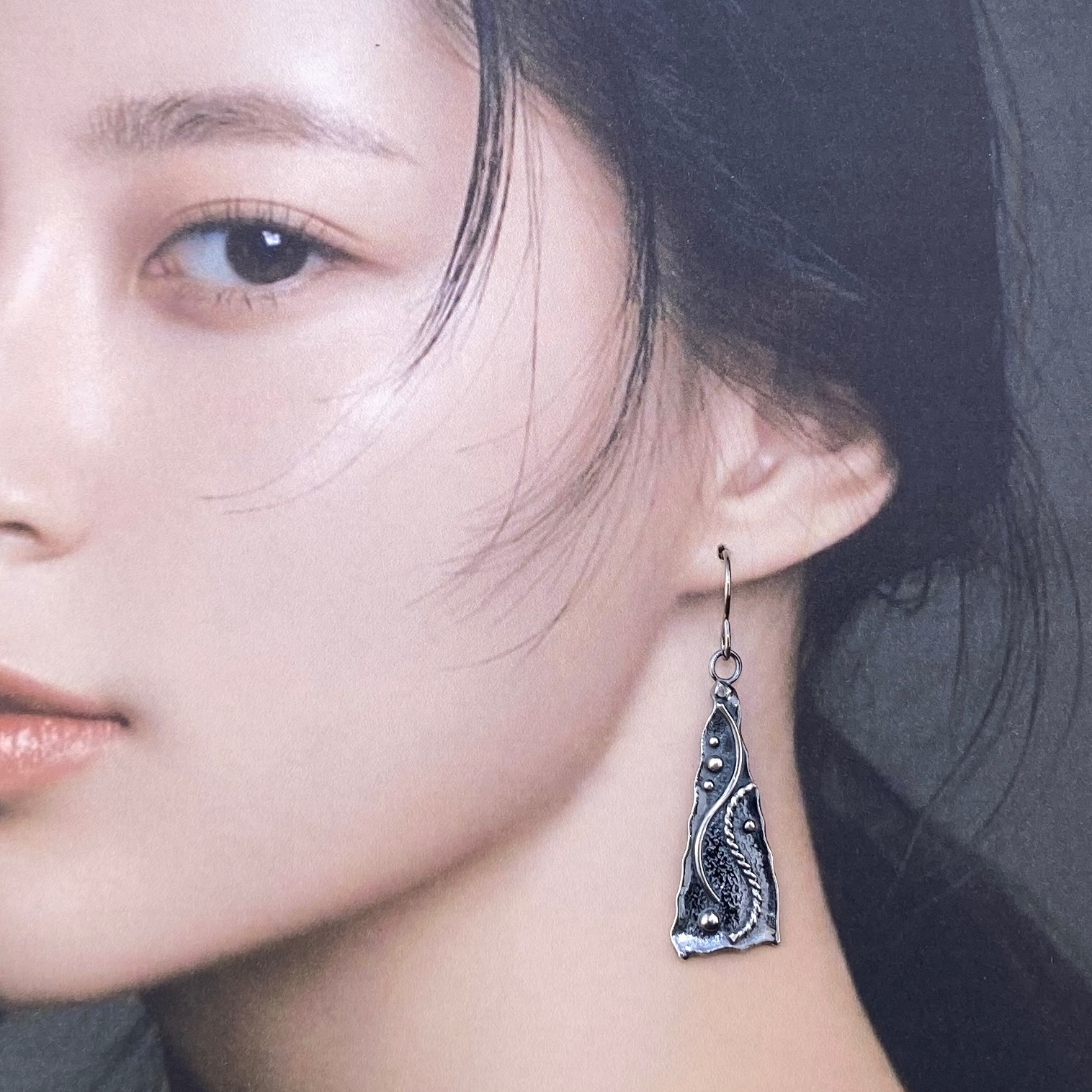 water design earring – sail shape – antique finish.  Hand made with Argentium silver.