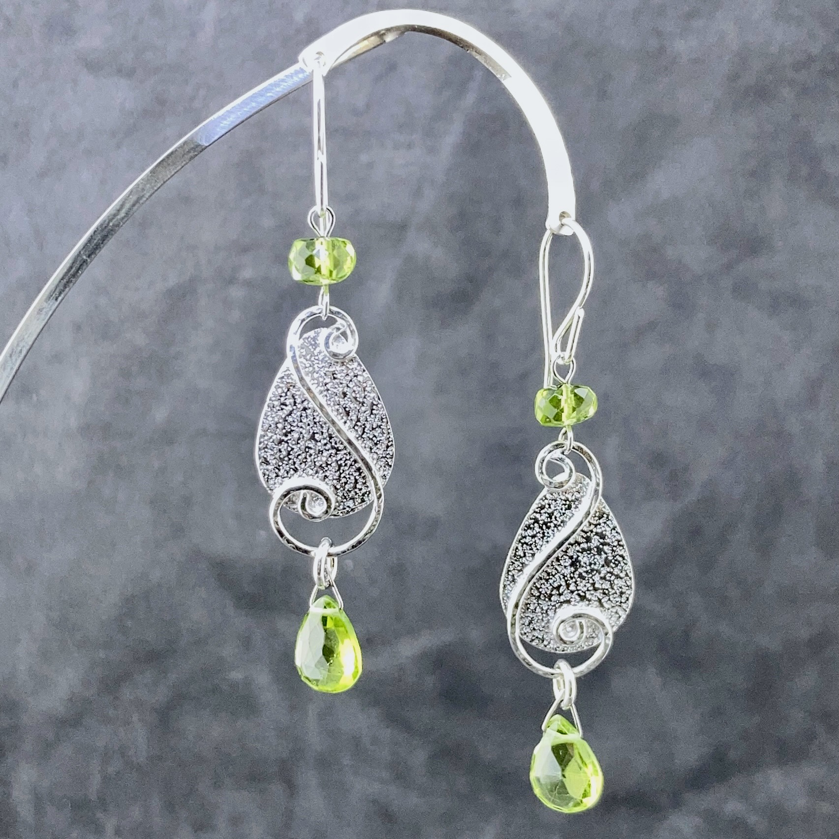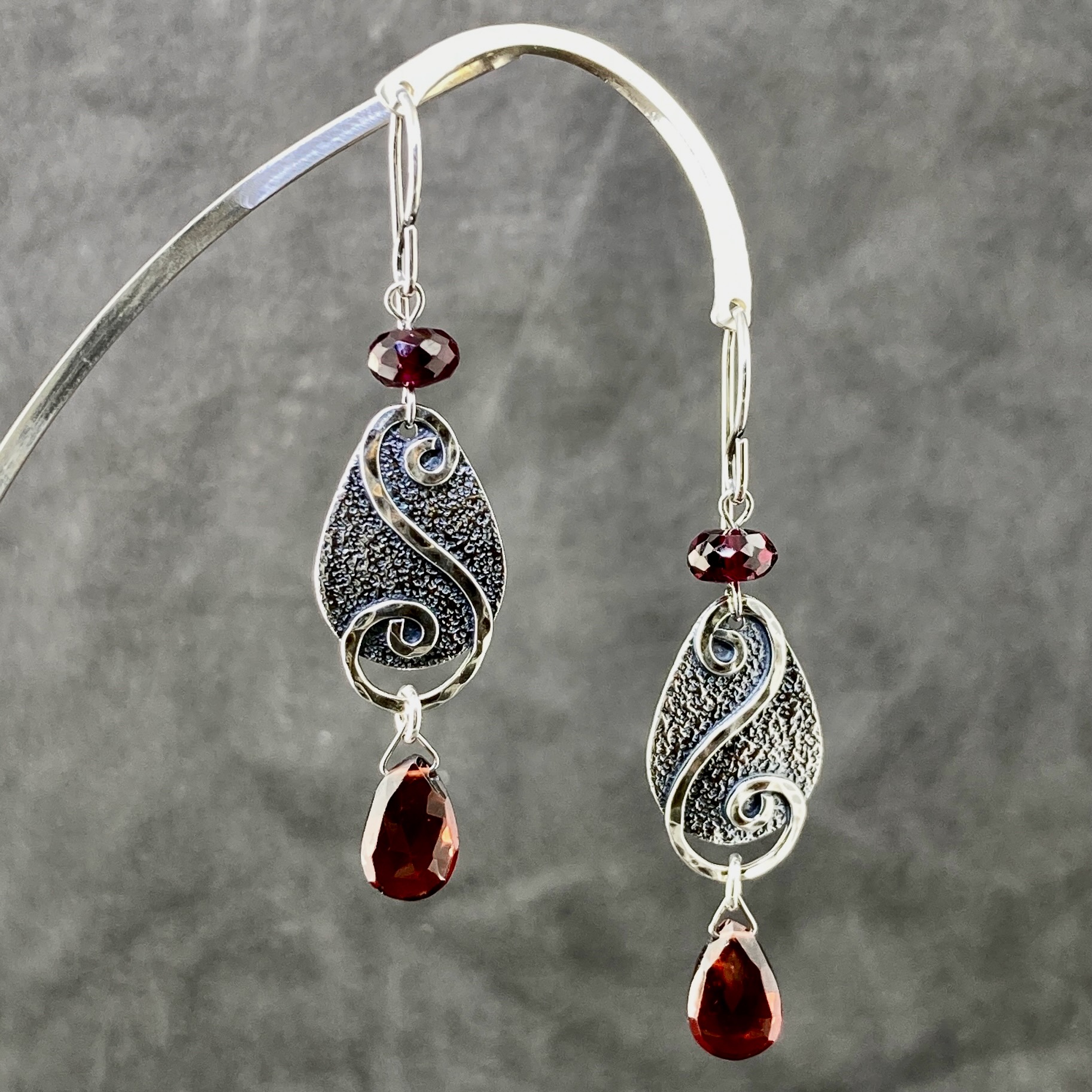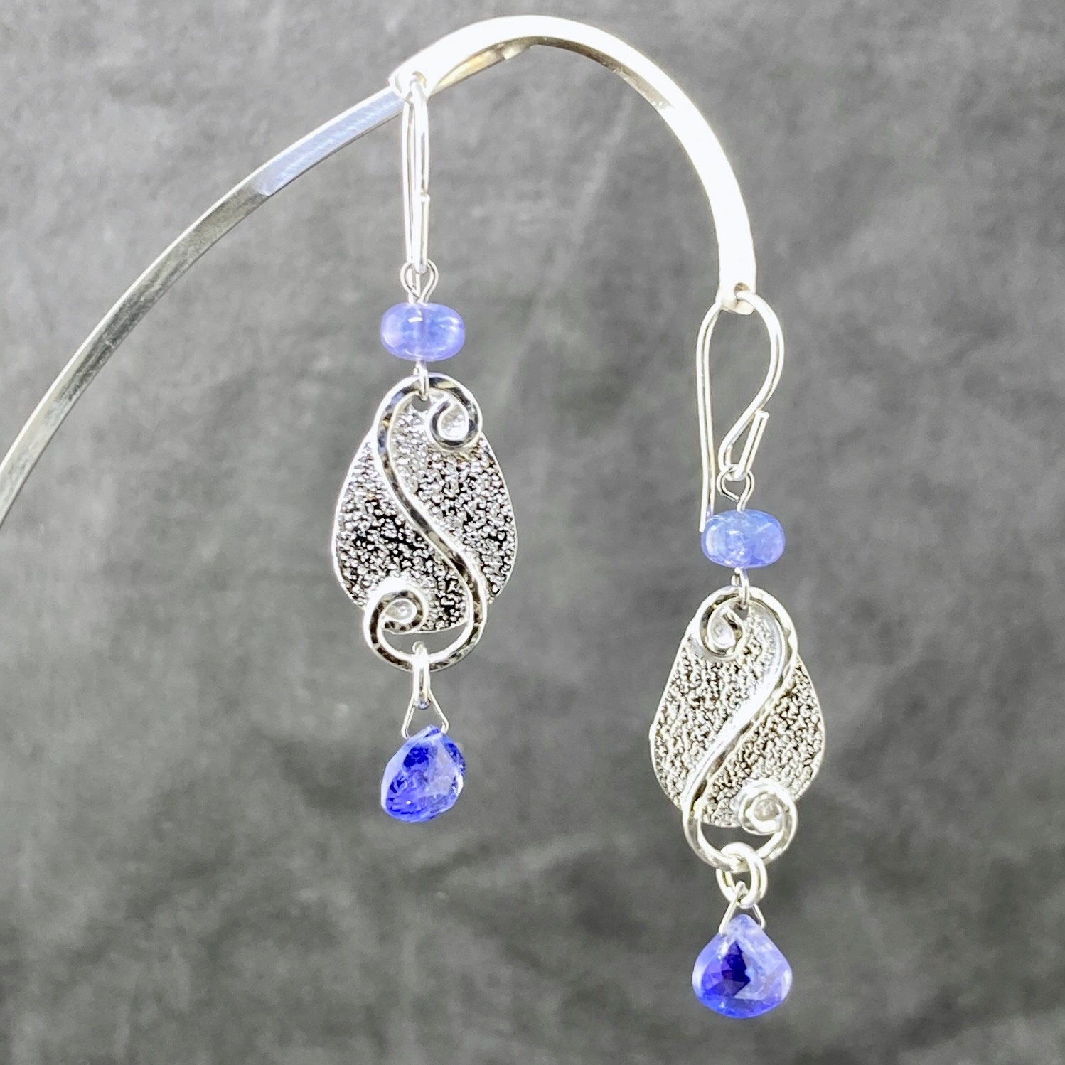 A nice teardrop shape earring with two gemstone accents – some shiny and some antique.  All handmade and all solid Argentium silver.  Accent gemstones are Tanzanite, Garnet, Peridot and Swiss Topaz.