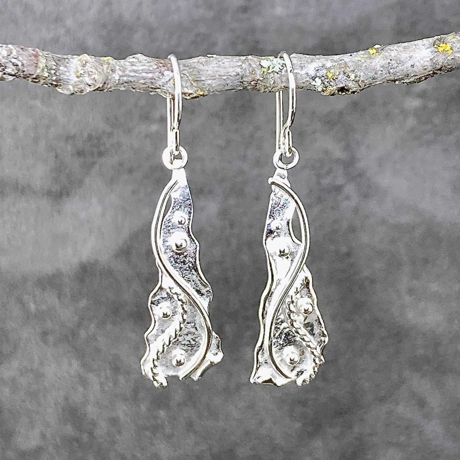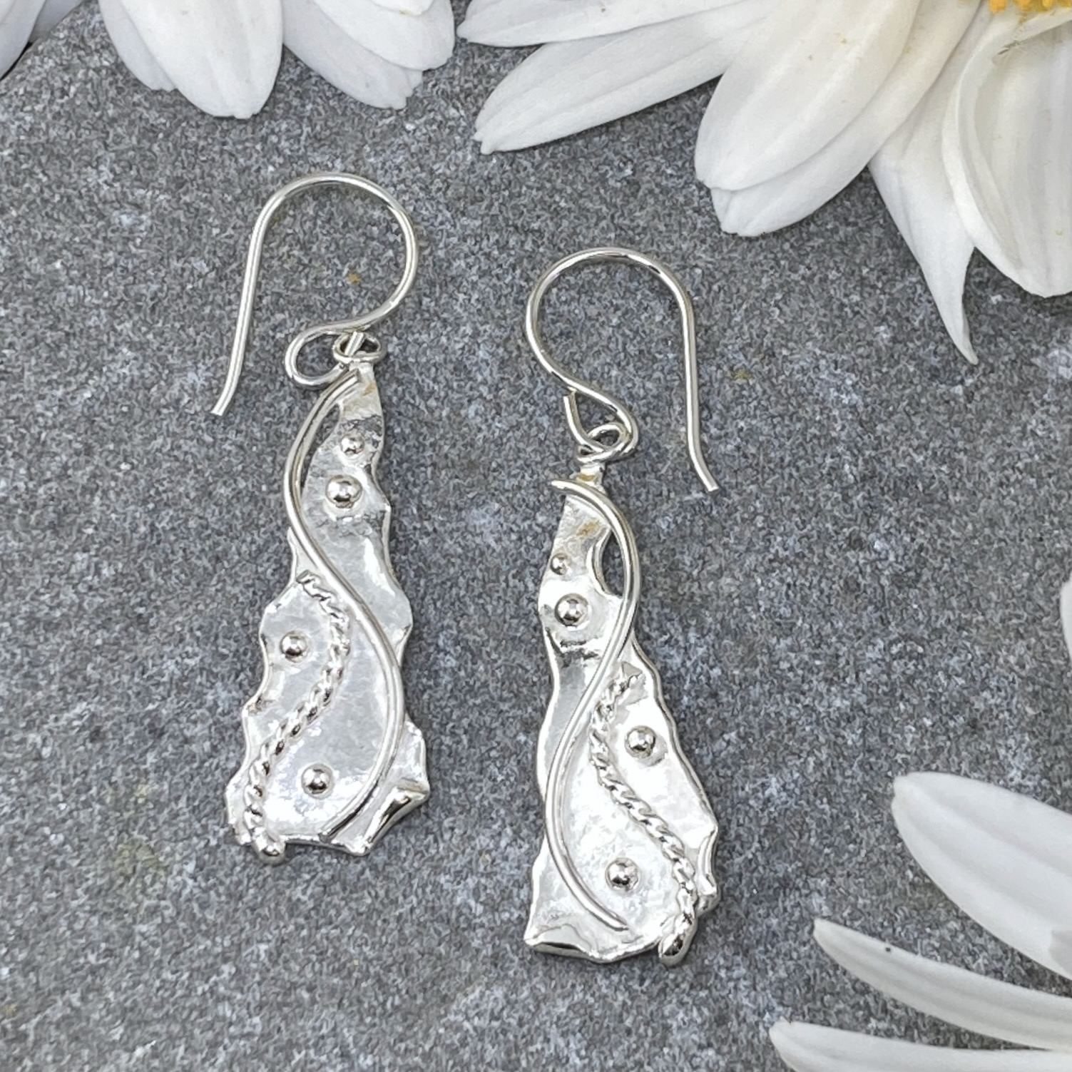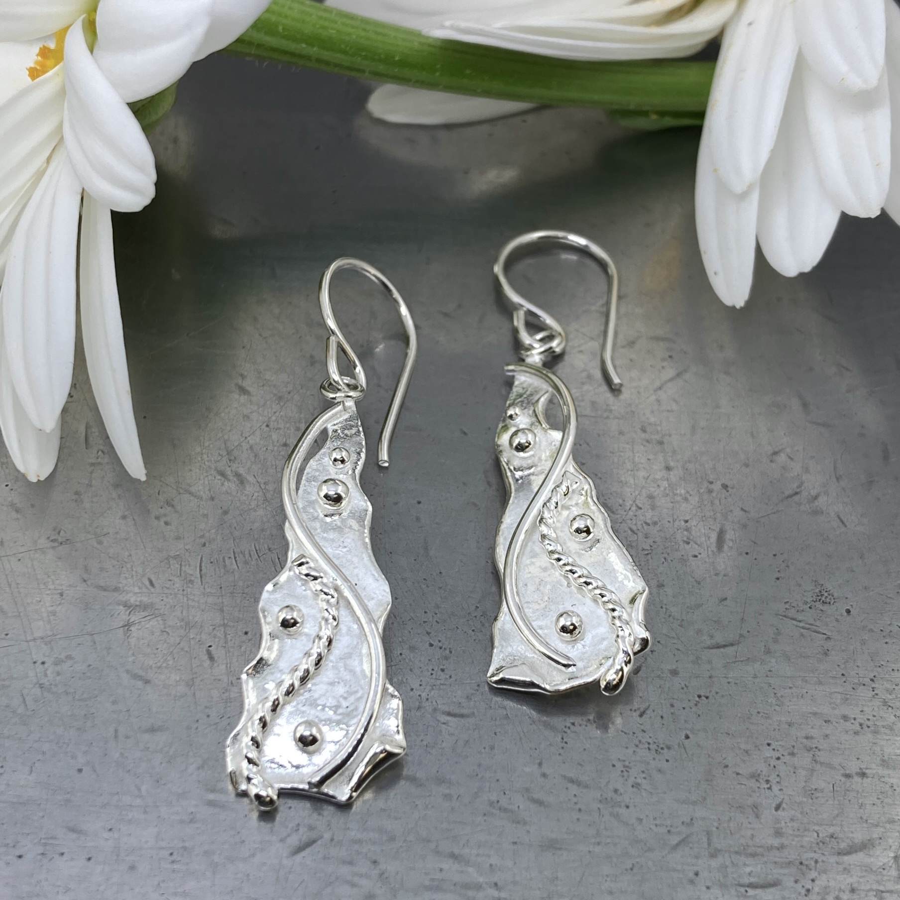 Water design is the plate of Argentium silver with the edge gently melted and then silver pebbles and waves fused on.  This earring is a triangle shape.