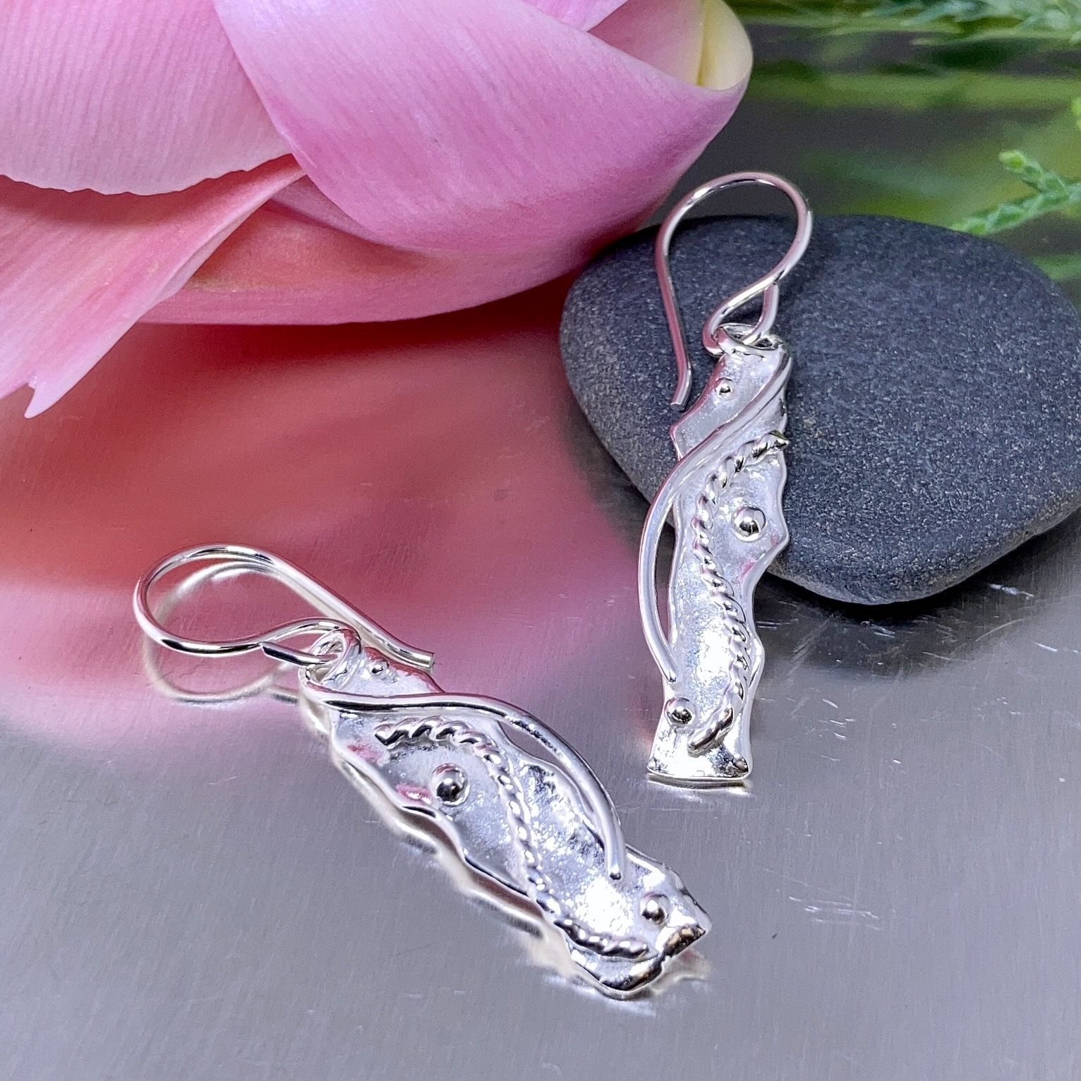 A sheet of Argentium silver that I gently melt the edges. Then silver pebbles and waves are fused on.  This earring is a small rectangle shape.