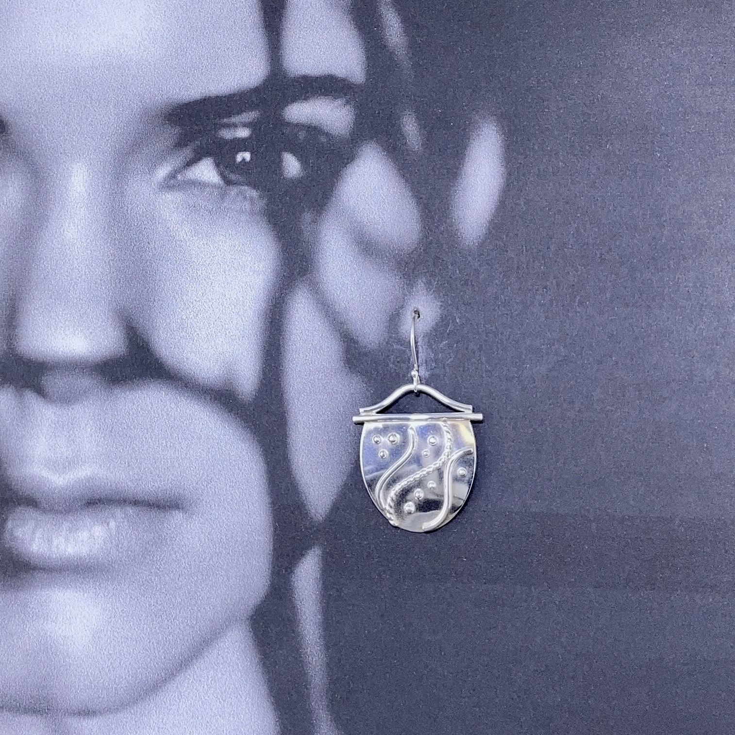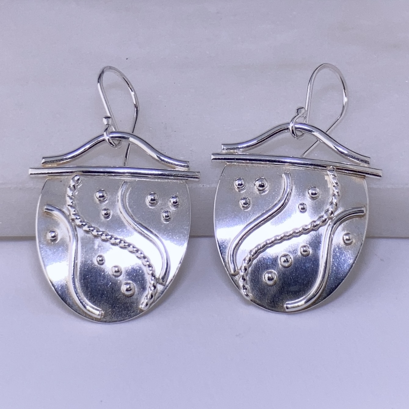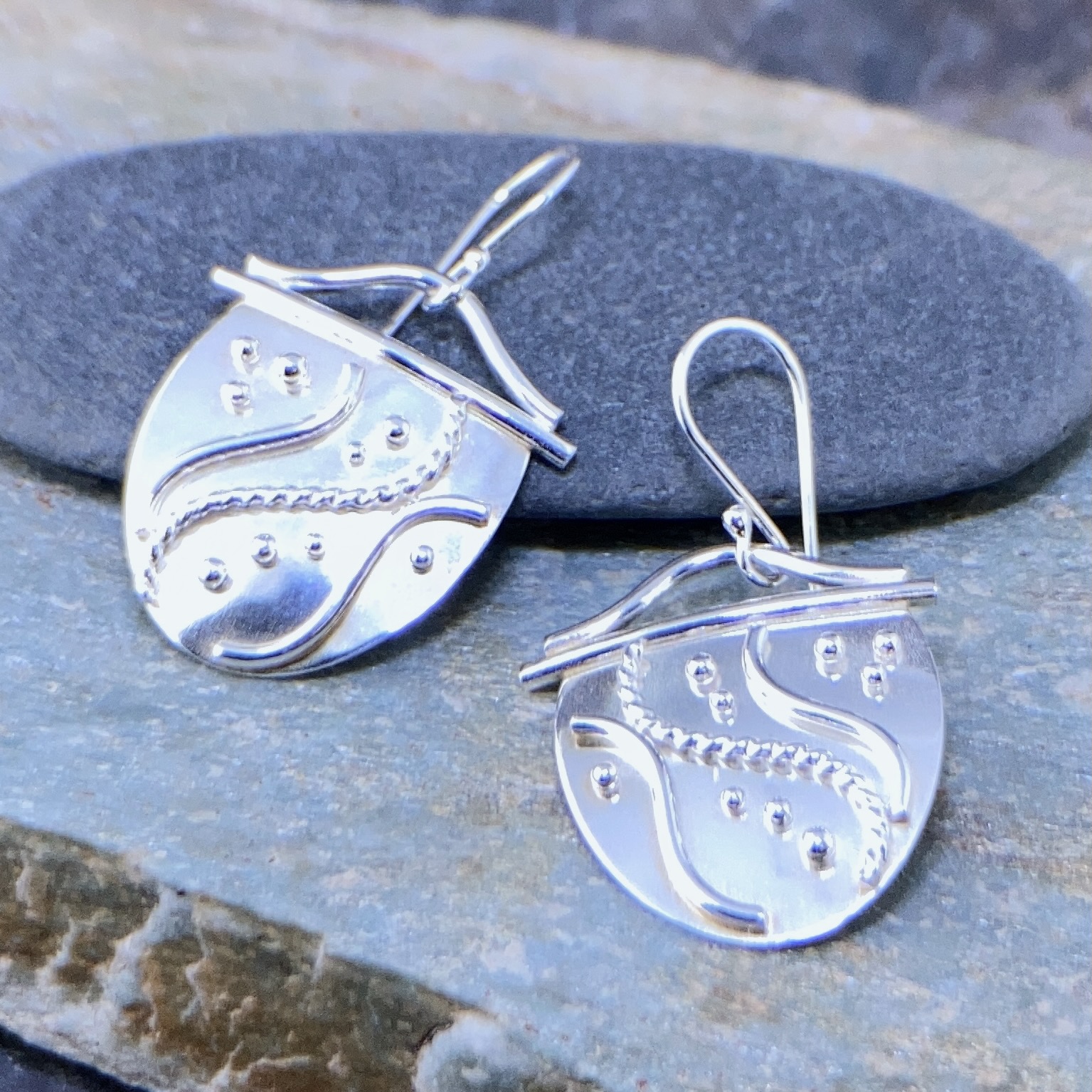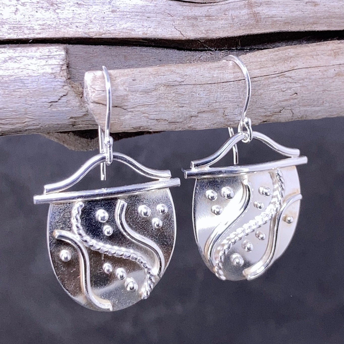 Water design earrings with a solid wave on top and granules and waves as details.  Handmade each time so always different.