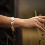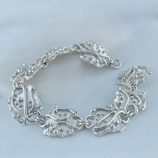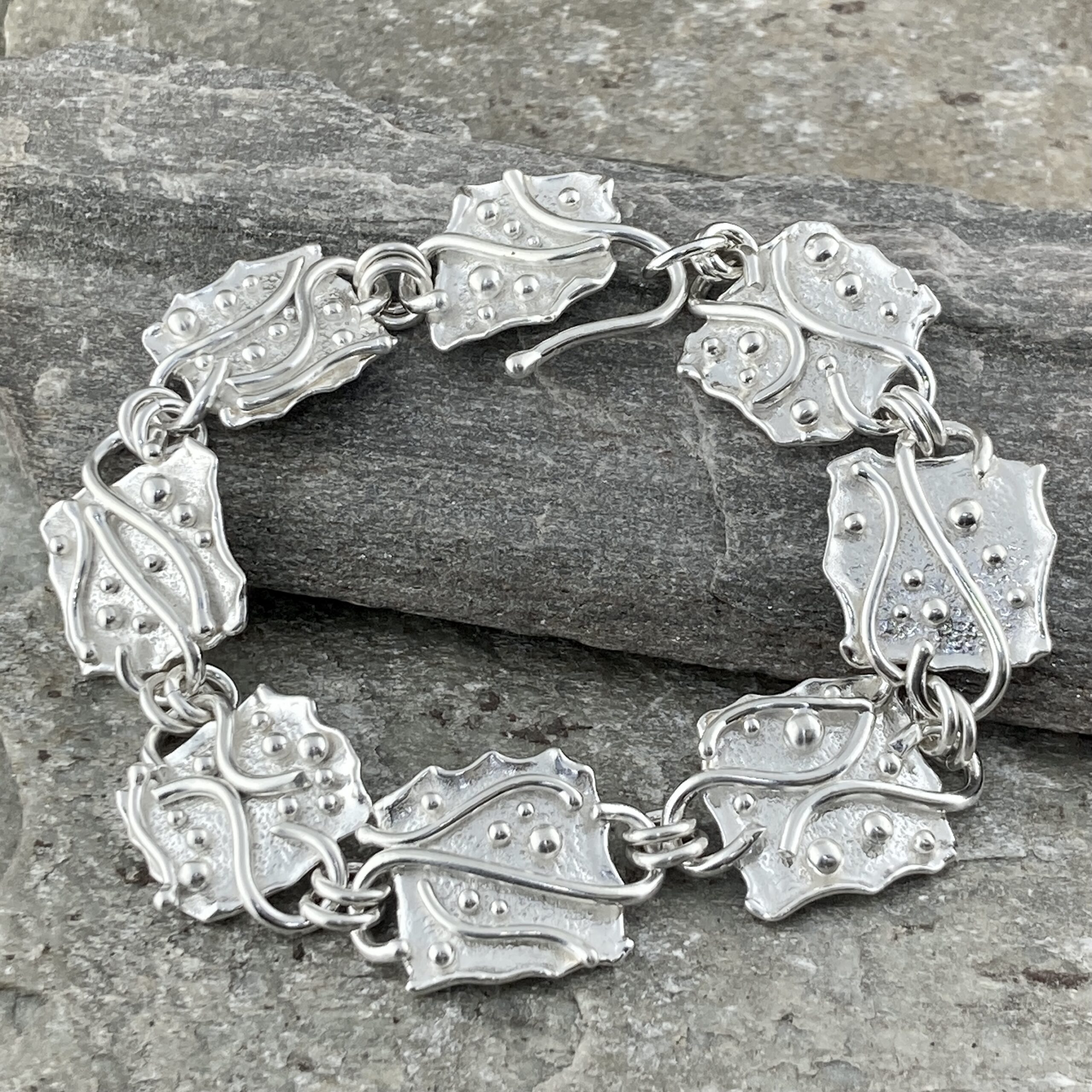 I begin by texturing Argentium silver, then shape and fuse the edges until they roll like water meeting sand. Next, I add wave lines and small granules to suggest pebbles and splash marks. Because I fuse each element by hand, every panel shows a unique pattern. The integrated links and doubled jump rings add durability while keeping the bracelet drape smooth and balanced.