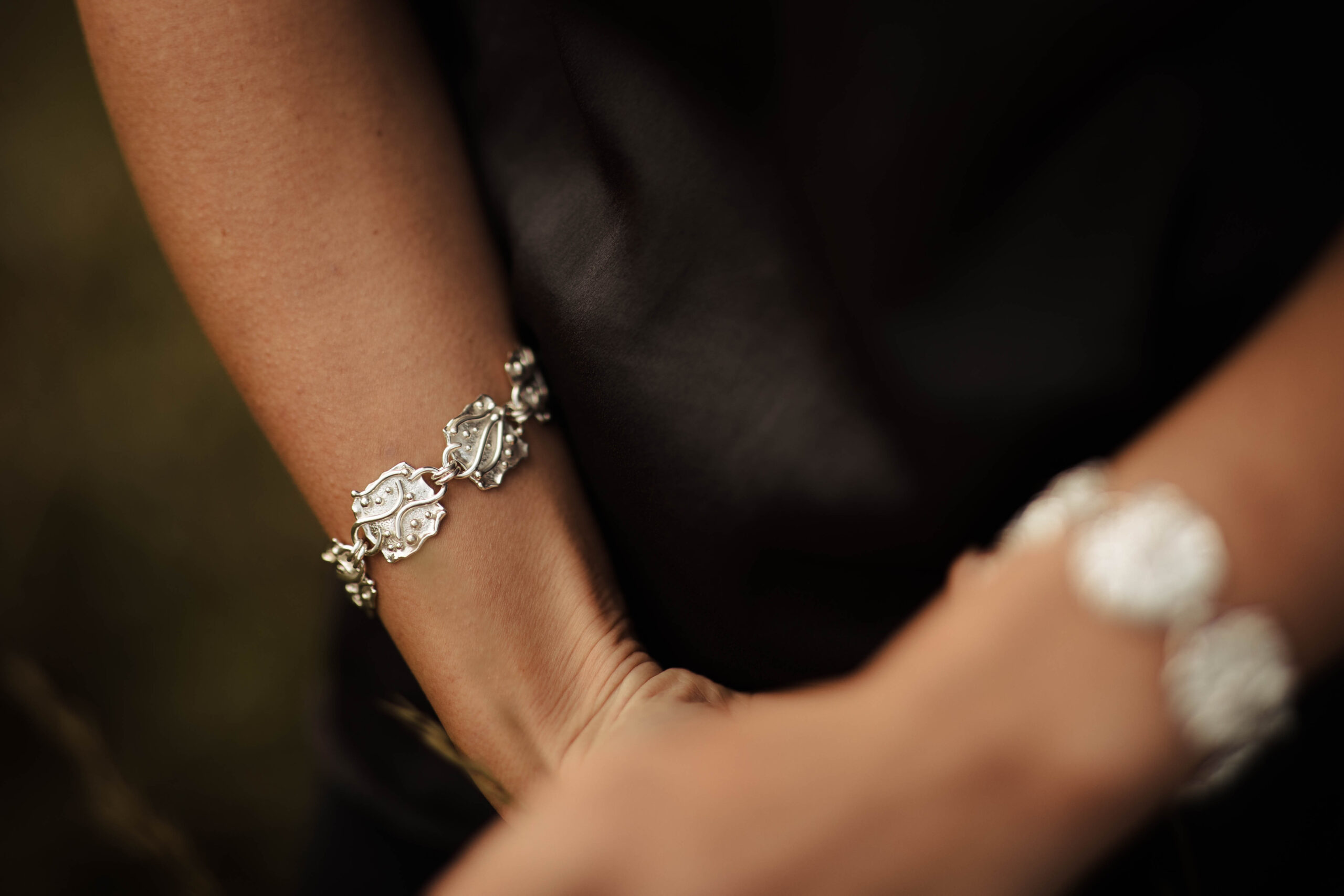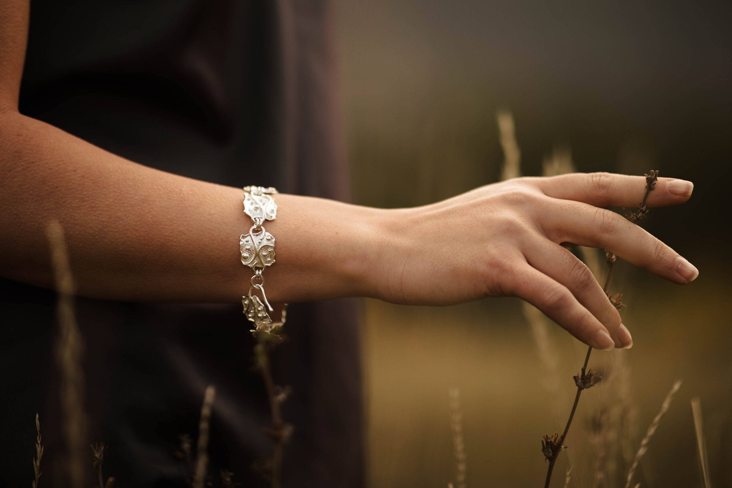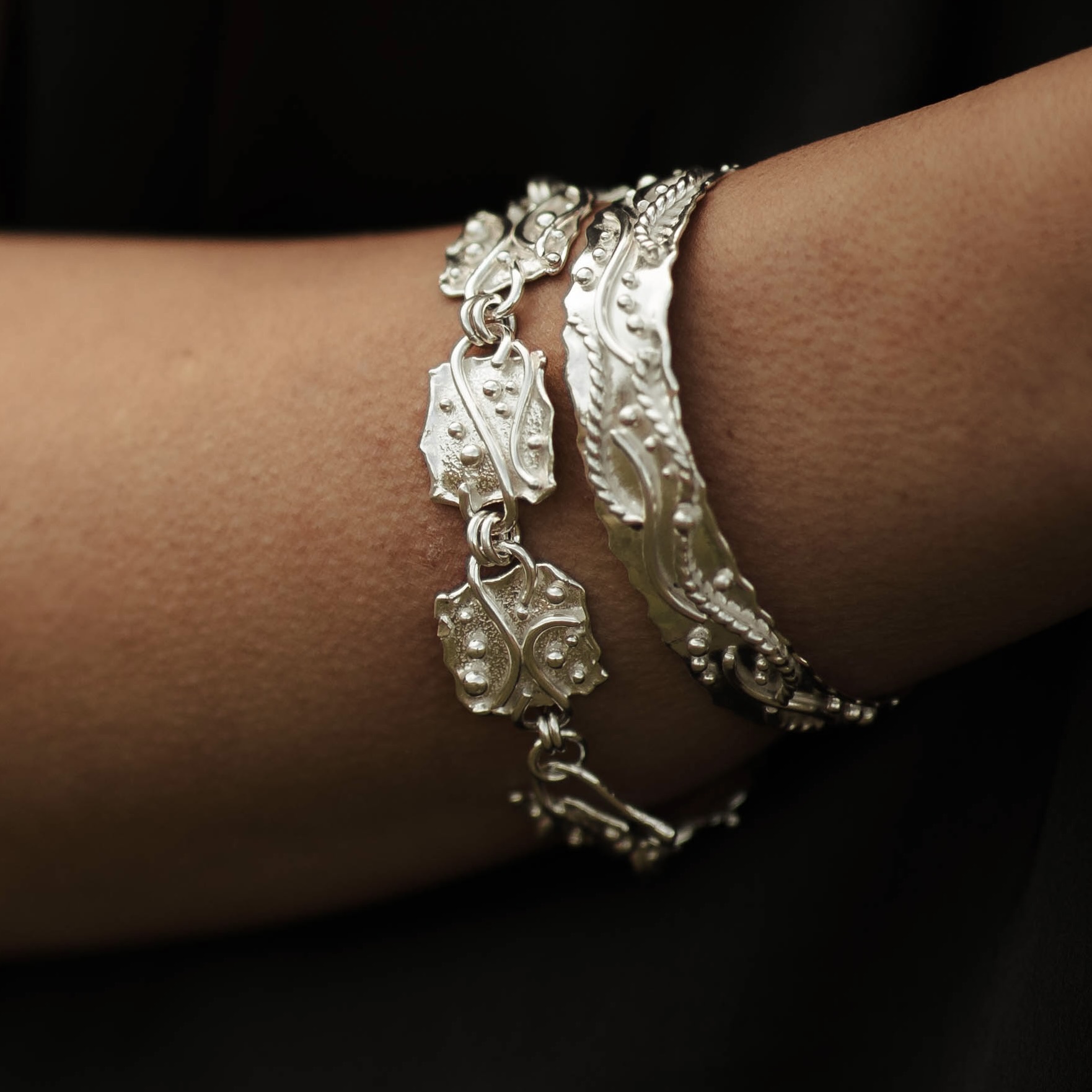 Each bracelet is cut, fused, edged, linked, and finished completely by hand in my Creston, BC studio. I heat-harden the silver to bring germanium to the surface, which further slows tarnish and adds a clean, white sheen.