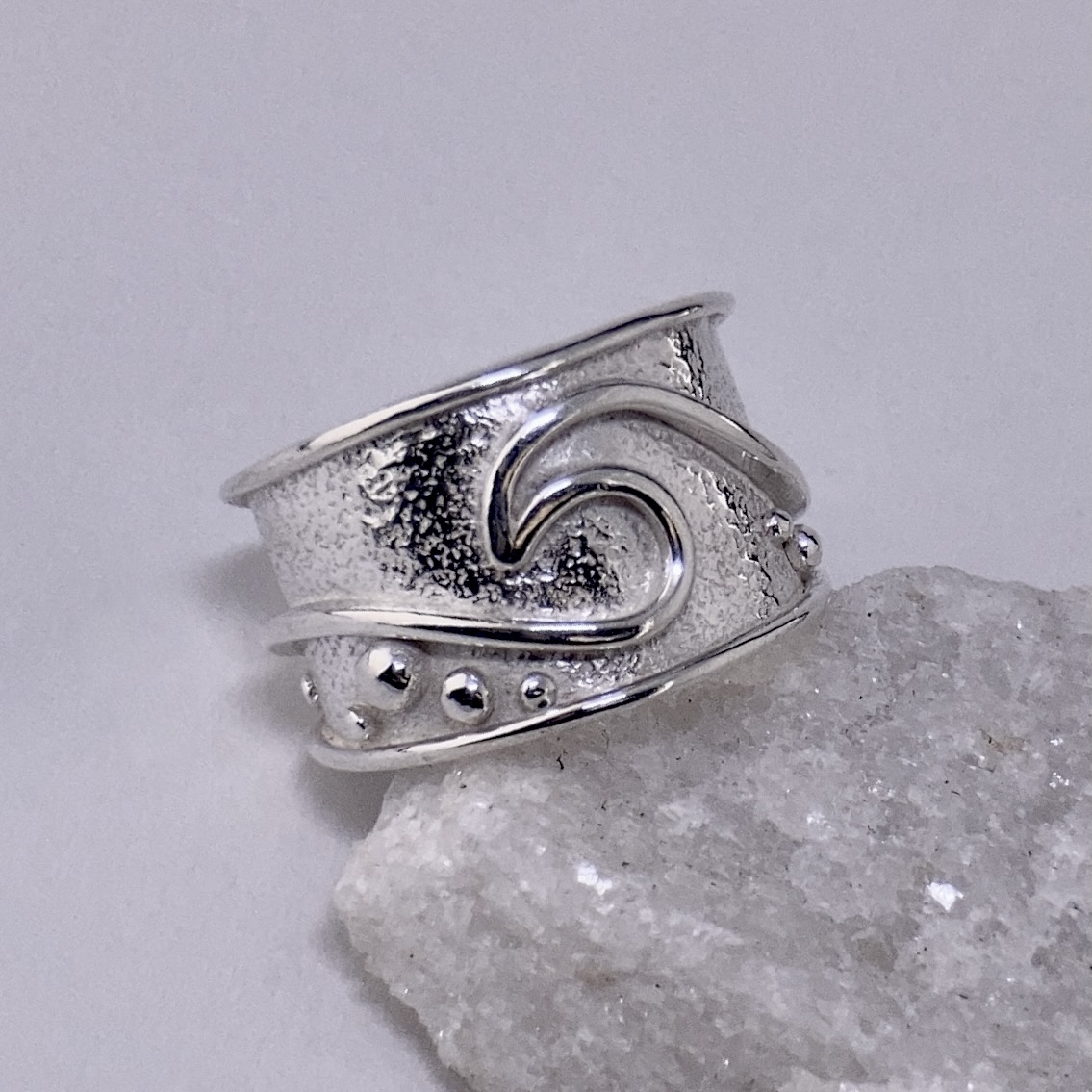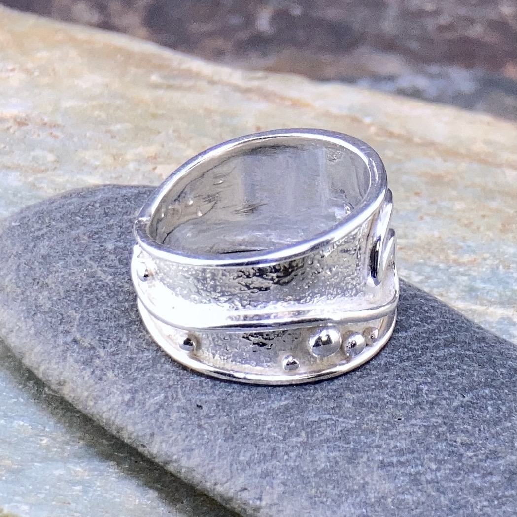 Argentium silver fused with granules and one large wave. This band has a clean, finished edge.