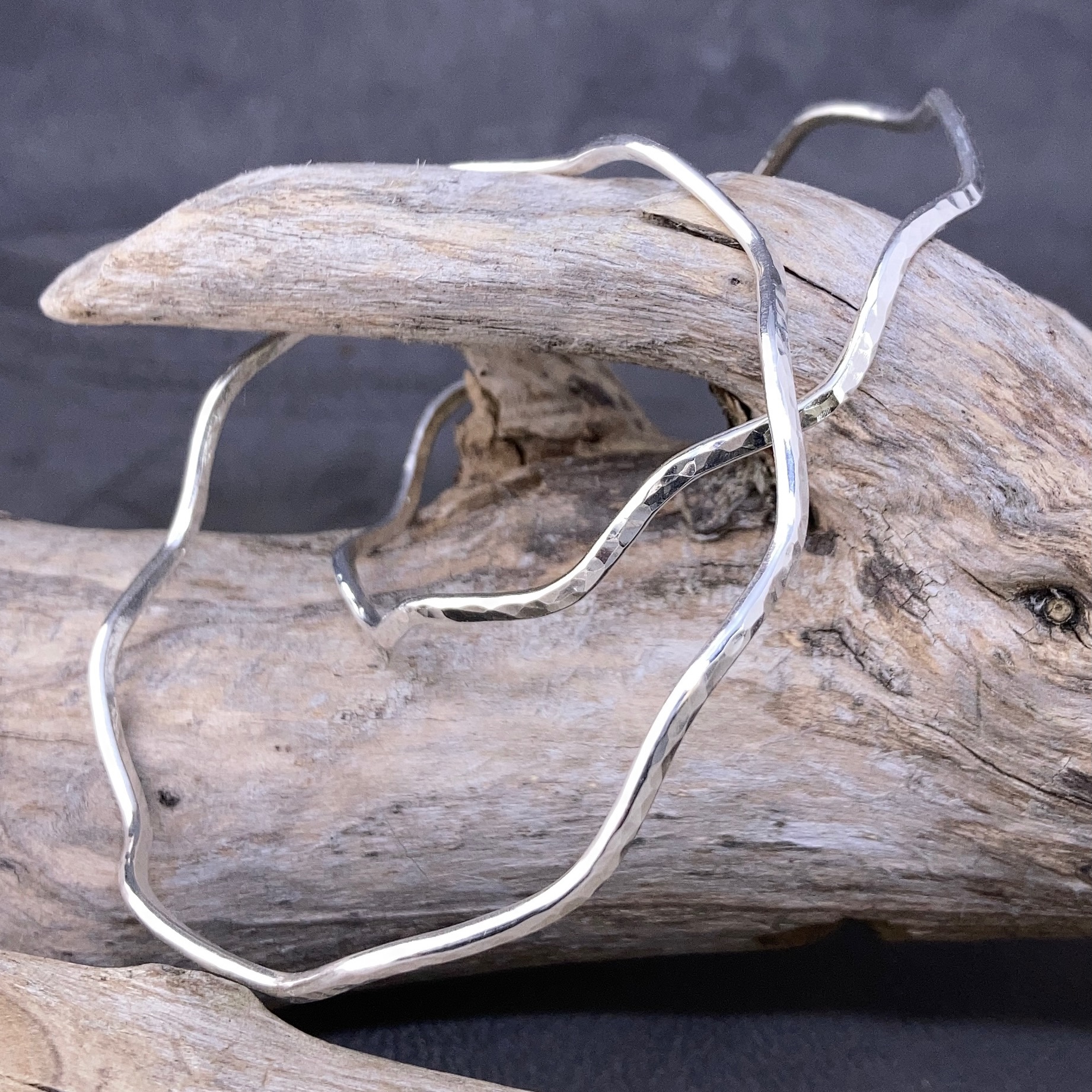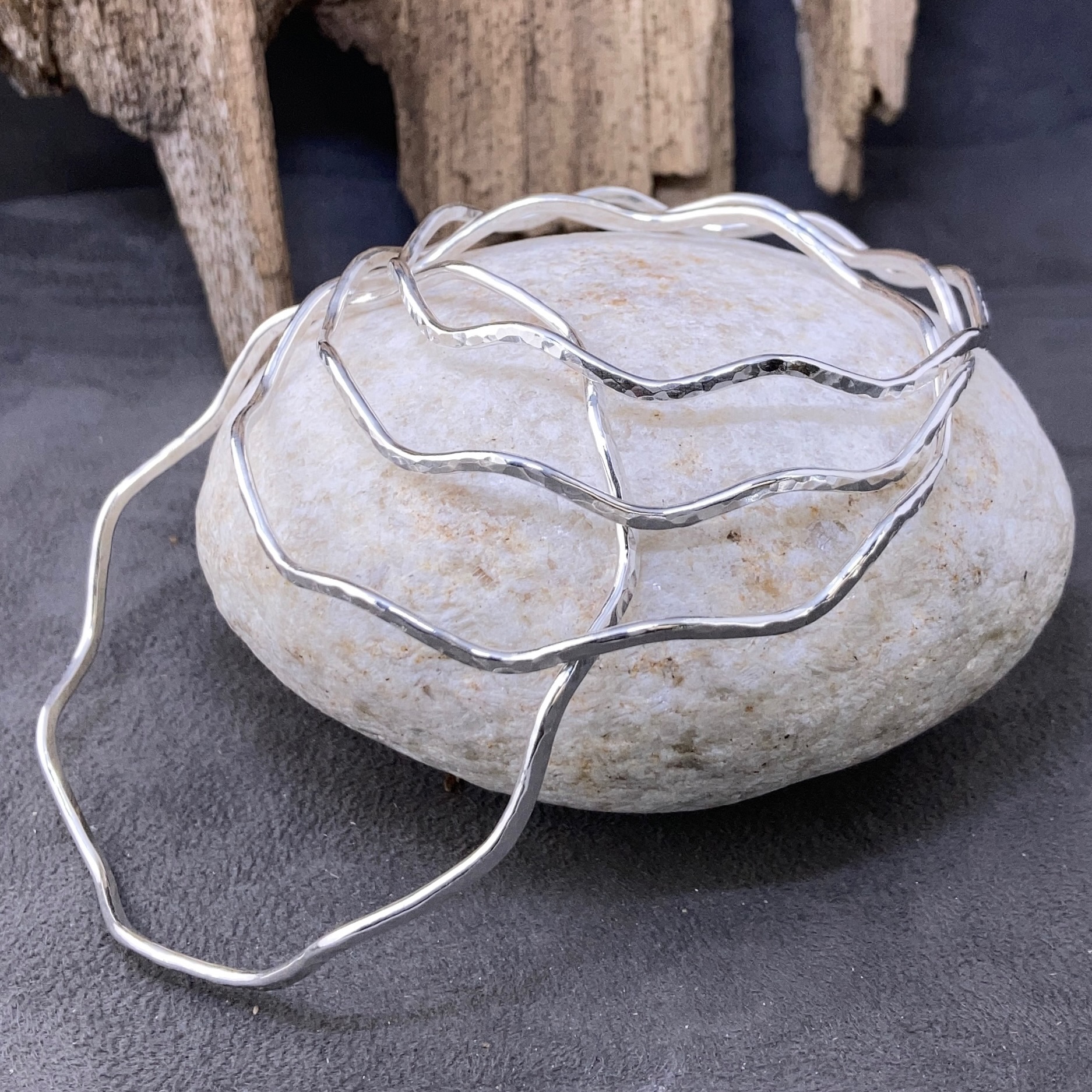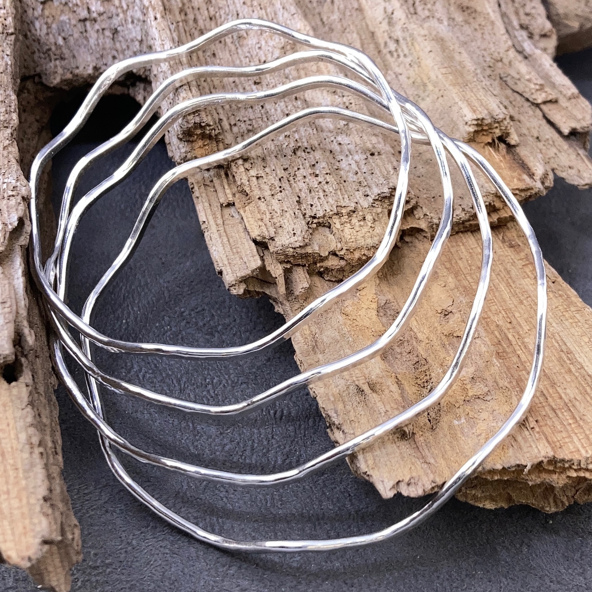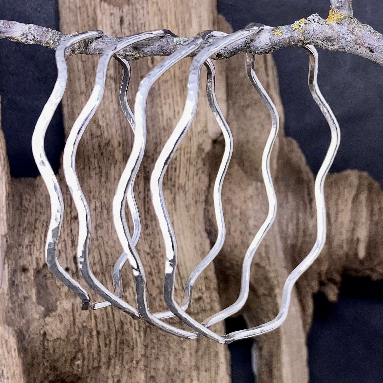 First, we forge each Argentium wire by hand to create the wave pattern. Next, we refine the curves and shape the bangle into a smooth circle. Then, we work-harden the silver to give it strength and lasting form. Finally, we polish the surface until it gleams. As a result, every bangle shows its own handmade flow and personality — fluid, luminous, and alive.