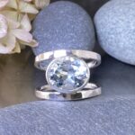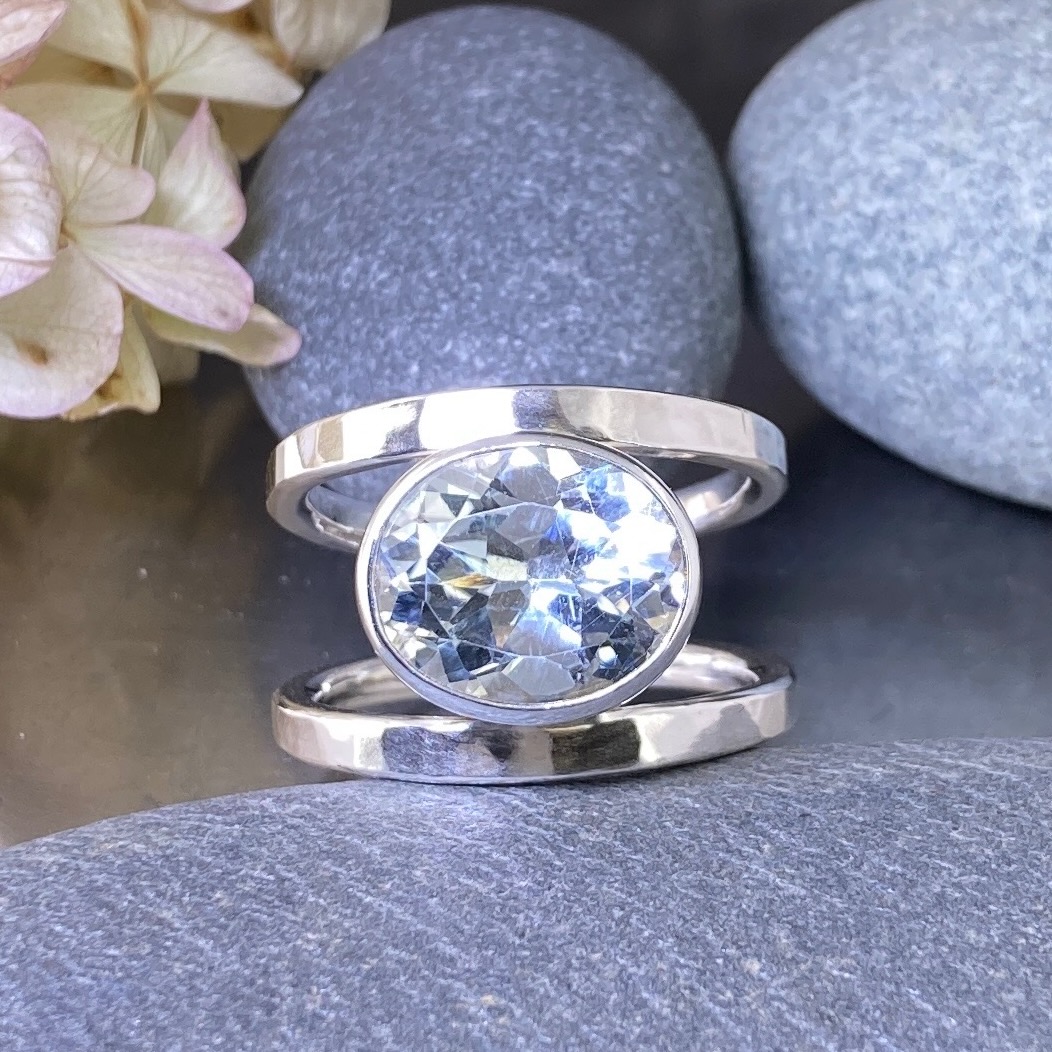A bold Round Double-Band ring designed for balance and comfort. The 9.5 carat oval White Topaz is nestled securely between two solid Argentium silver bands. Each band is hammered flat for added sparkle and a bright, clean profile. The wide front supports the large stone, while the narrower back ensures a comfortable fit.